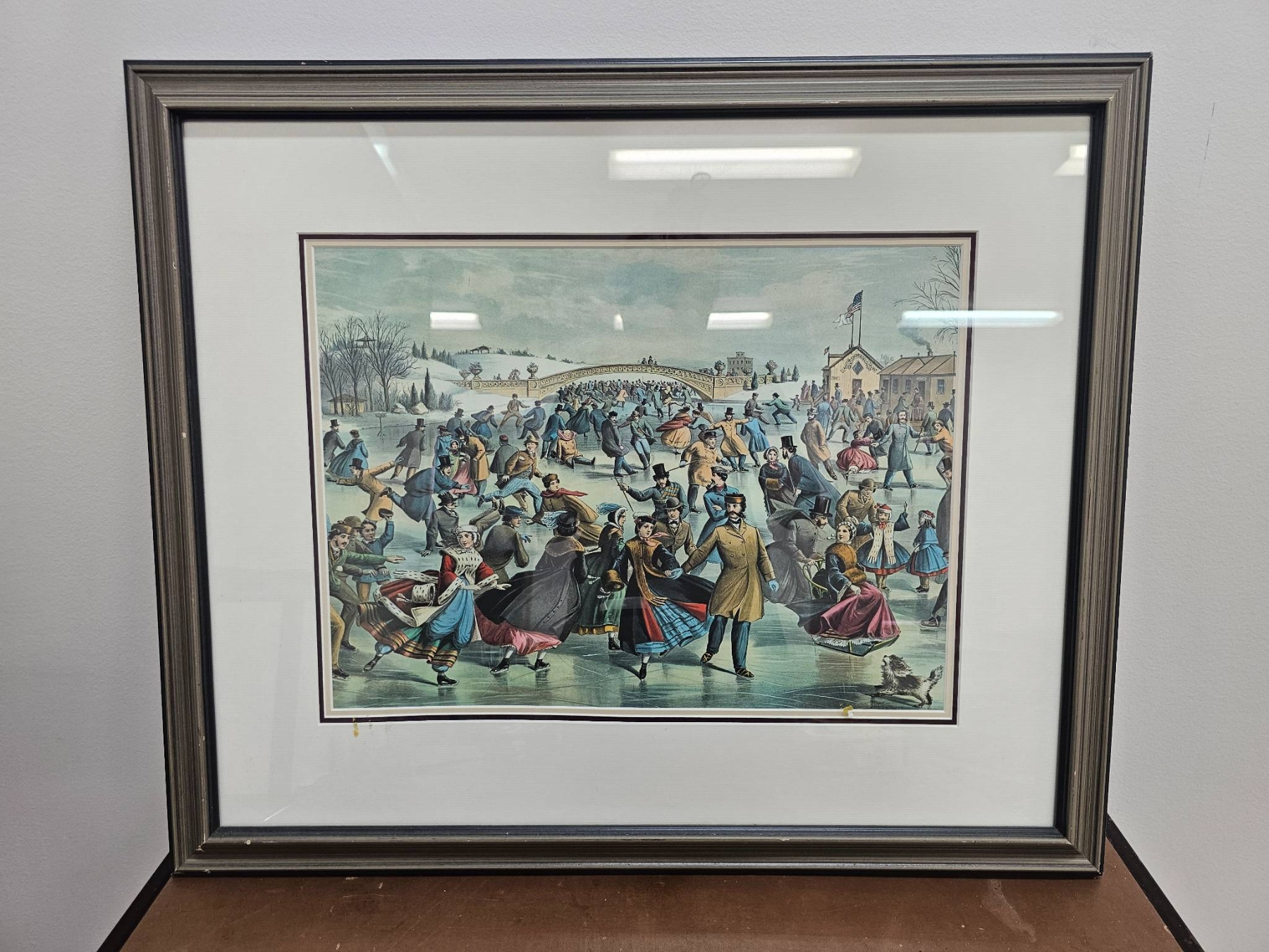 A framed print depicting a lively ice skating scene, showcasing richly dressed figures enjoying a winter outing. The artwork measures 23 x 28 inches and is framed with a metallic-toned border, ready to display. Perfect for adding a touch of vintage charm to any room or collection.