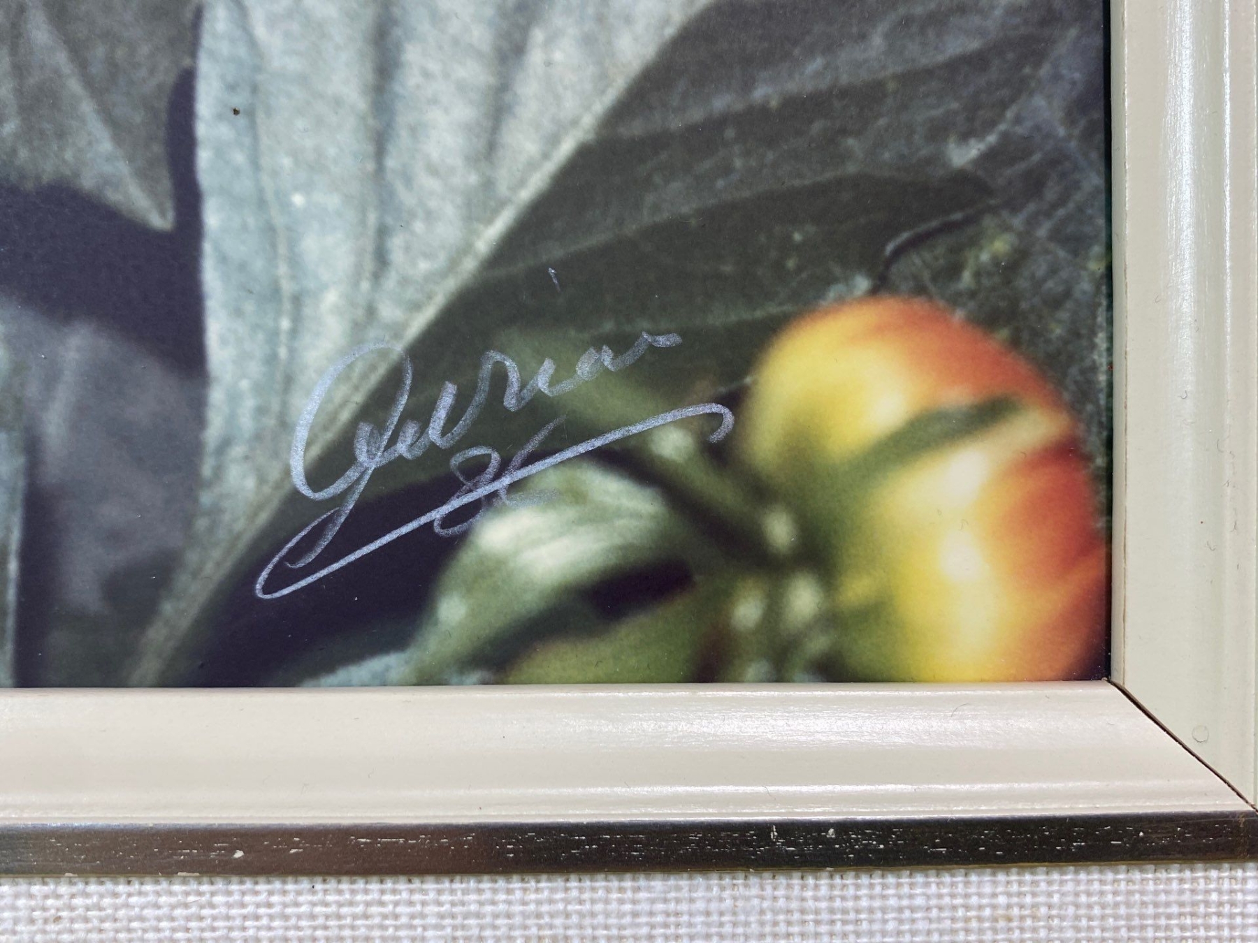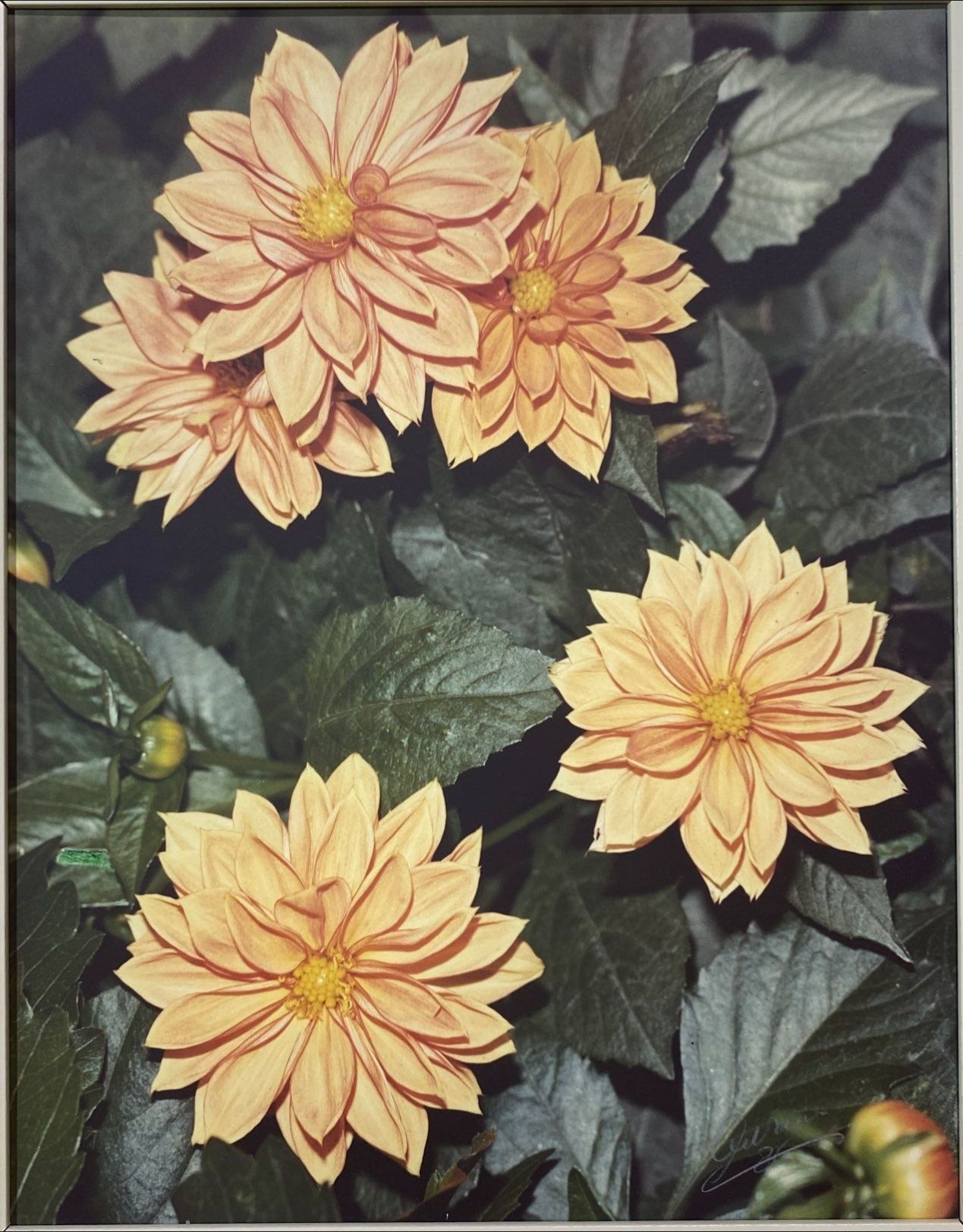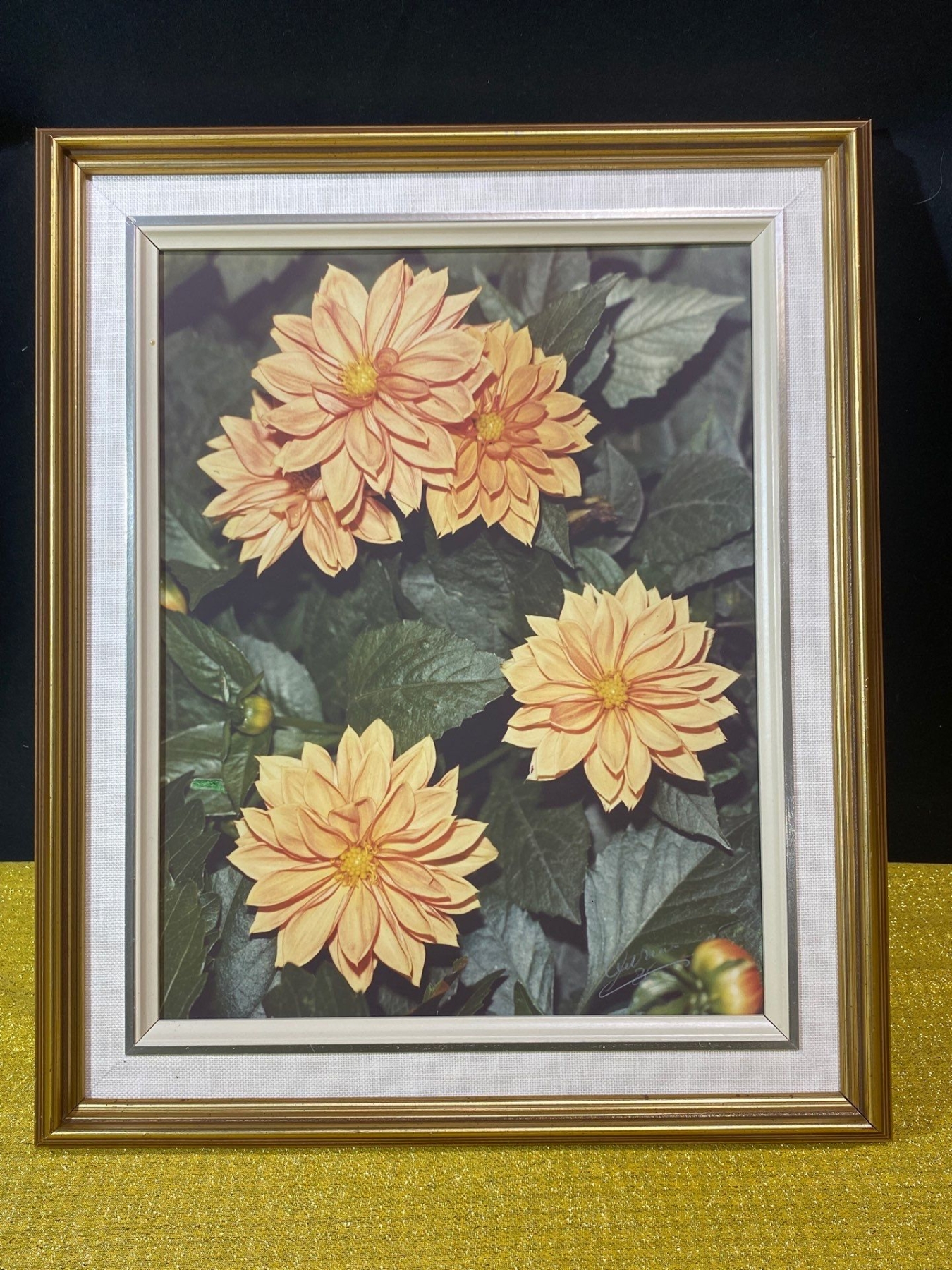 This framed image captures a vibrant bouquet of apricot-orange dahlias in full bloom, rendered with rich color and exquisite detail. The composition highlights the flowers’ lush petals and natural elegance, creating a lively yet graceful display. Signed by the artist, this work is perfect for collectors of floral art or anyone seeking a striking, decorative piece.