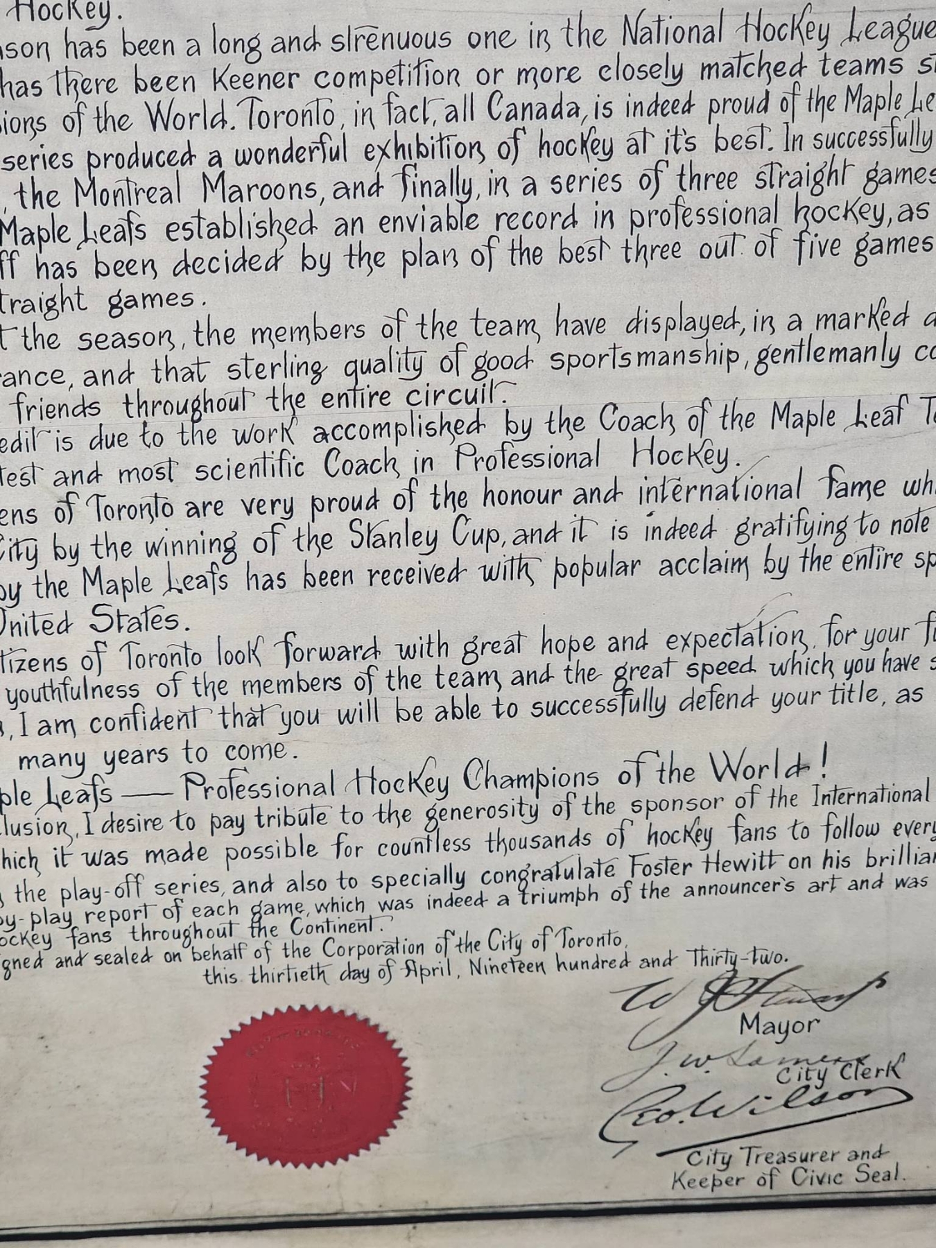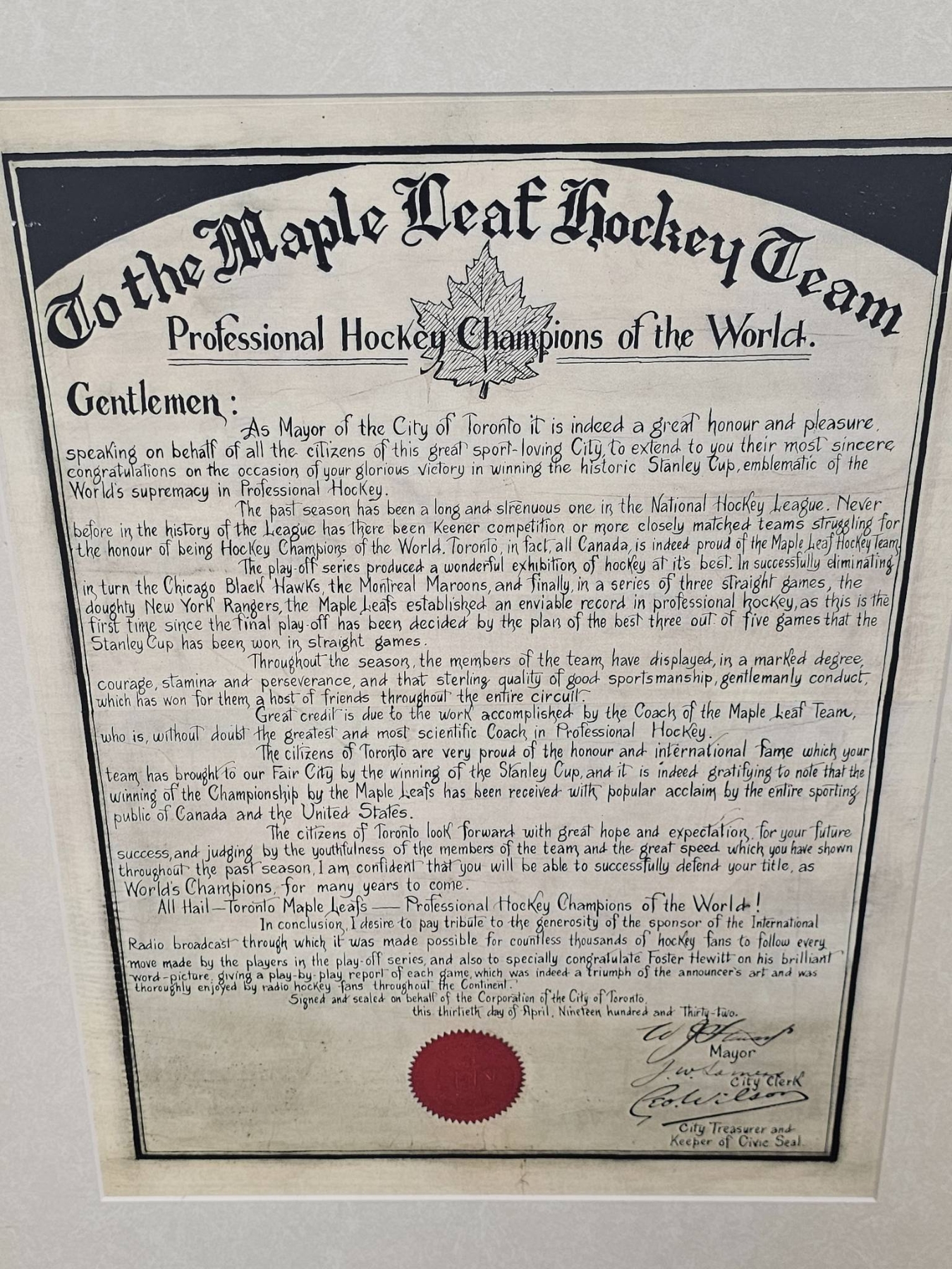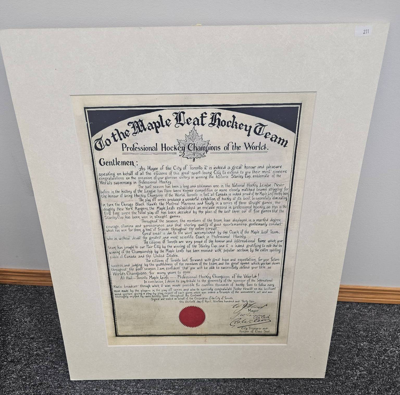 Framed commemorative certificate honoring the Maple Leafs hockey team as Professional Hockey Champions of the World. The document features detailed text, a red seal, and official signatures at the bottom. Dimensions are 20" x 25" including the frame, with a classic mat board surrounding the certificate. Ideal for hockey fans or collectors of sports memorabilia.
