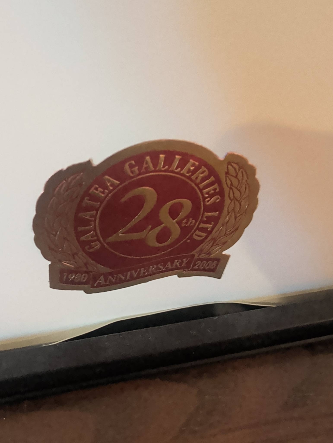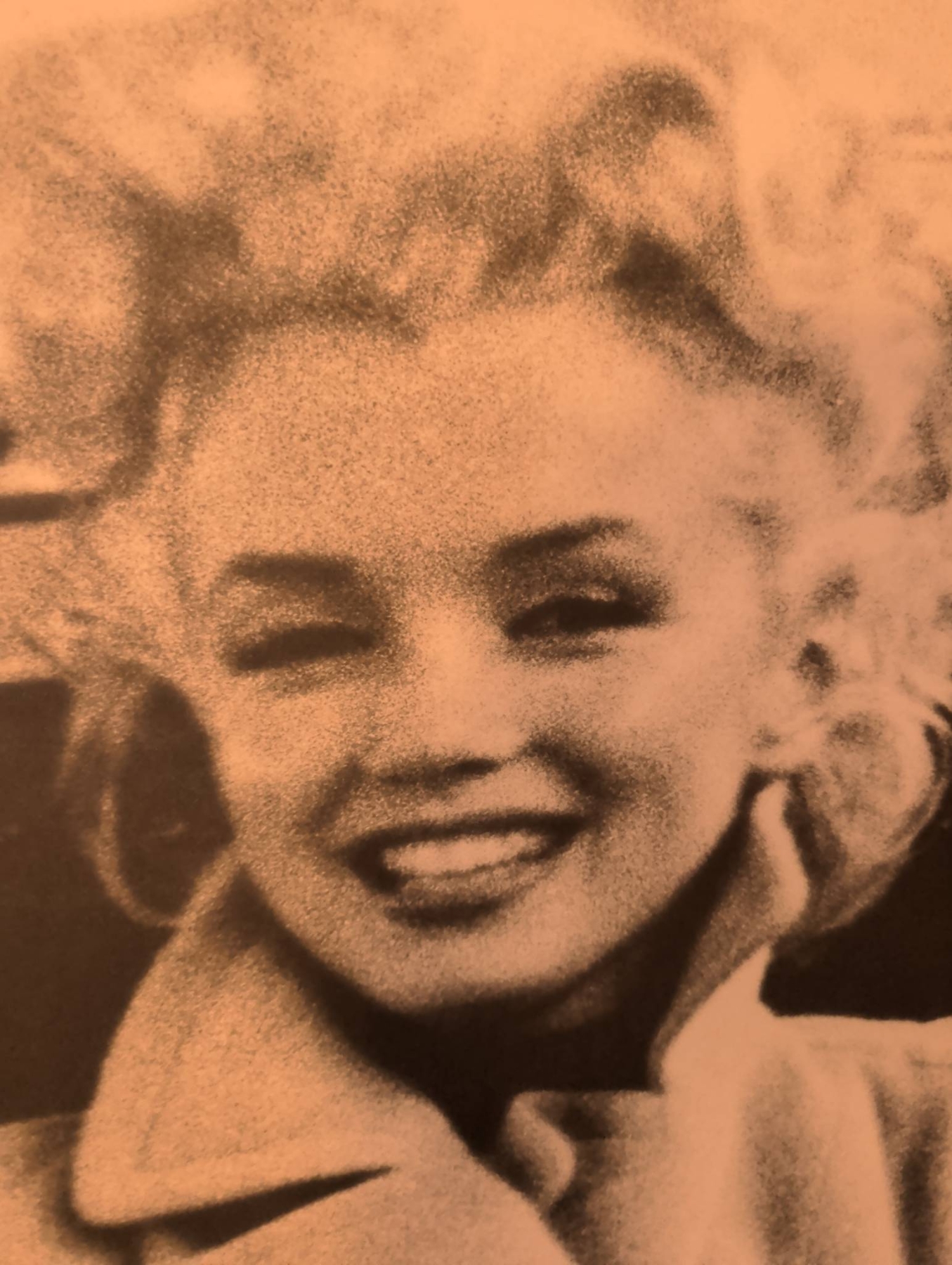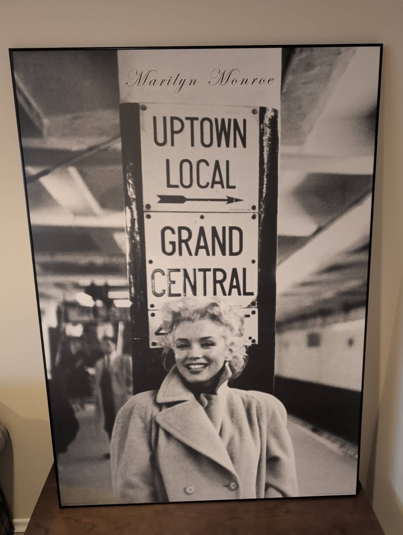 Framed artwork featuring Marilyn Monroe in front of a subway sign reading ‘Uptown Local Grand Central.’ Produced by Galatea Galleries Ltd for their 28th anniversary, as indicated by the seal on the reverse. The black and white piece is set within a black frame. Dimensions are 42 inches in height and 30 inches in width, making it a sizable statement piece for any wall.