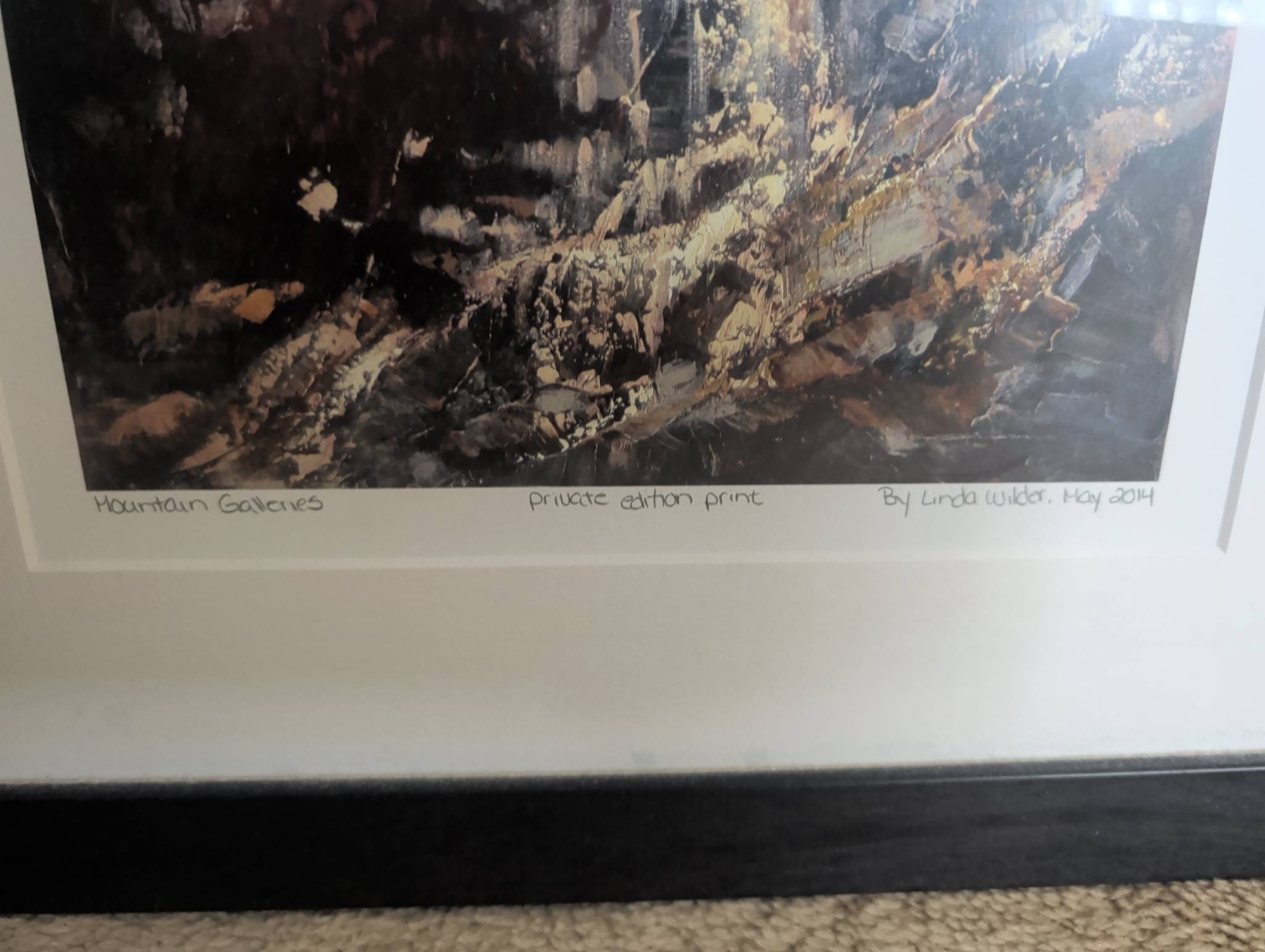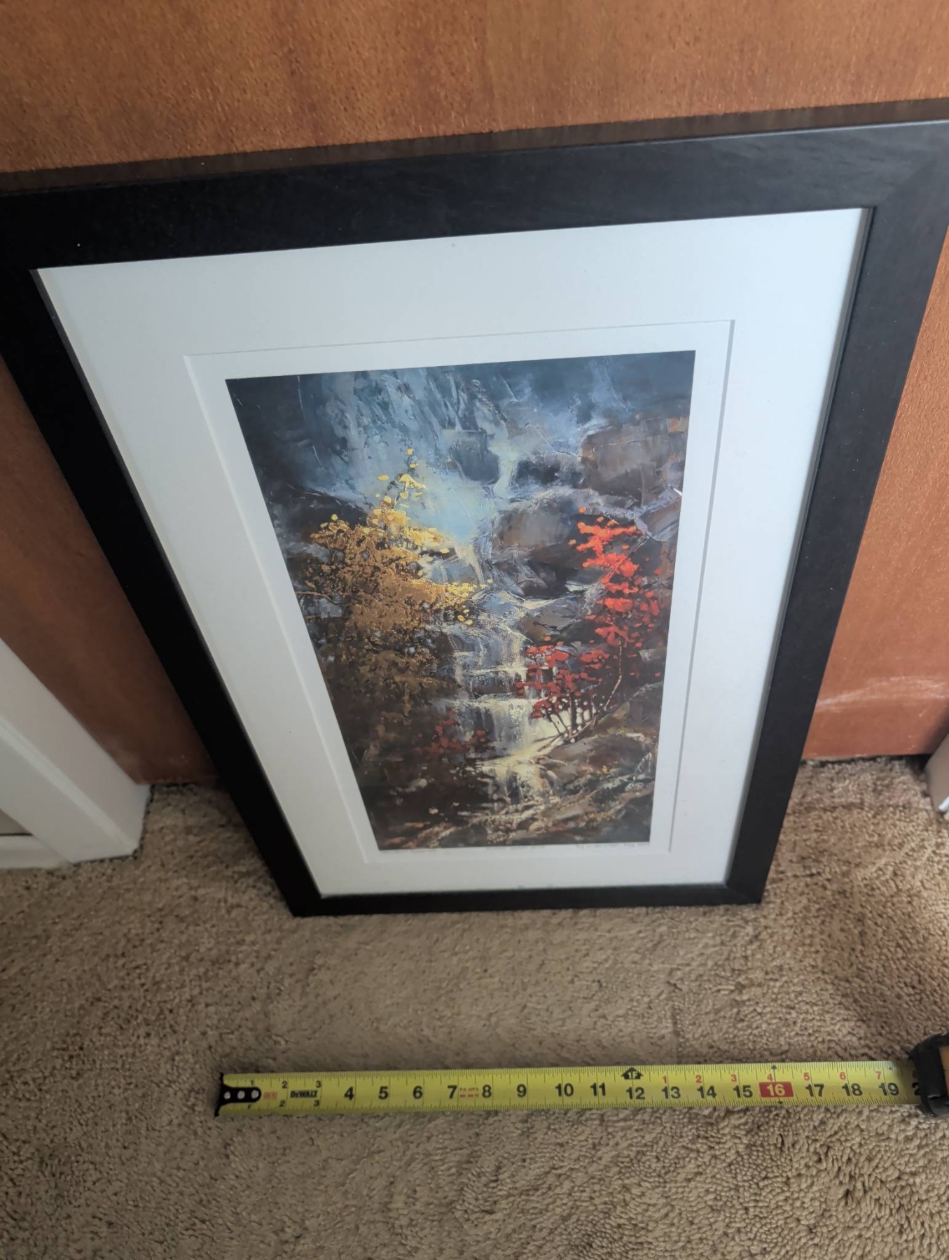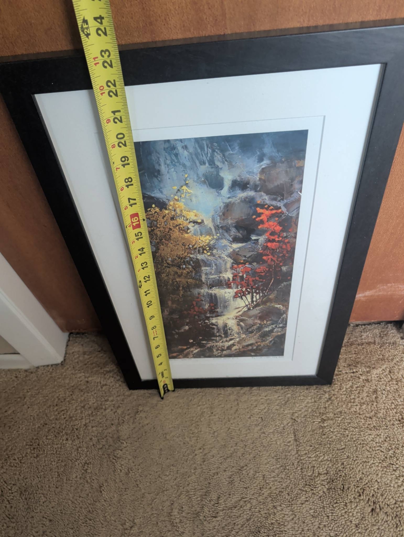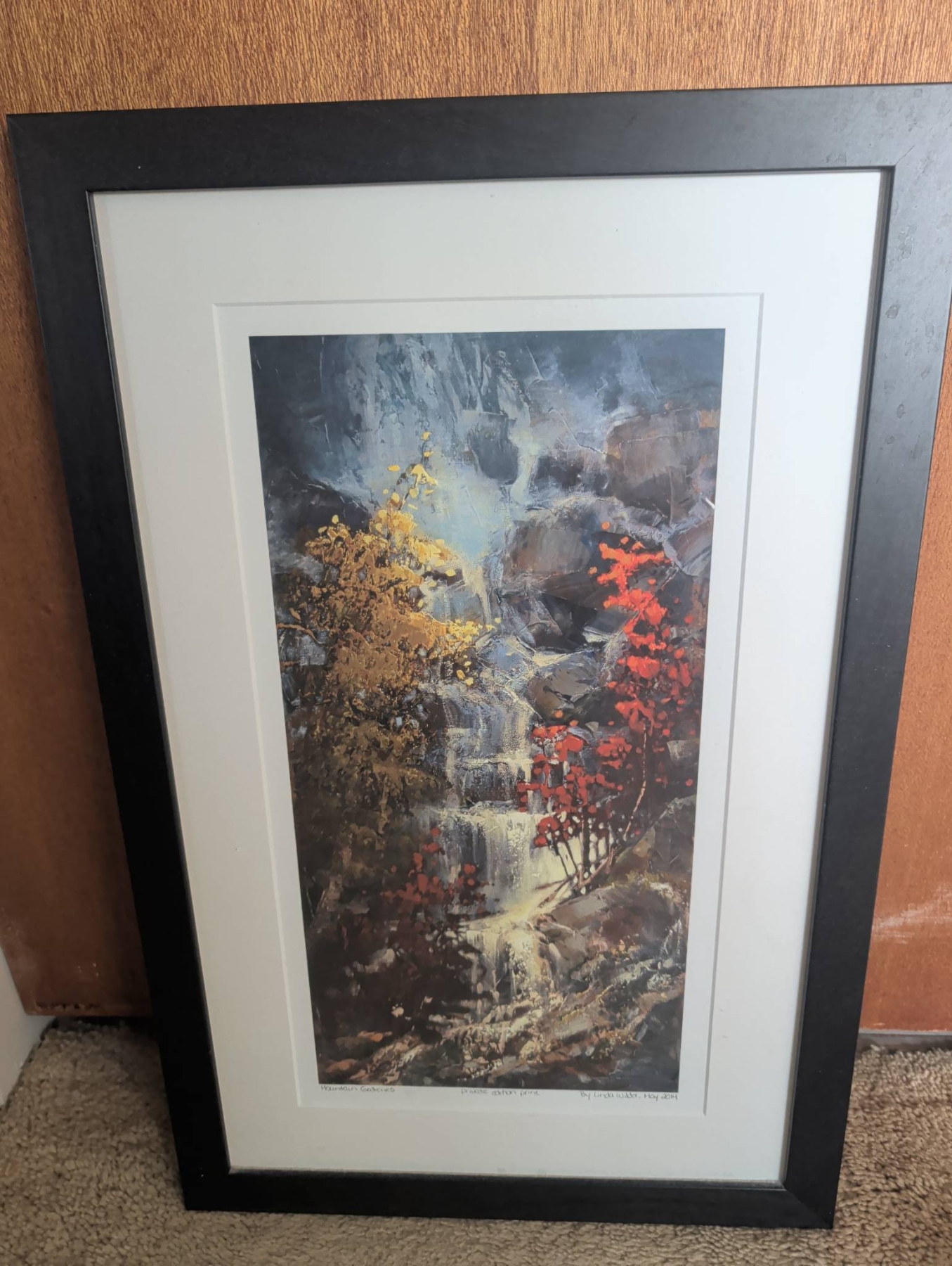 Framed limited edition print titled ‘Mountain Serenity’ by Linda Taylor, dated May 2011. Featuring a vibrant landscape with golden trees, cascading water, and deep red foliage, it is professionally matted and encased in a sleek black frame. The frame measures approximately 21 inches tall by 13 inches wide, making it a sizable yet manageable addition to a variety of spaces. Includes back mounting hardware for easy hanging.
