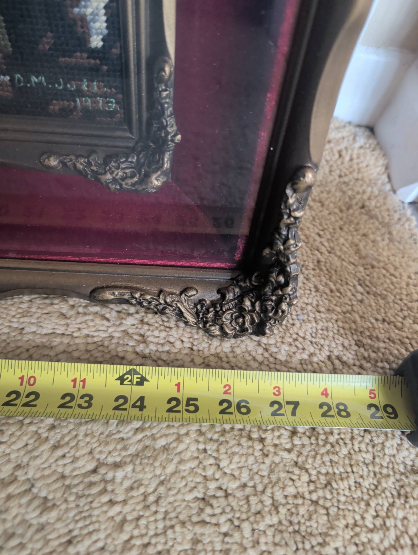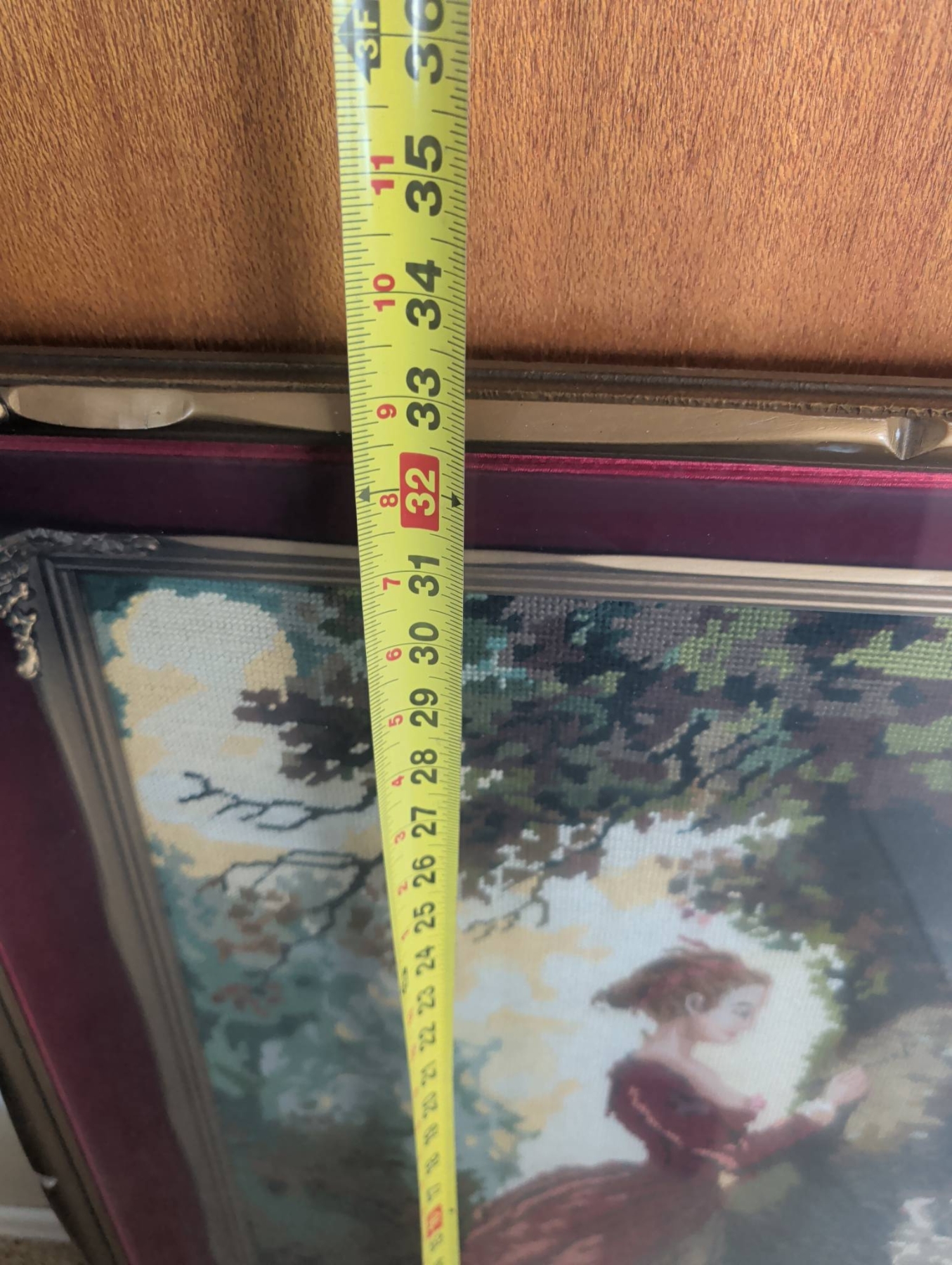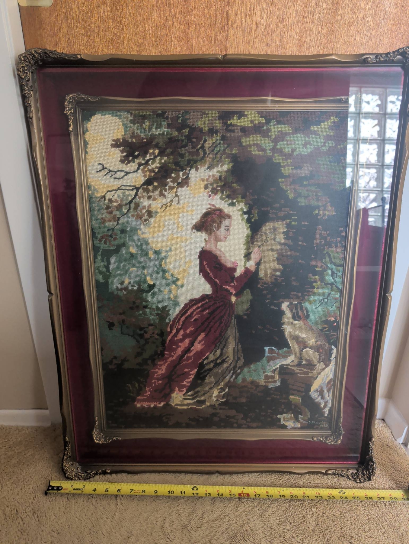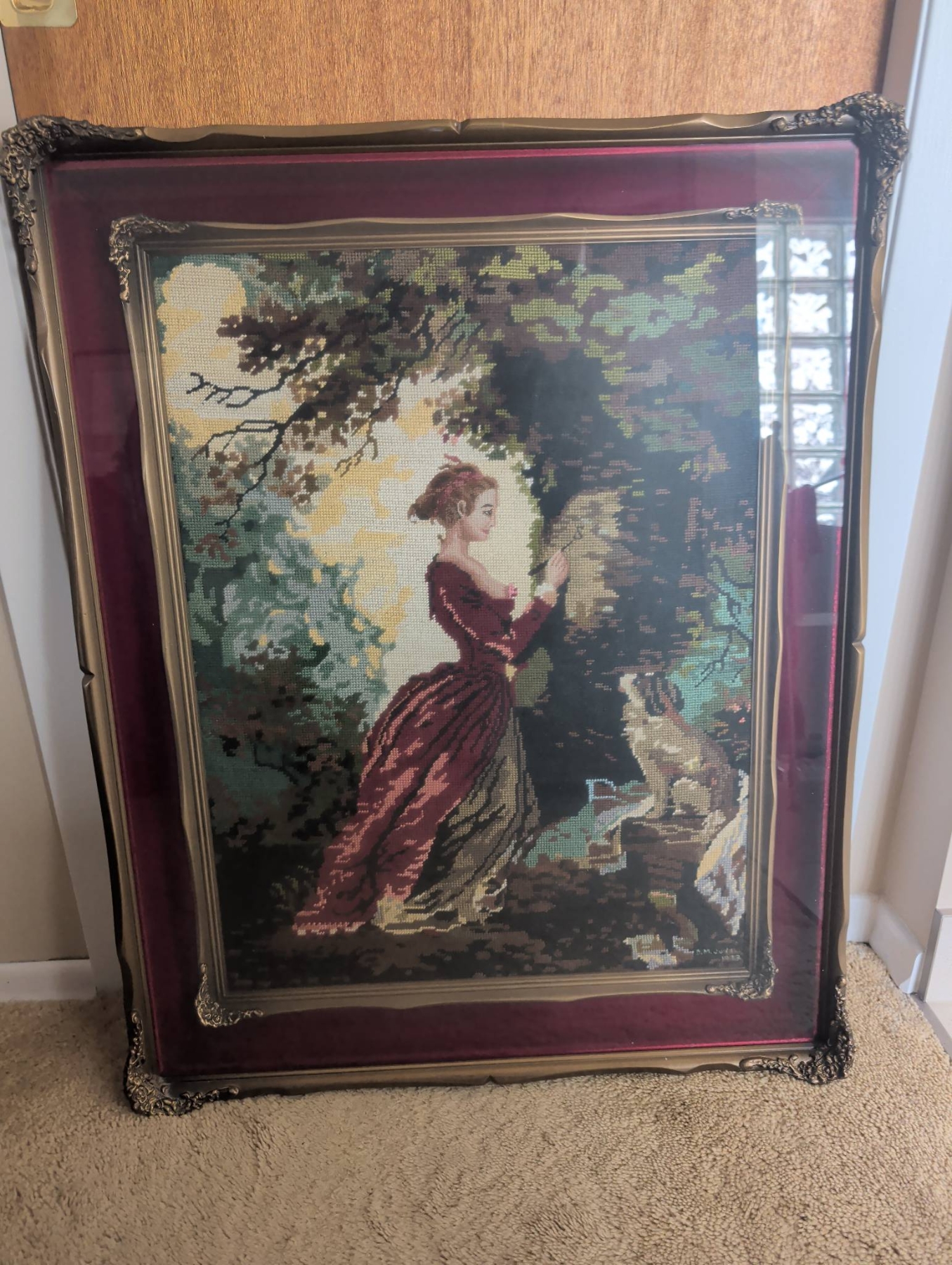 Framed needlework artwork featuring a woman in period attire with a dog amidst a nature setting. The piece is enclosed in a decorative frame with ornate metal corner details and measures approximately 32 inches in height and 25 inches in width. The work is mounted on a maroon mat with gold accents. The backing shows wear but retains a hanging wire for display.