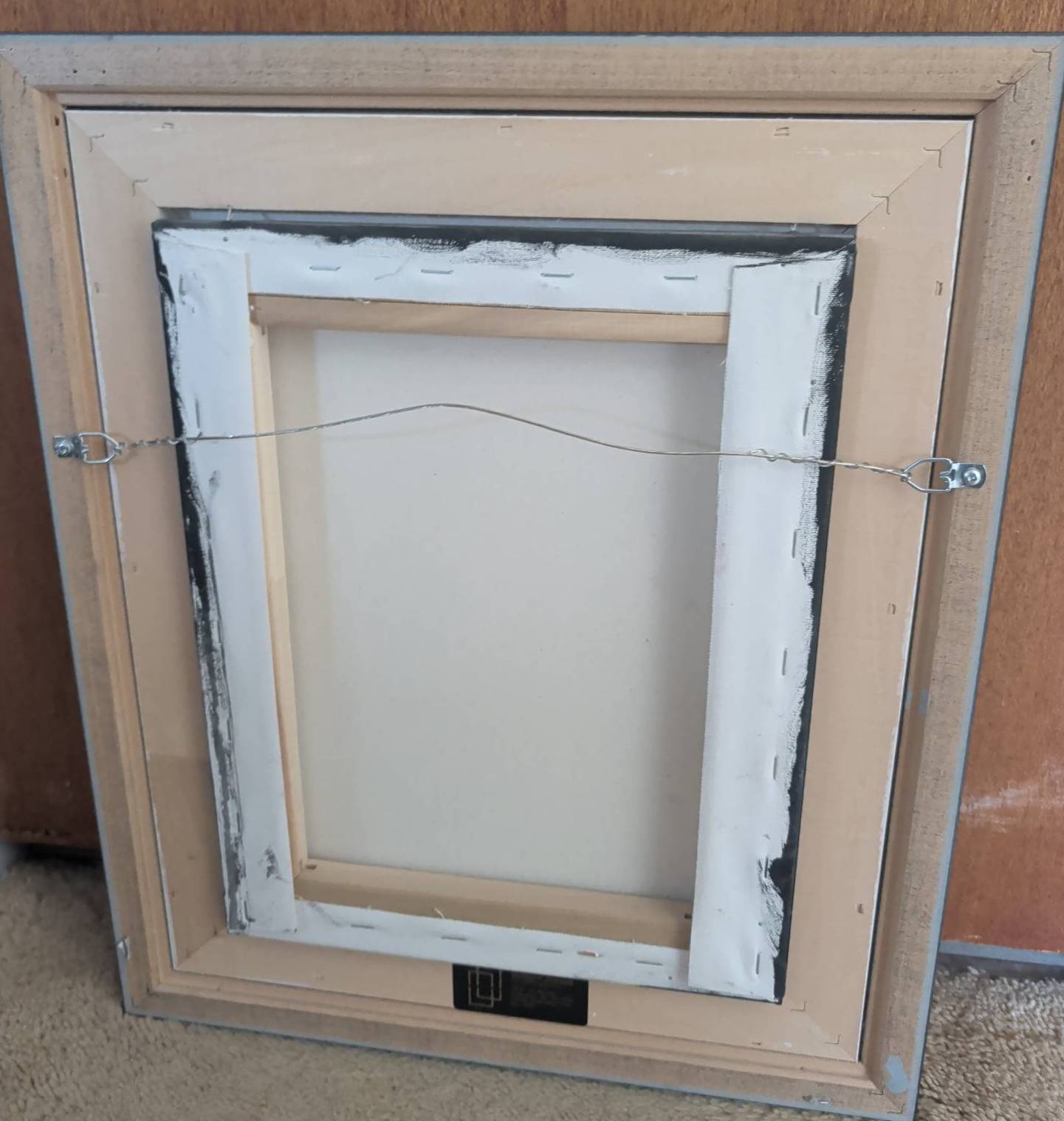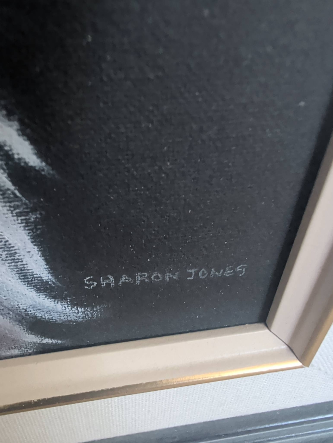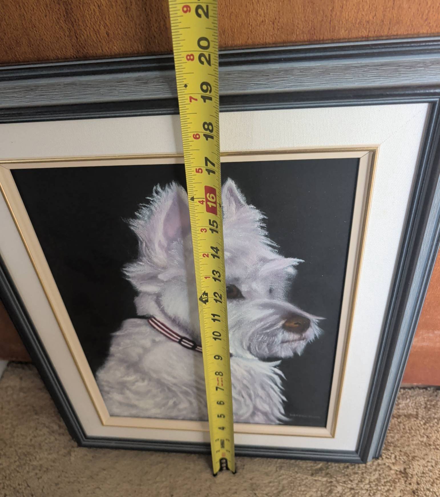 Framed portrait of a white dog, created by artist Sharon Jones. The artwork is done on a black background, signed by the artist in the lower right corner. It features a double mat and an elegantly styled gray and gold-tone wooden frame. Frame dimensions are approximately 22 inches tall and 19 inches wide. Wire backing is included for easy hanging, making it ready for display.