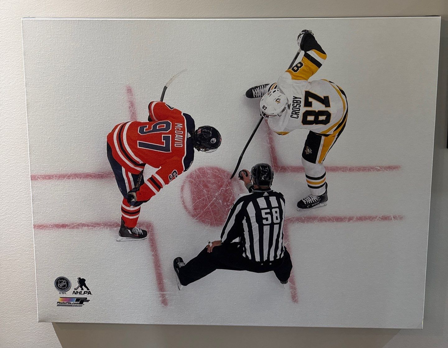 Framed Canvas Print Featuring NHL's Connor McDavid & Sidney Crosby During A Face-Off