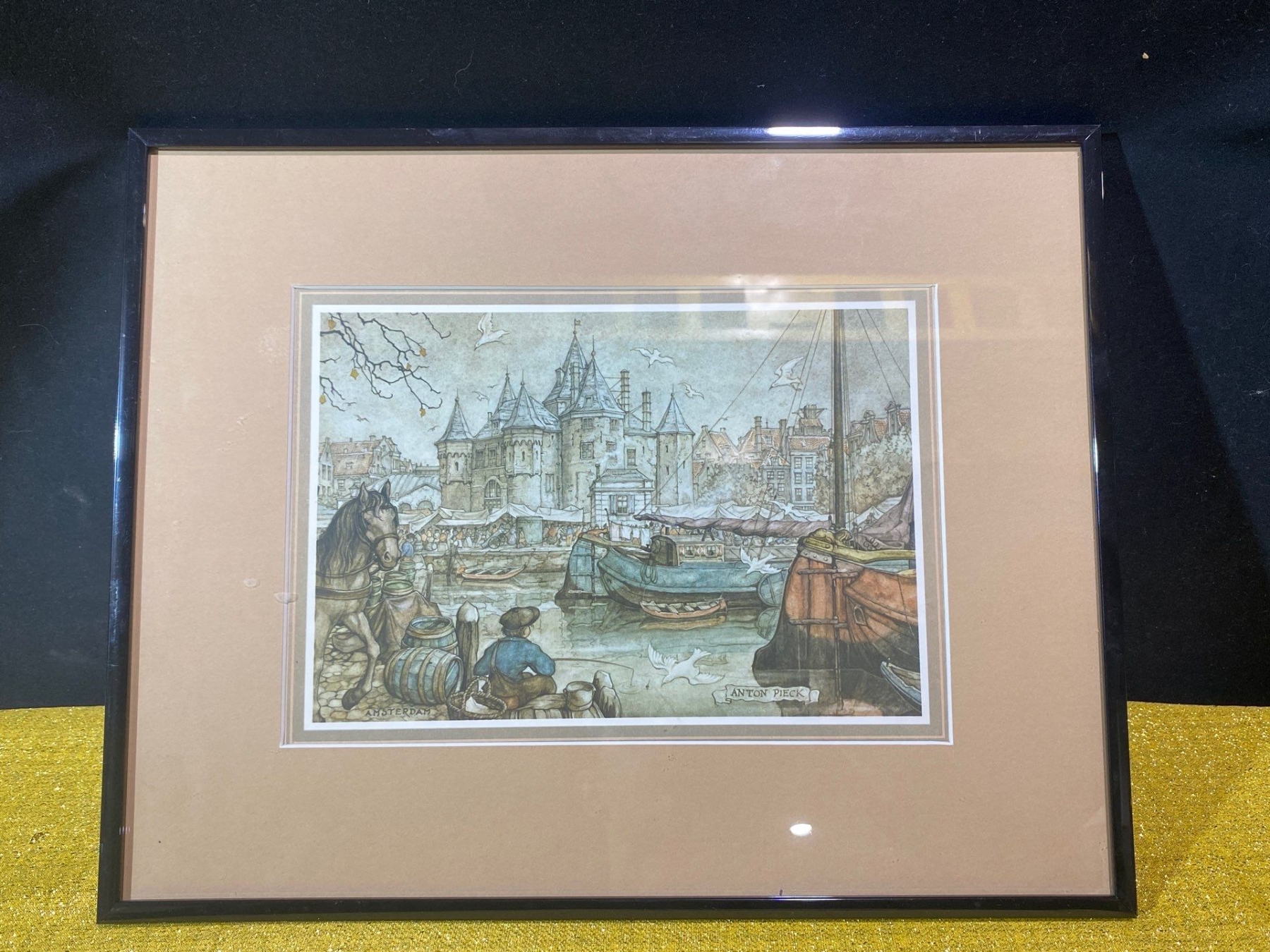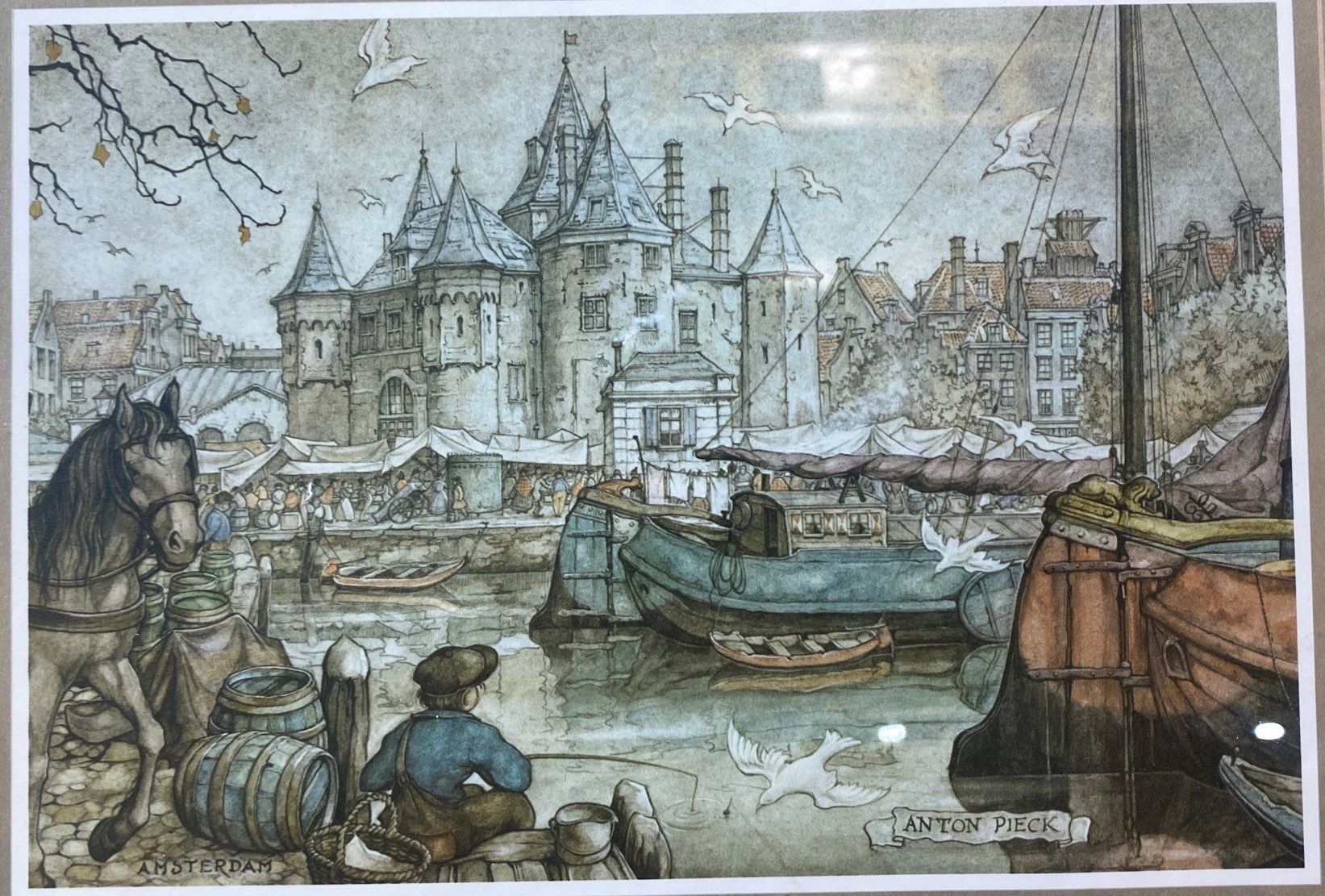 This framed print, “City Scenes. Amsterdam” by Dutch artist Anton Pieck, charmingly captures the historic streets and canals of Amsterdam with meticulous detail and nostalgic atmosphere. Pieck’s signature style brings the city to life, highlighting quaint architecture and lively urban scenes. A delightful piece for collectors of European cityscapes and classic Dutch art.