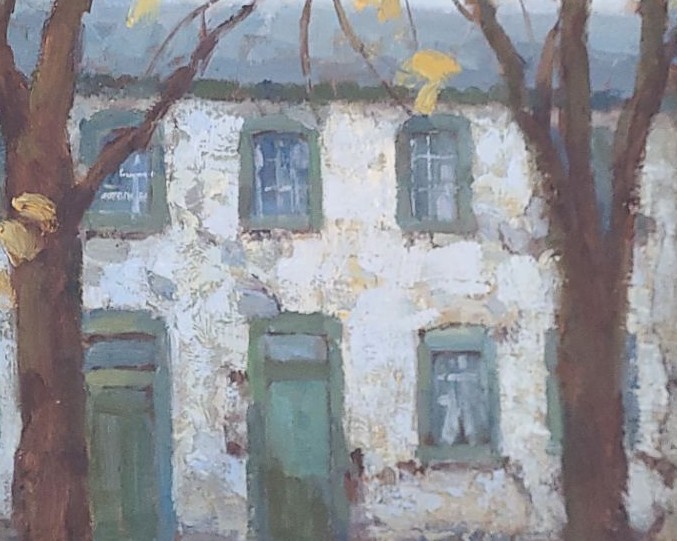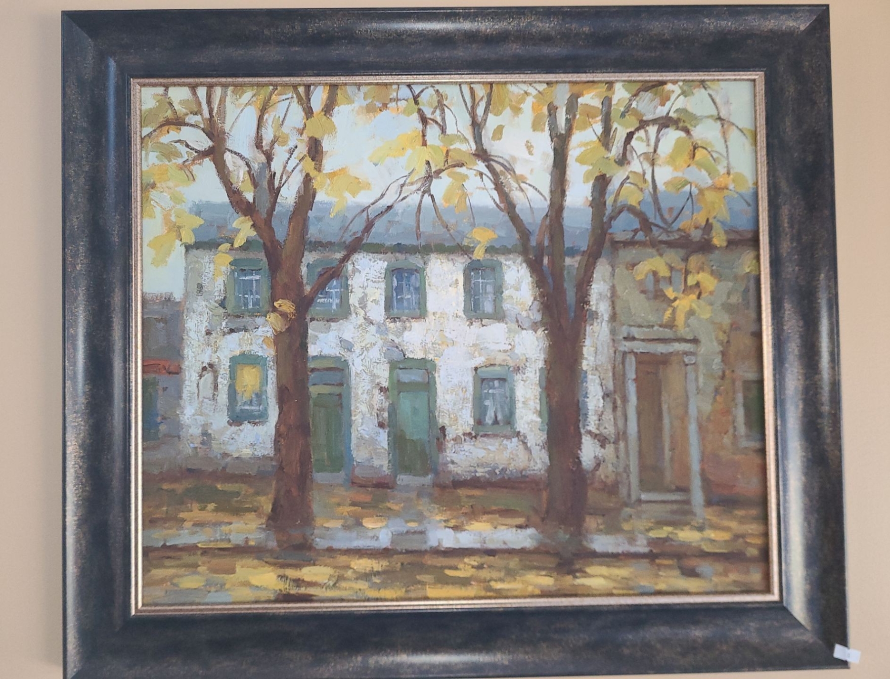 Framed Print of Home on Tree-Lined Street 29 X 25, Paint on Canvas