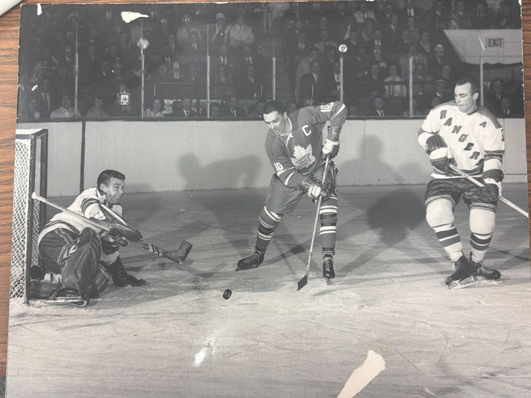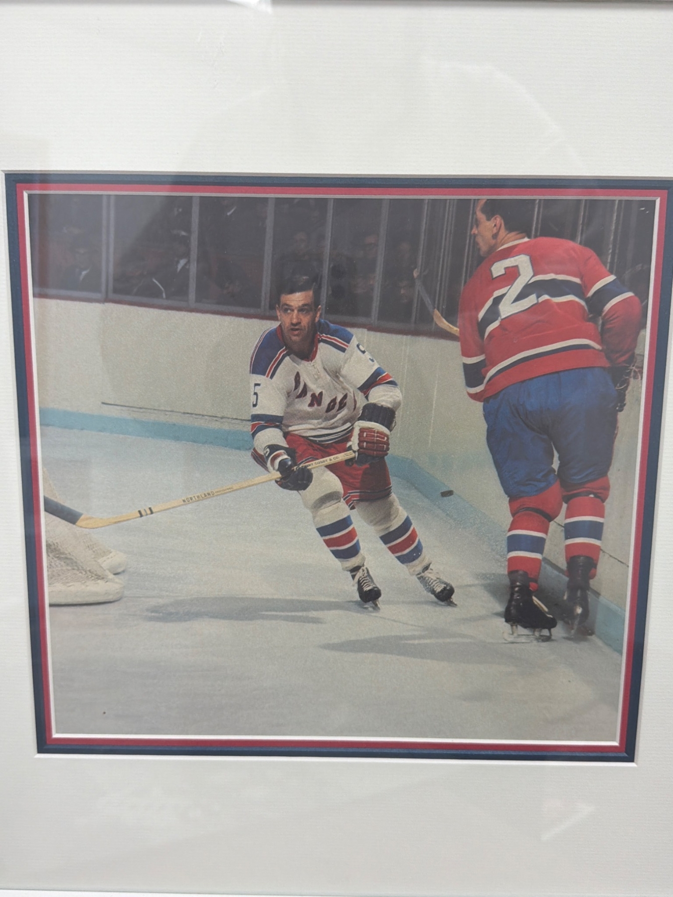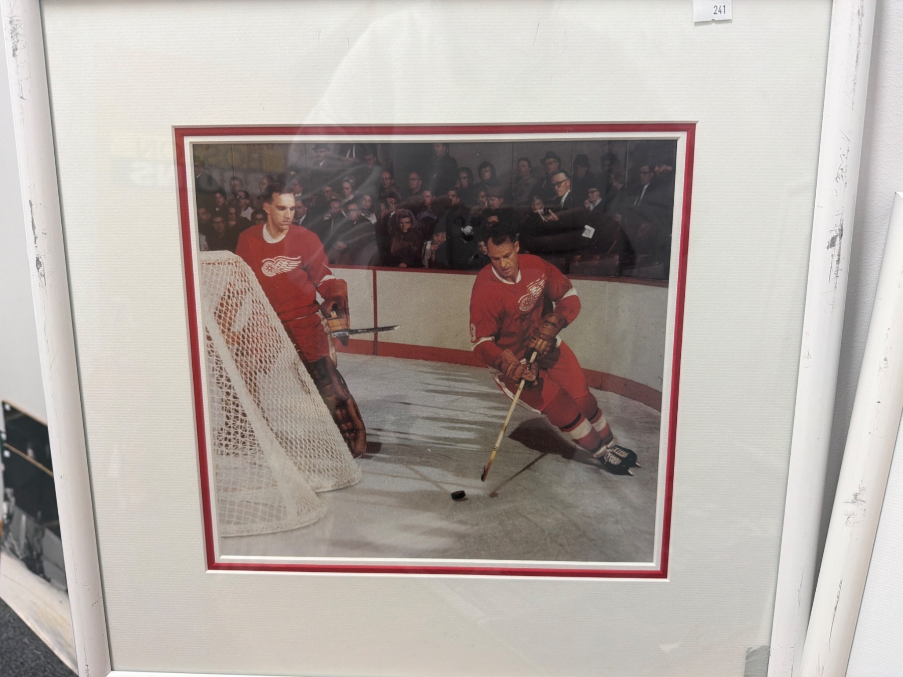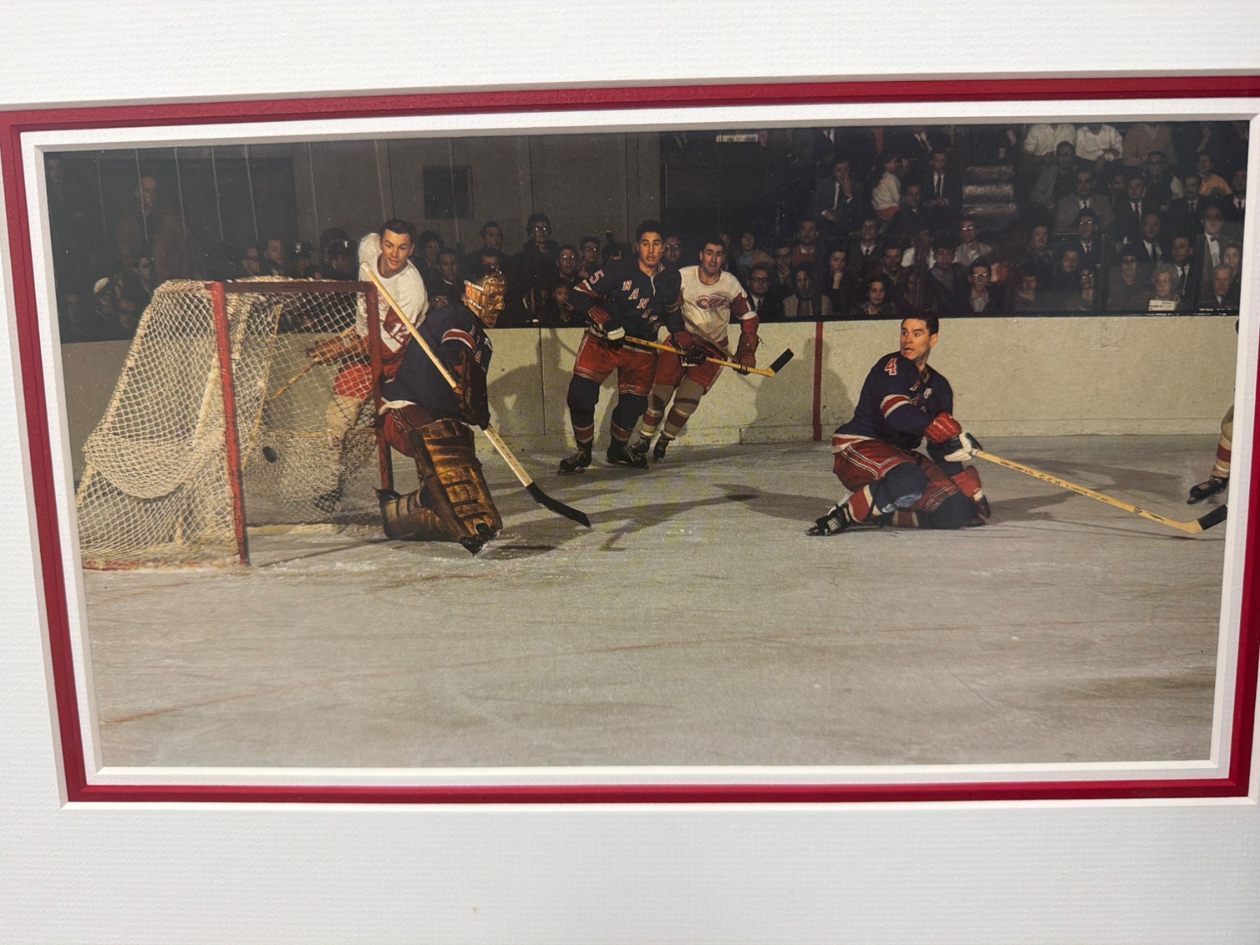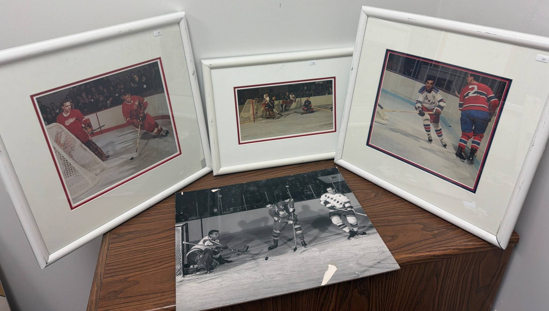 Three framed color prints and one unframed black-and-white photograph showcasing historic hockey moments featuring the New York Rangers and Detroit Red Wings. Each display captures thrilling action on the ice, appealing to hockey enthusiasts and collectors. Frames have a white finish with matching color matting edges, enhancing the images' vibrant details and timeless appeal.