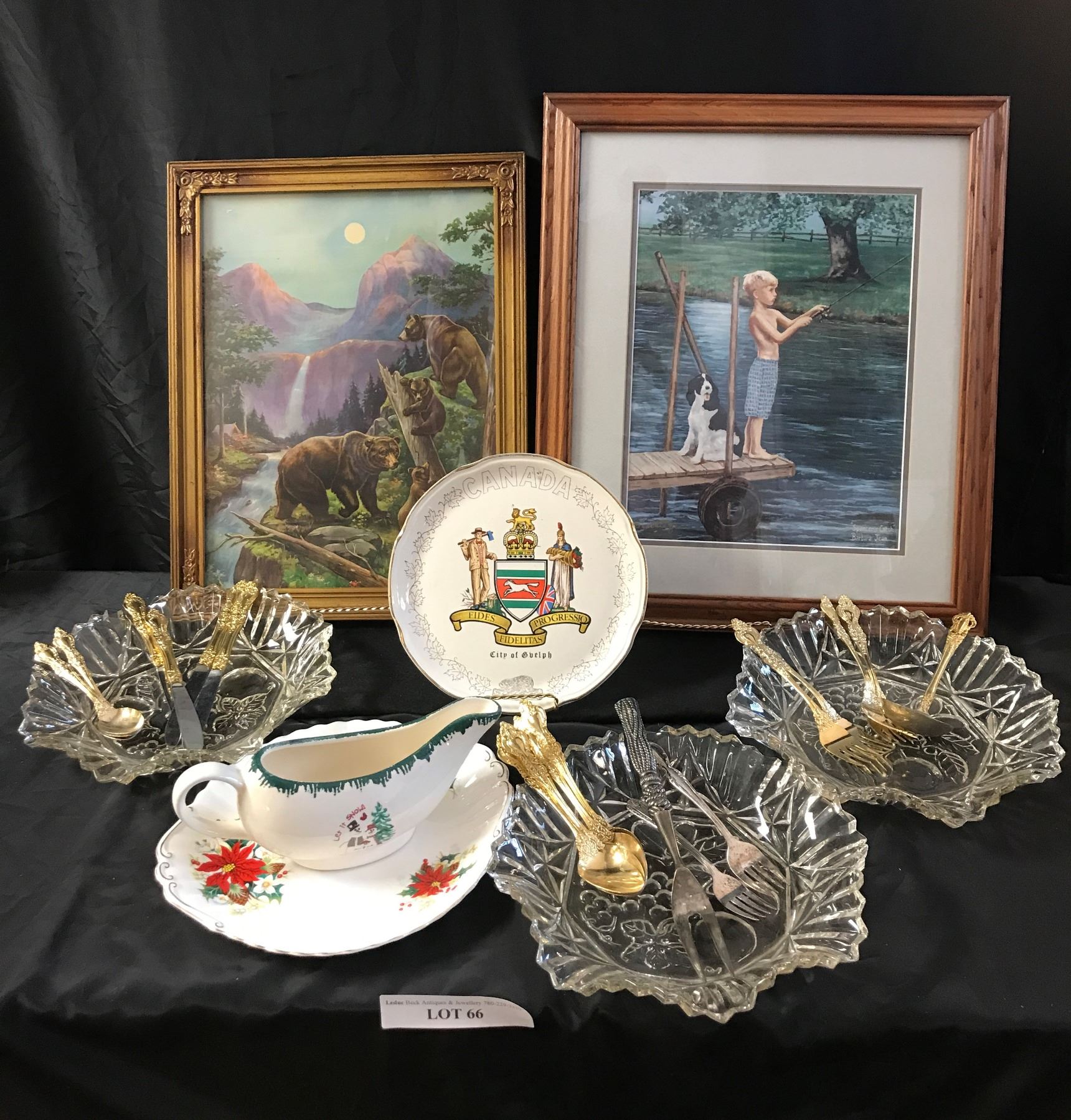 Framed Spencer's Catch Print by Barbara Catch Painting, Bear Print, 3 Crystal Bowls, Stainless & Silverplate Utensils, City of Guelph Plate, Poinsettia Plate, Let it Snow Gravy Bowl
