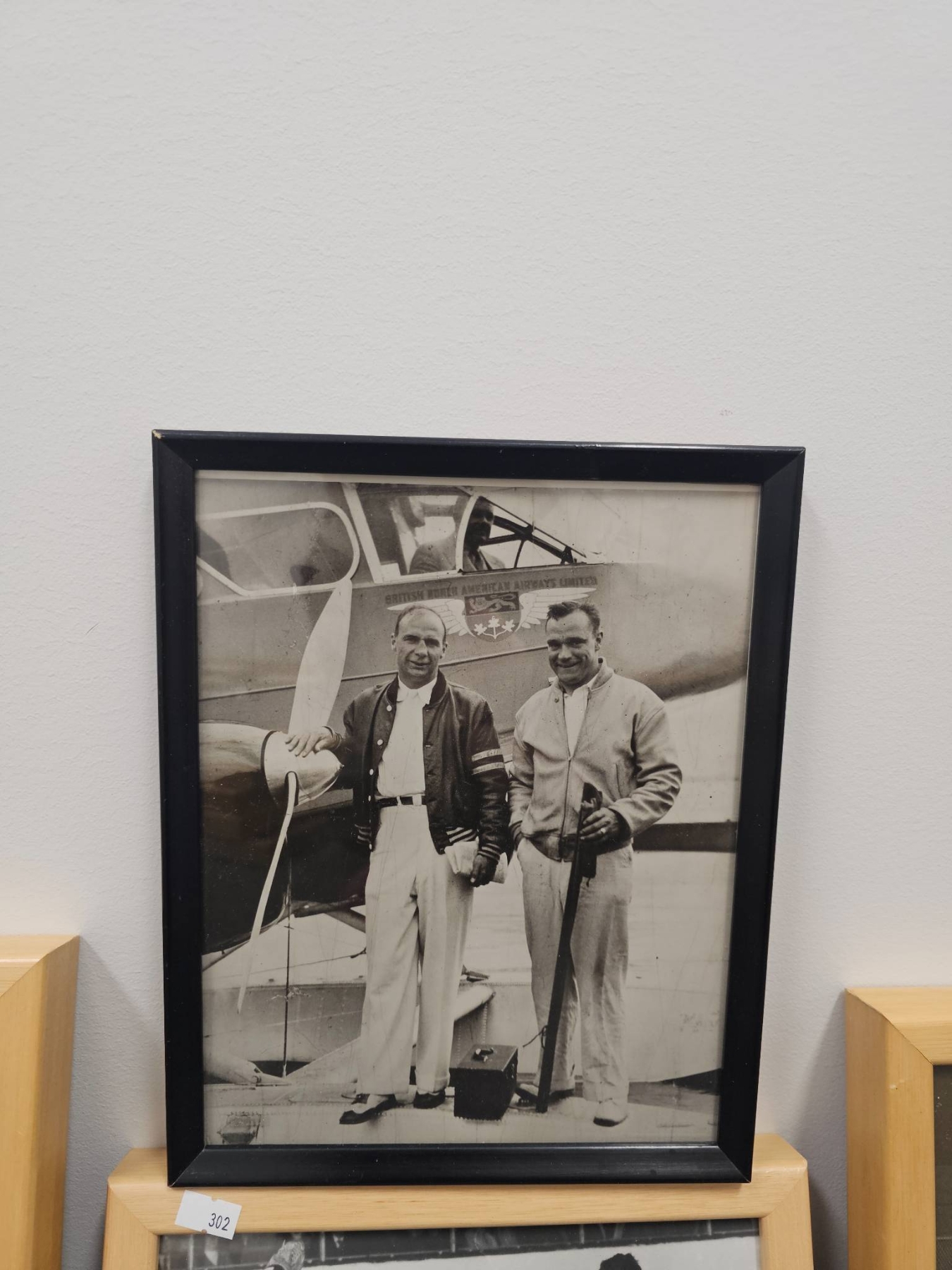4 framed sports photographs and a hockey-related vinyl record. Images include hockey game action shots, a "Maple Leafs and All Stars" 1934 team photograph, "The Hot Stove League" photograph, and a vintage aviation-themed sports photo. The vinyl record adds a unique touch, offering skating tips from Ron Ellis. Frames are simple wood or black. A perfect set for hockey history enthusiasts or collectors of sports memorabilia.