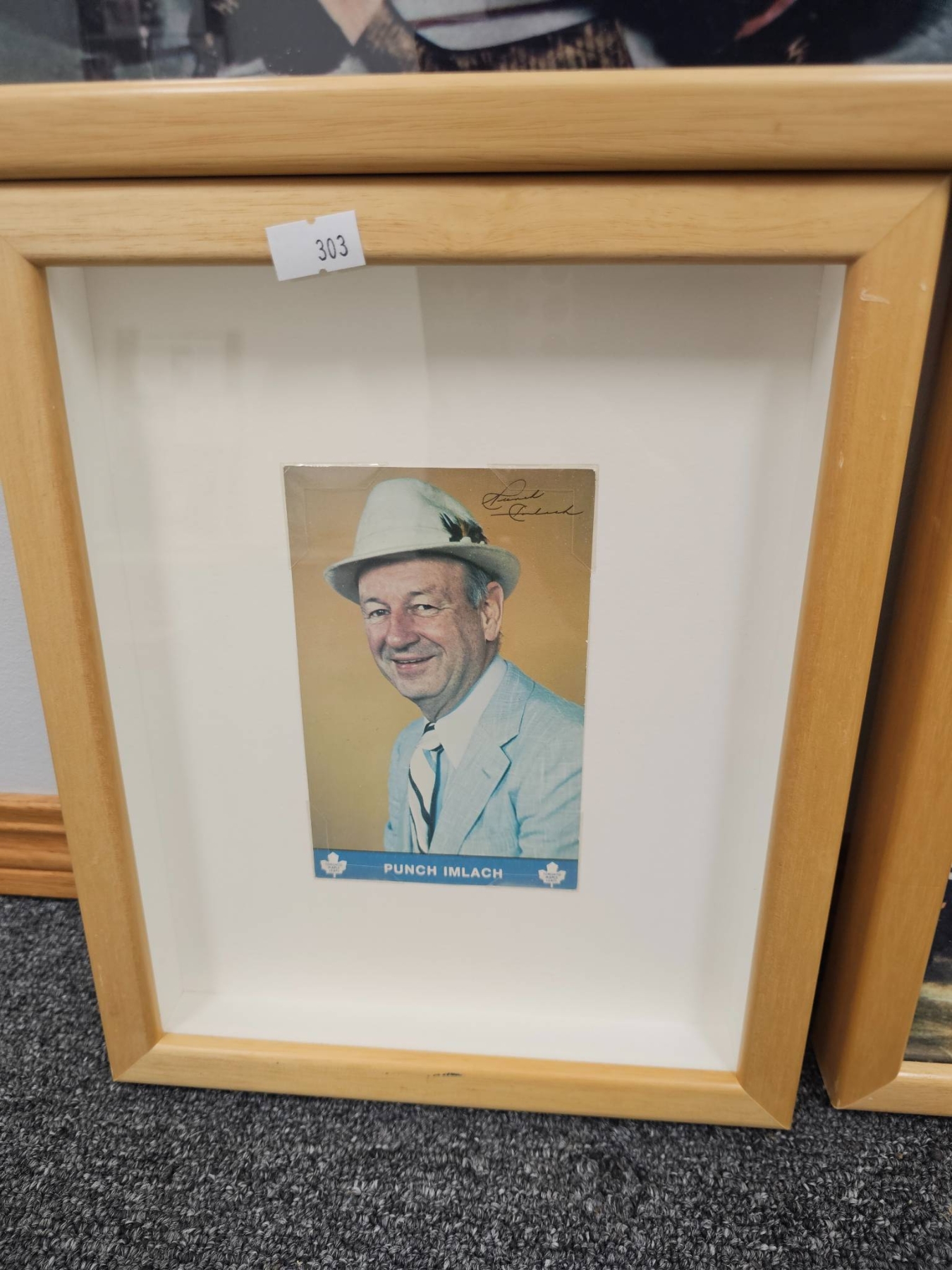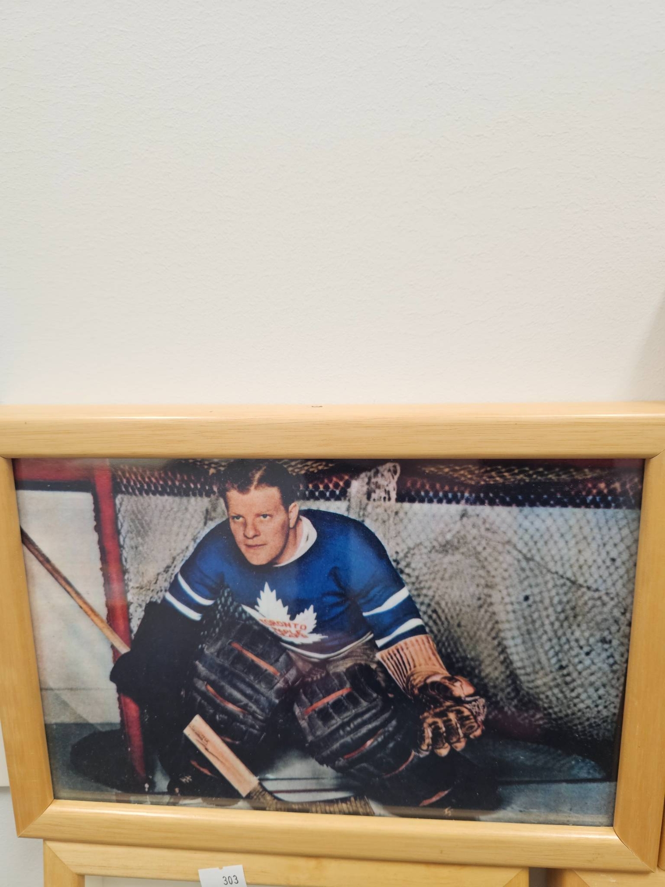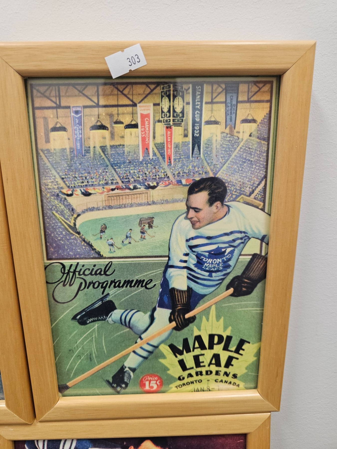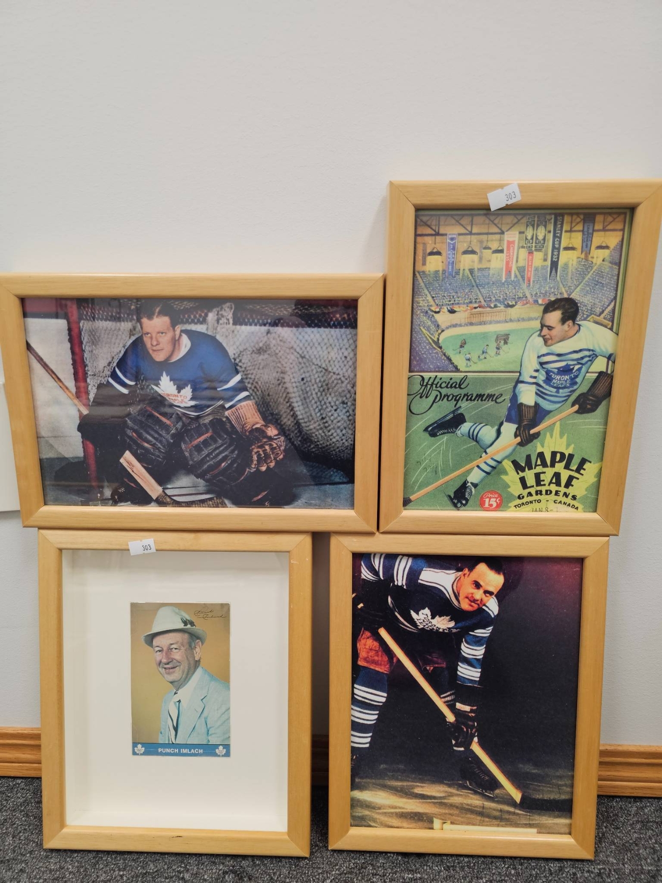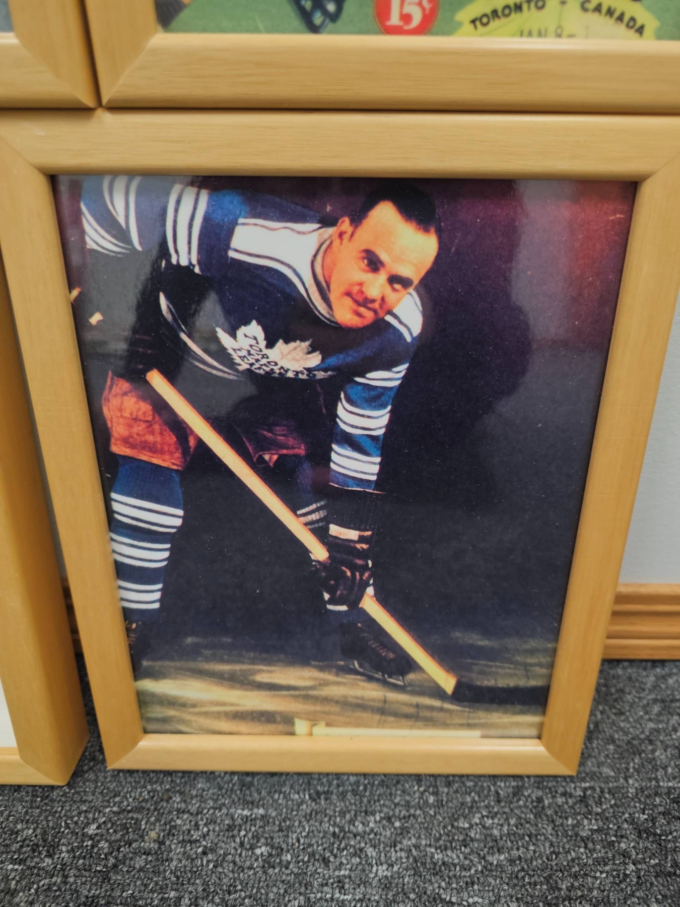 Four framed Toronto Maple Leafs collectibles, featuring nostalgic hockey imagery and player portraits. Includes one vintage program cover and depictions of players in uniform, capturing iconic moments in the team's history. Frames complement the pieces for easy display. A great collection for NHL fans or lovers of hockey history.