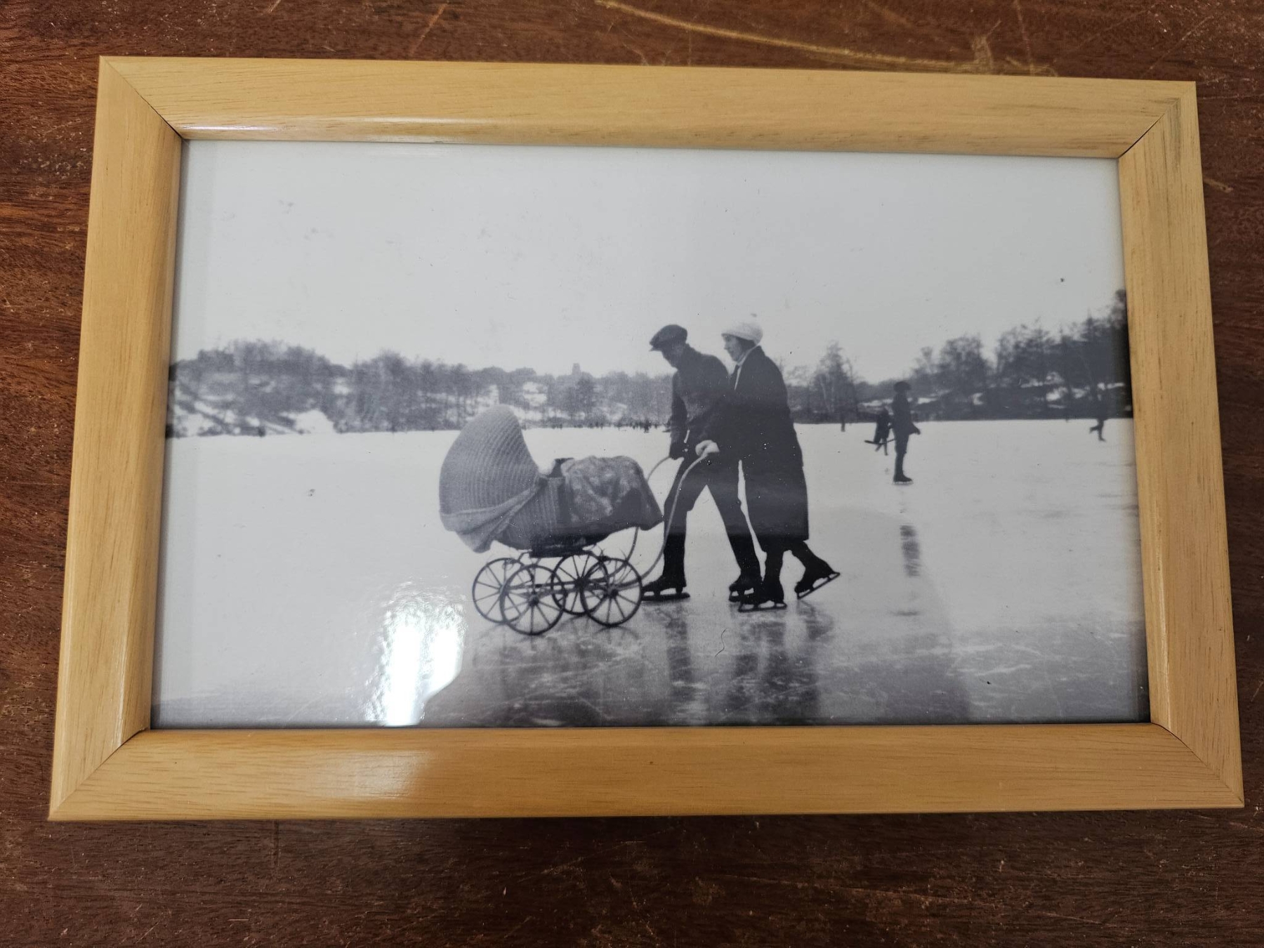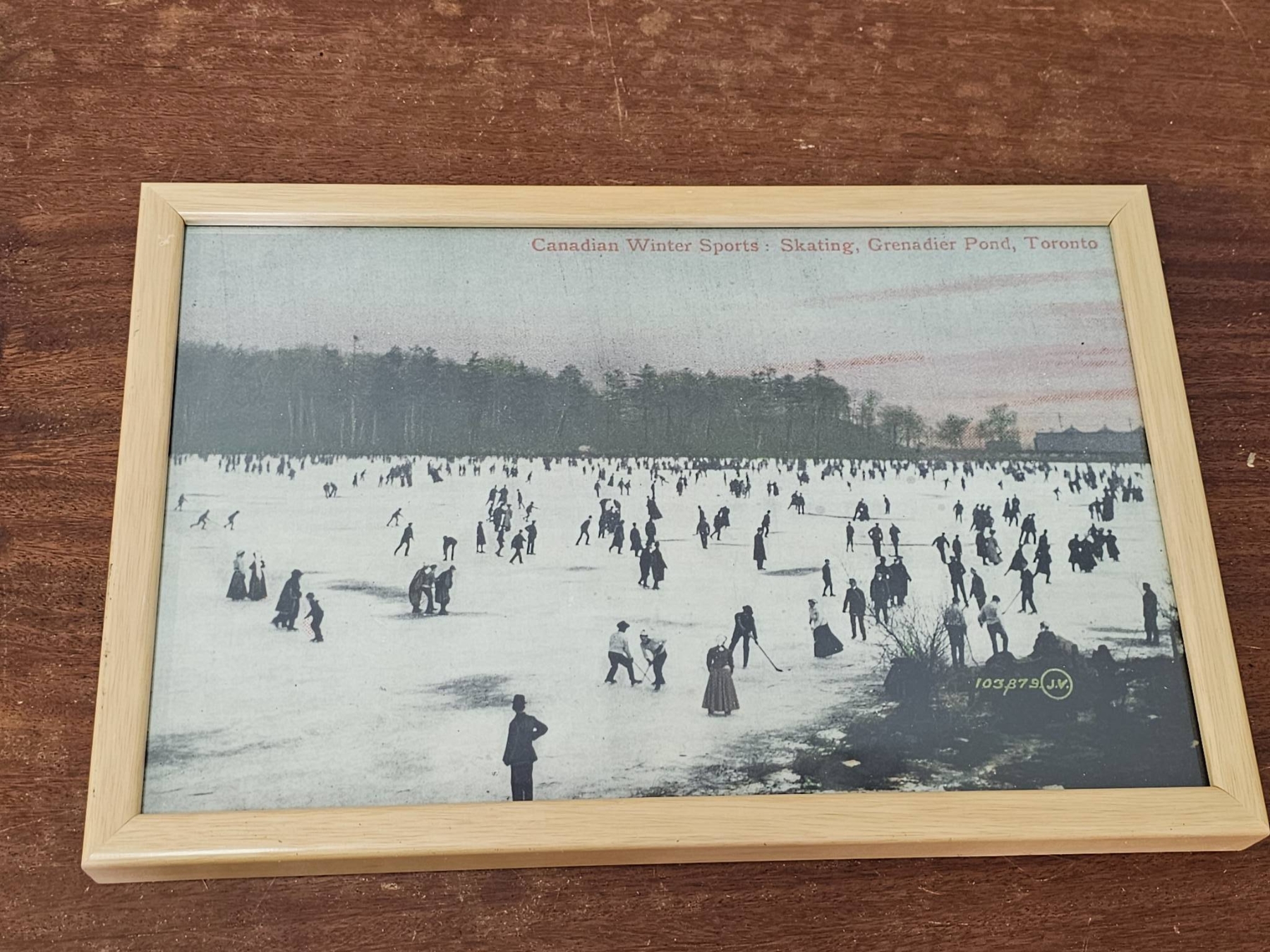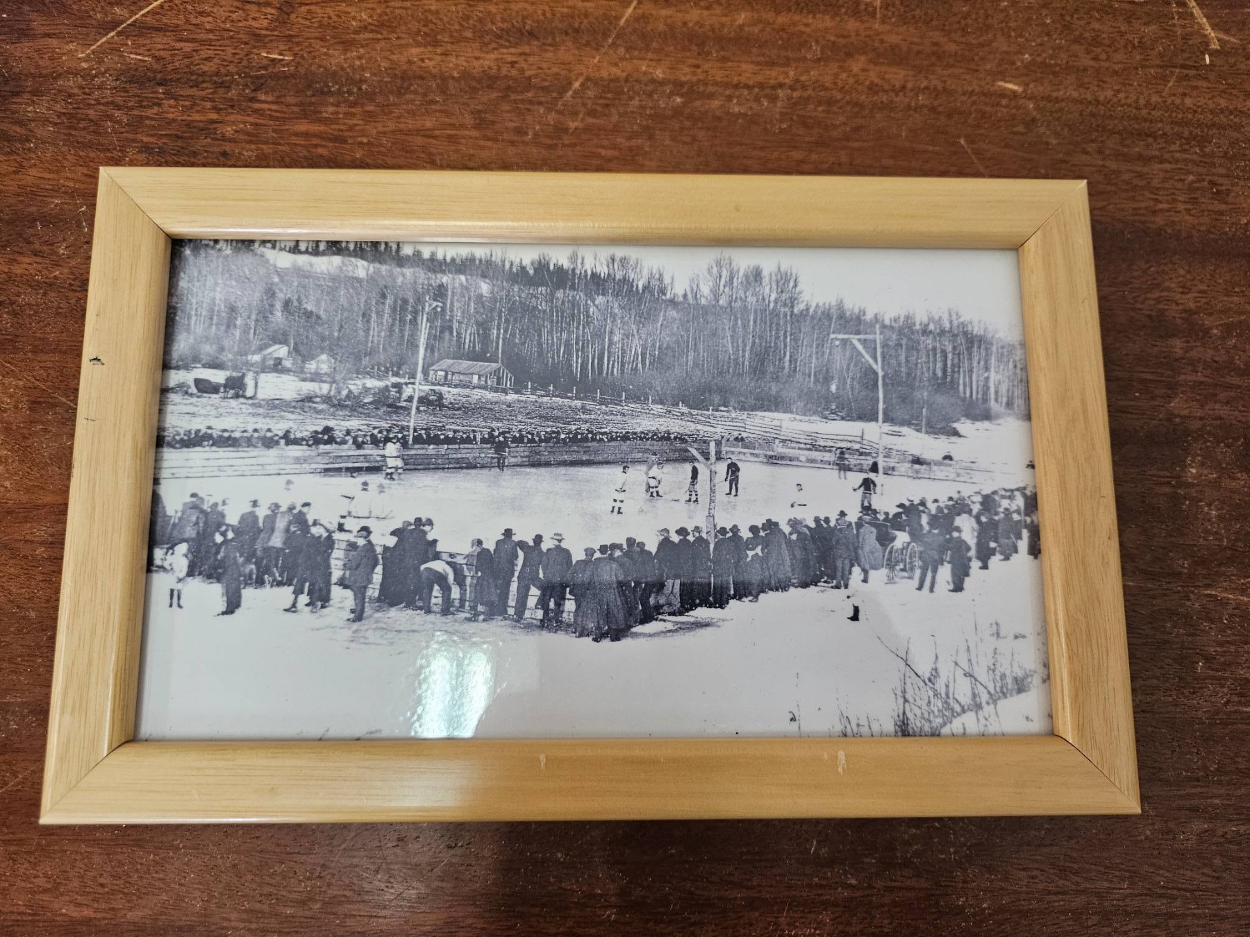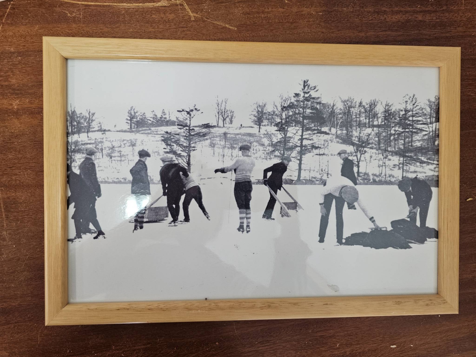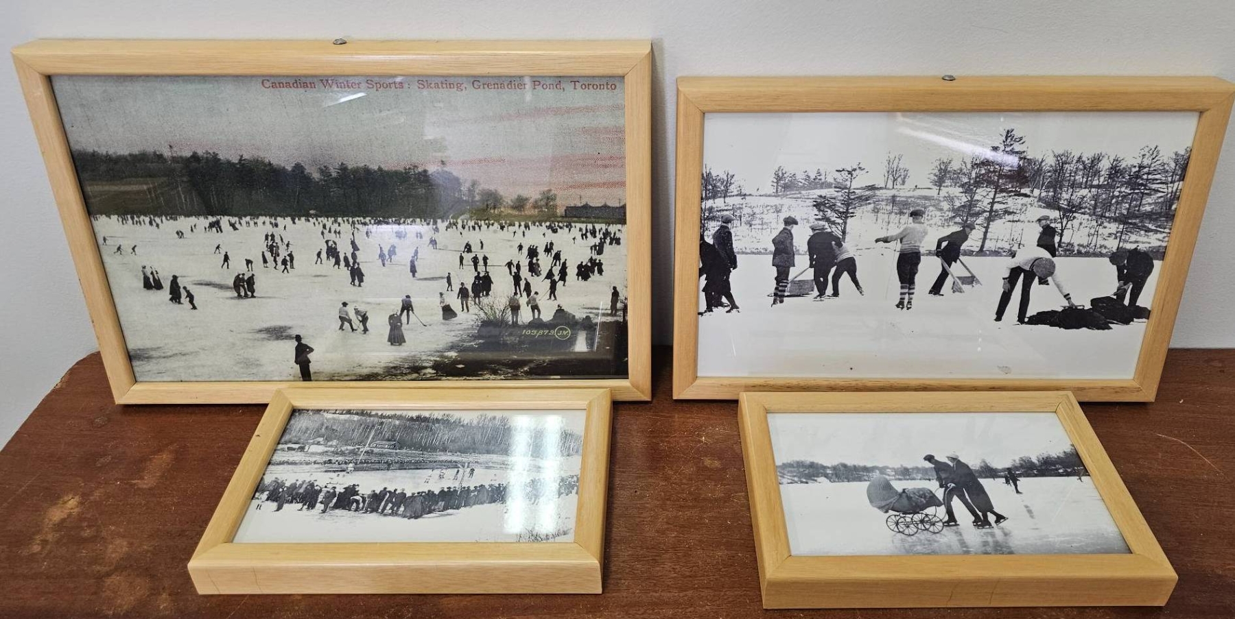 Four framed prints depicting historical ice skating scenes. The images are rendered in black and white, with one featuring coloured accents and titles reading "Canadian Winter Sports" The frames are made of light wood, showcasing natural grain. All frames include backing and hanging hardware. Frame sizes vary. Suitable for wall display or shelf decor.