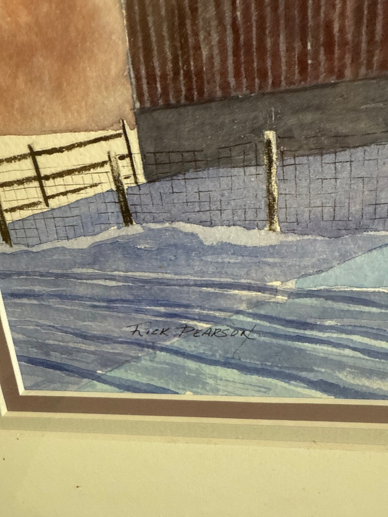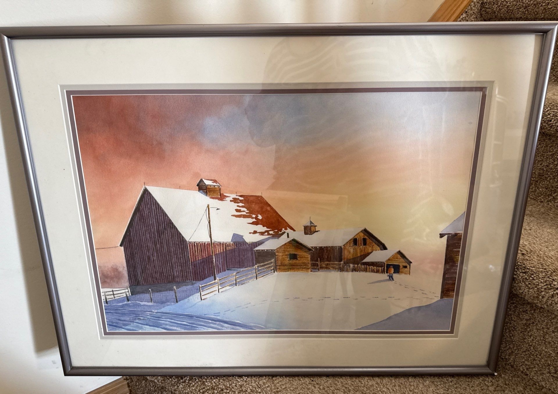Framed Water Color Art - Snow Covered Winter Farmhouse 17x15