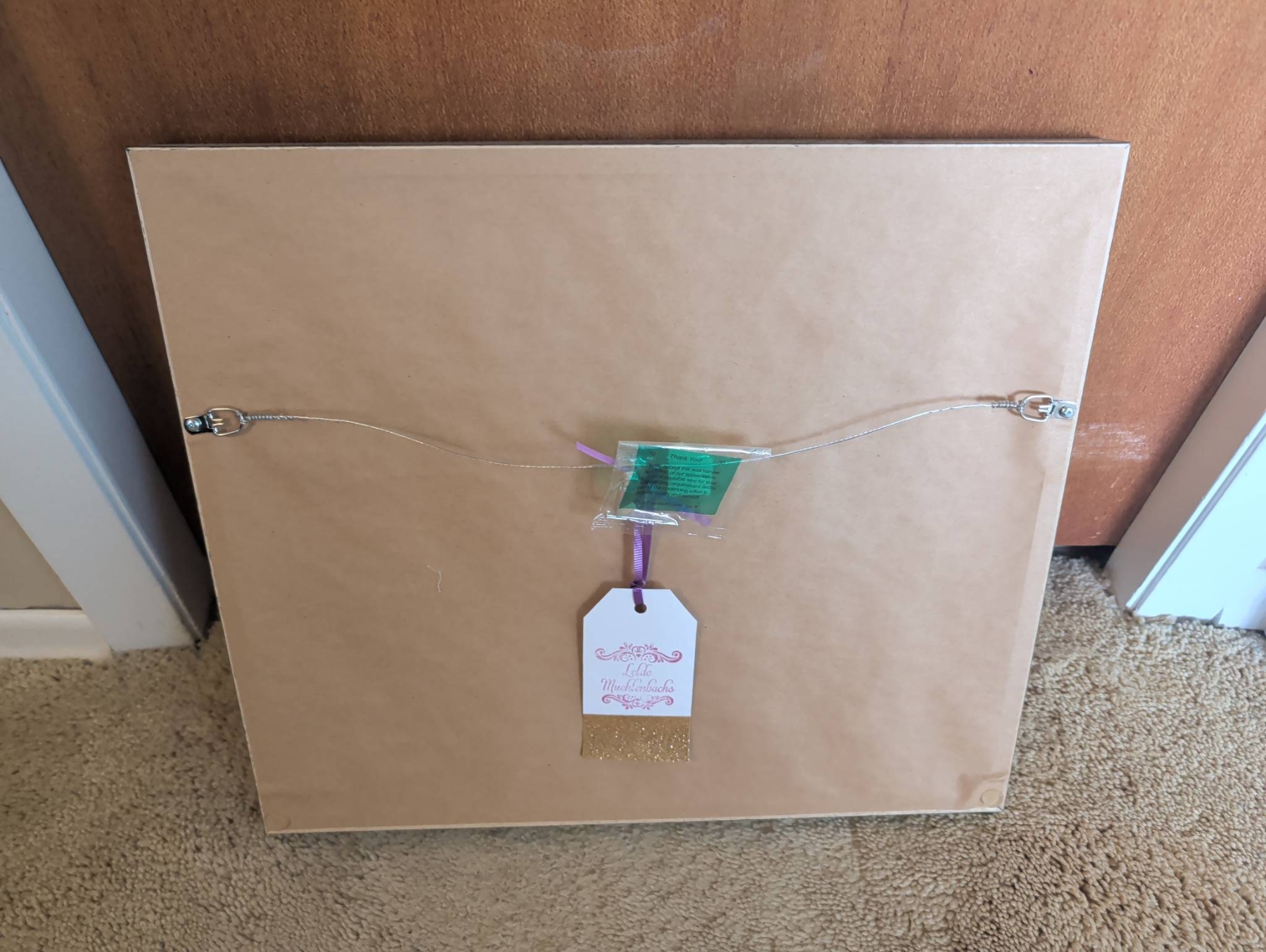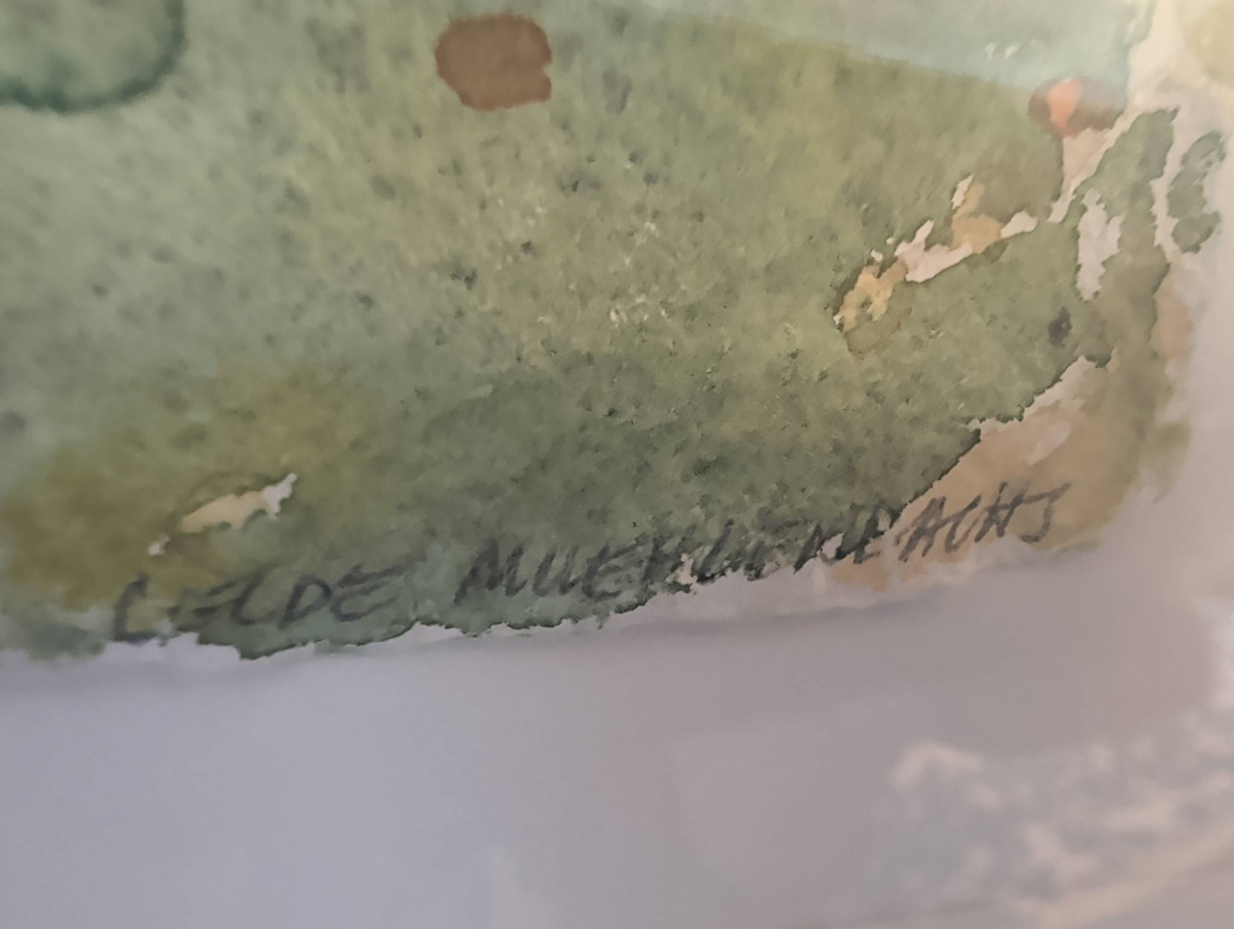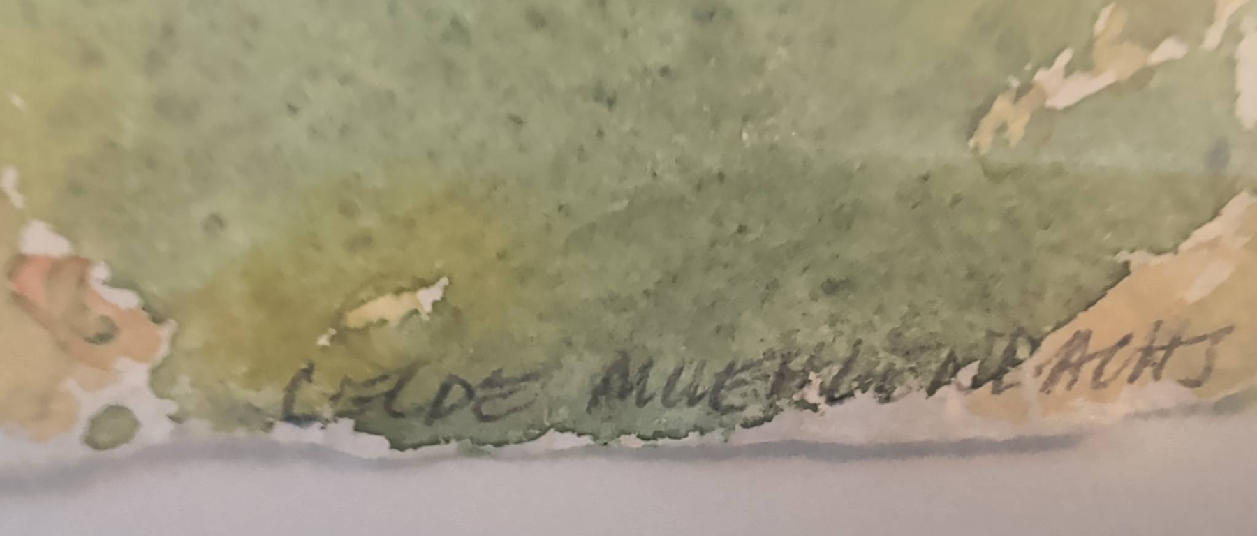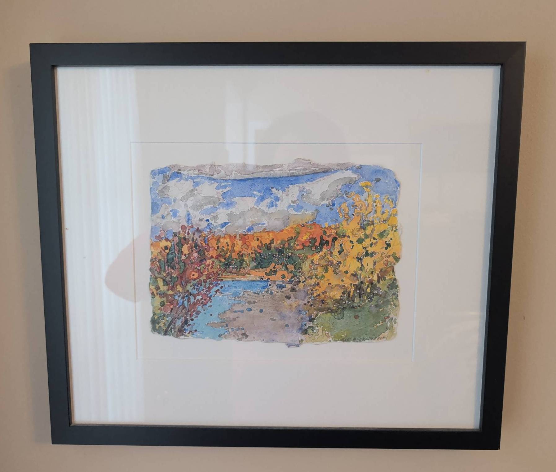 Framed watercolor landscape painting by Lelde Muller-Watts, depicting a serene autumn scene of trees and a river under a vibrant sky. Signed by the artist on the front. The artwork measures approximately 10″ x 8″, and the frame dimensions are 18″ x 16″. Presented behind glass in a sleek black frame with a hanging wire on the back, ready for display.