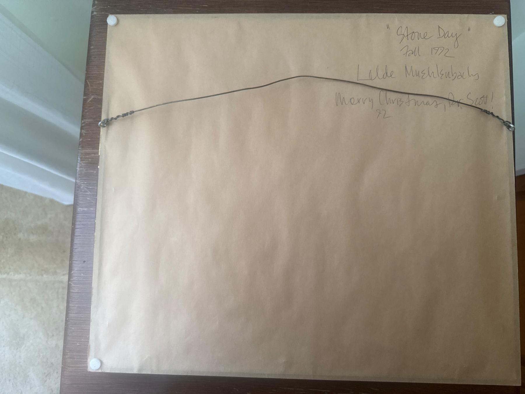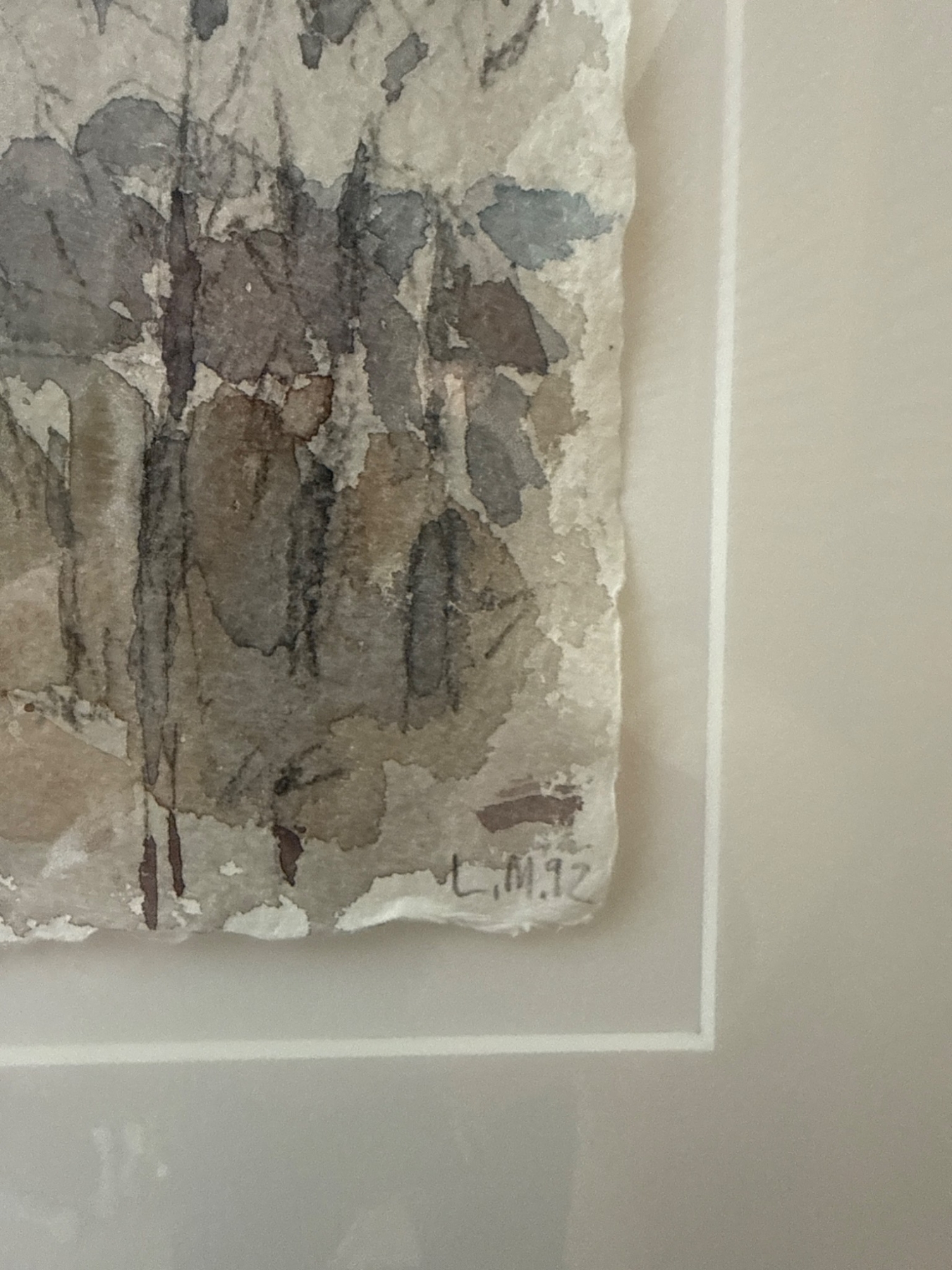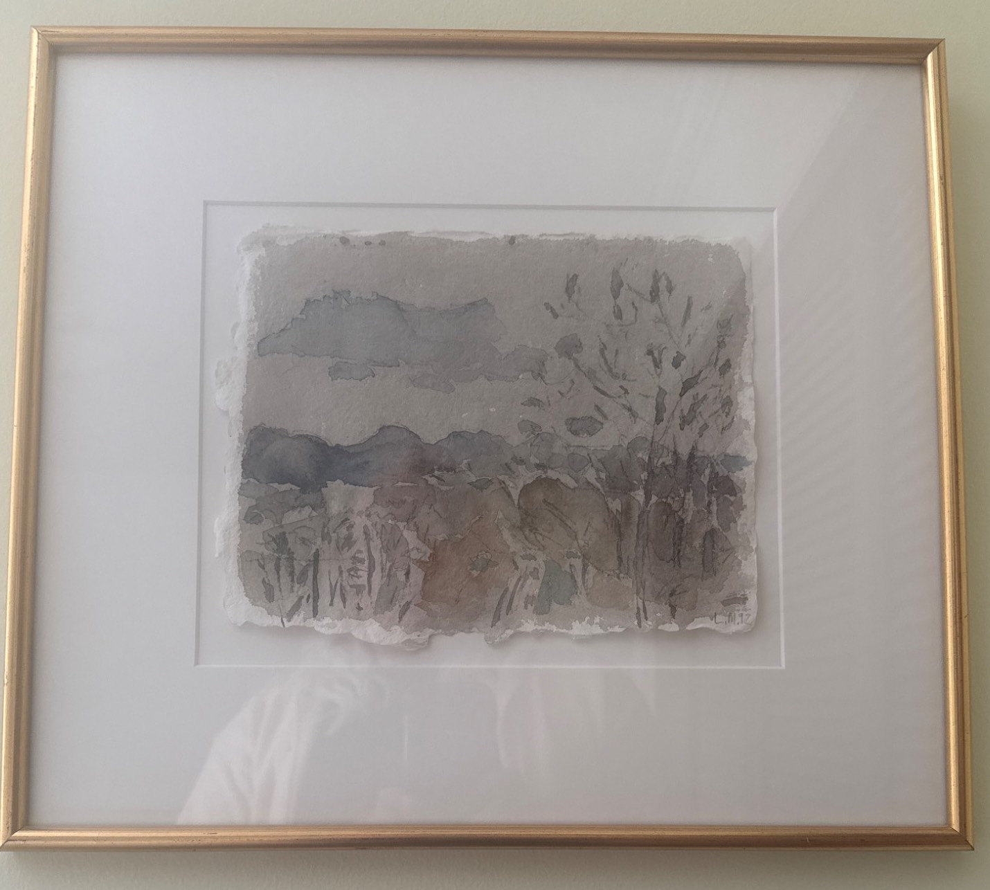 - Original watercolor landscape painting on textured paper. | - Signed by the artist in the bottom right corner with the year '92 noted. | - Artwork features a serene, muted color palette with scenic trees and horizon. | - Mounted within a cream-colored mat and encased in a gold-tone wooden frame. | - Backing includes protective kraft paper and a wire for ready-to-hang display. | - Frame dimensions approximately 20 x 16 inches; visible artwork approximately 10 x 8 inches.