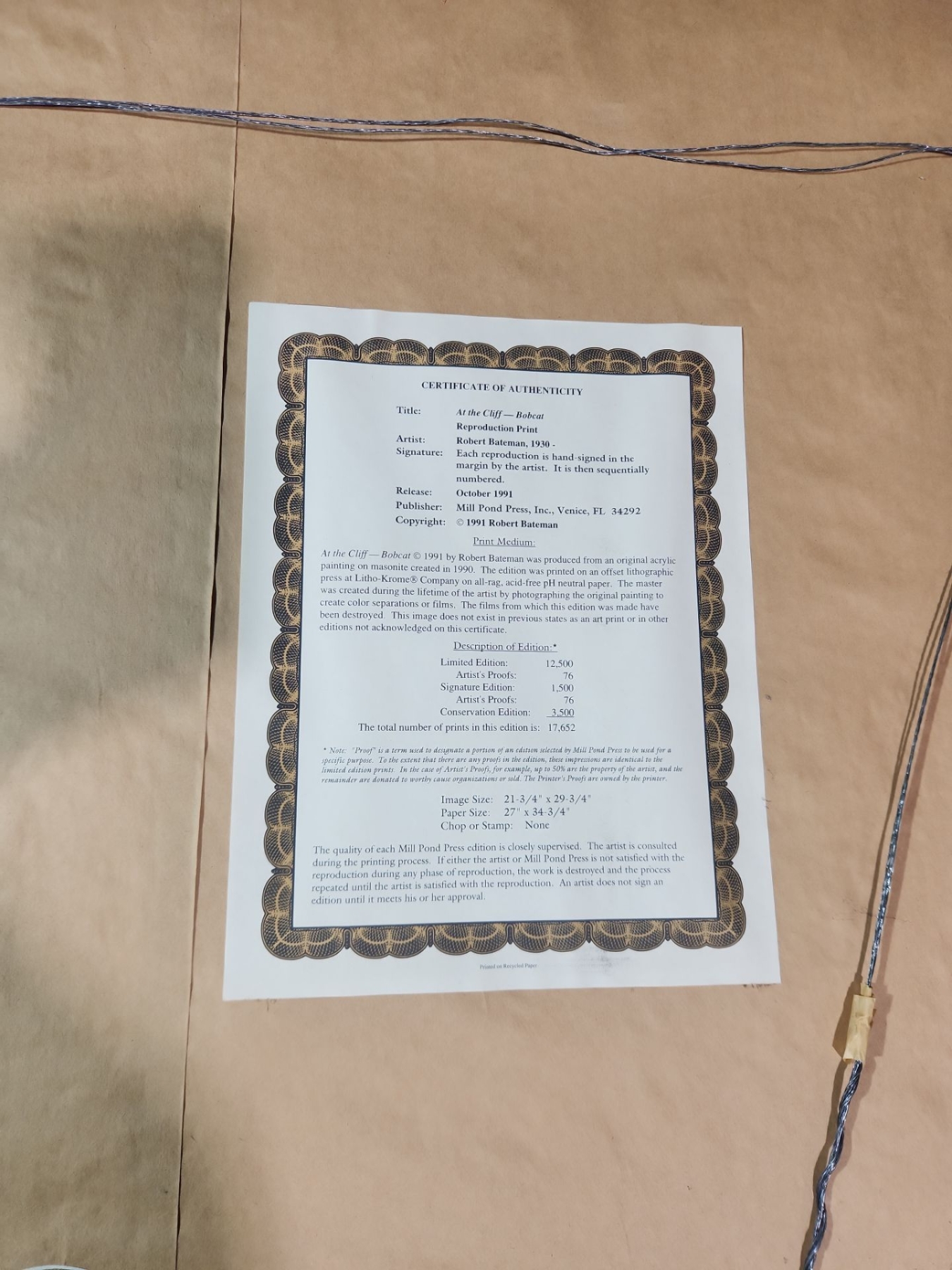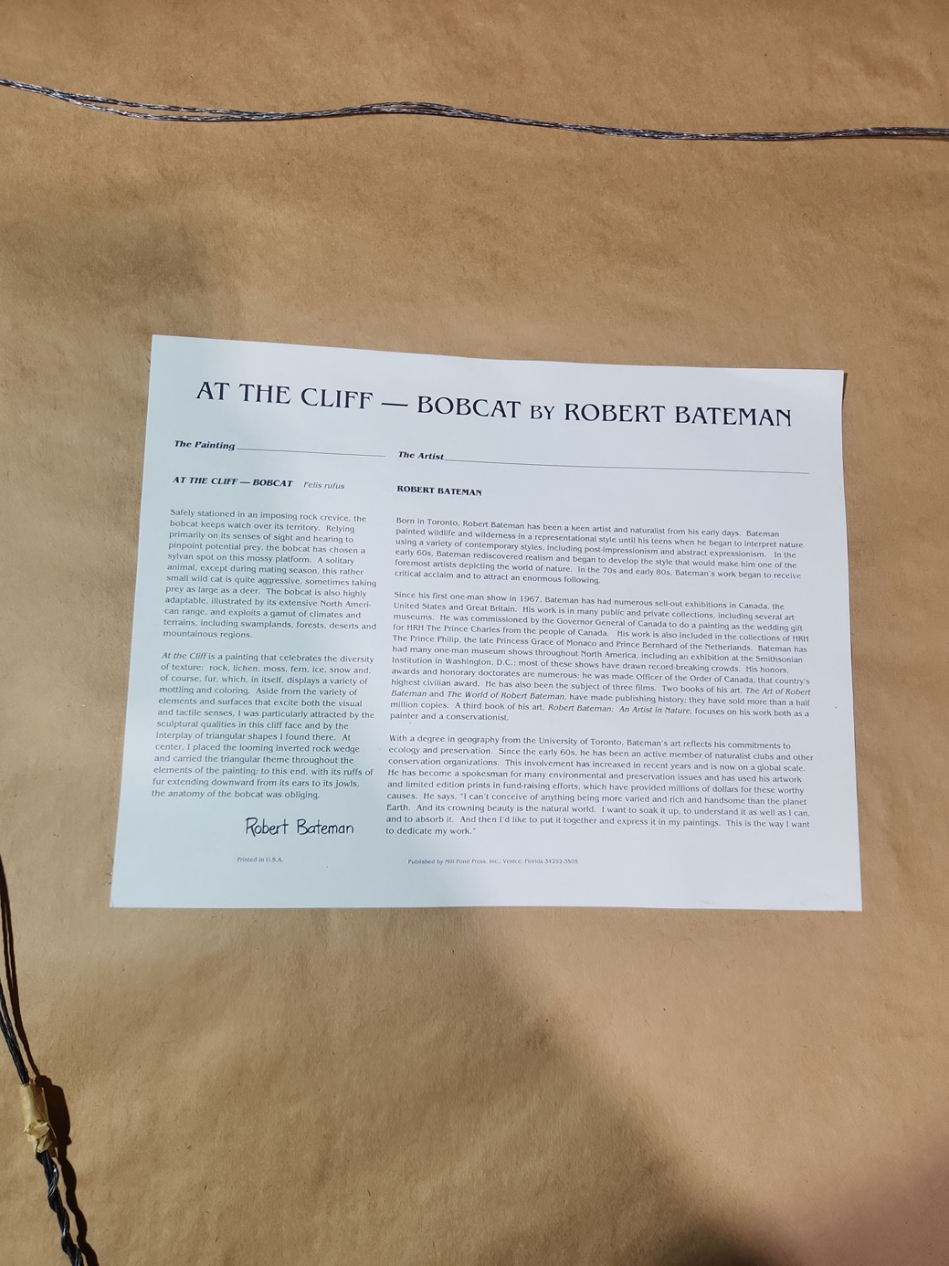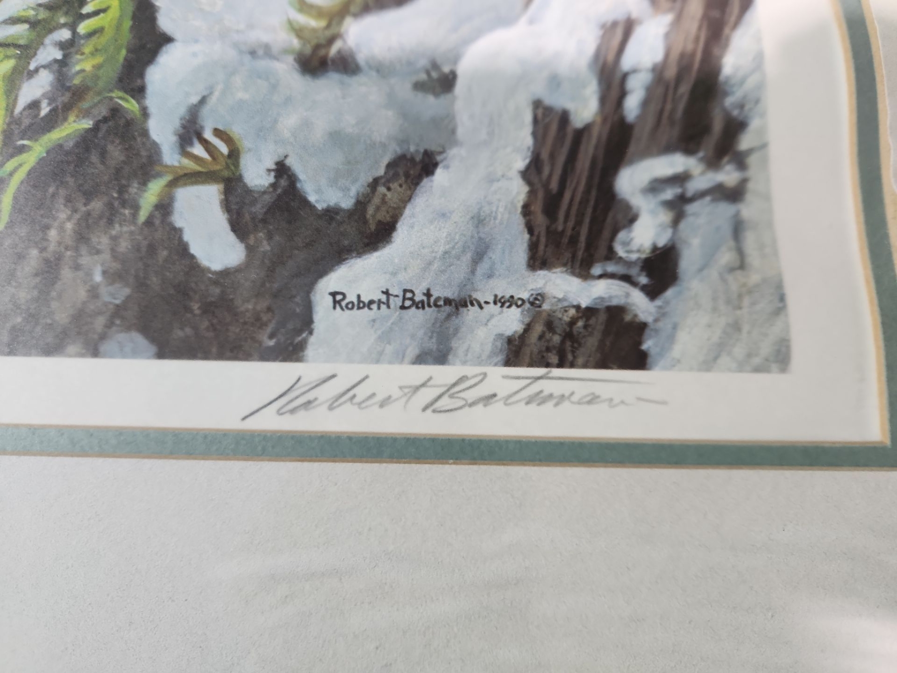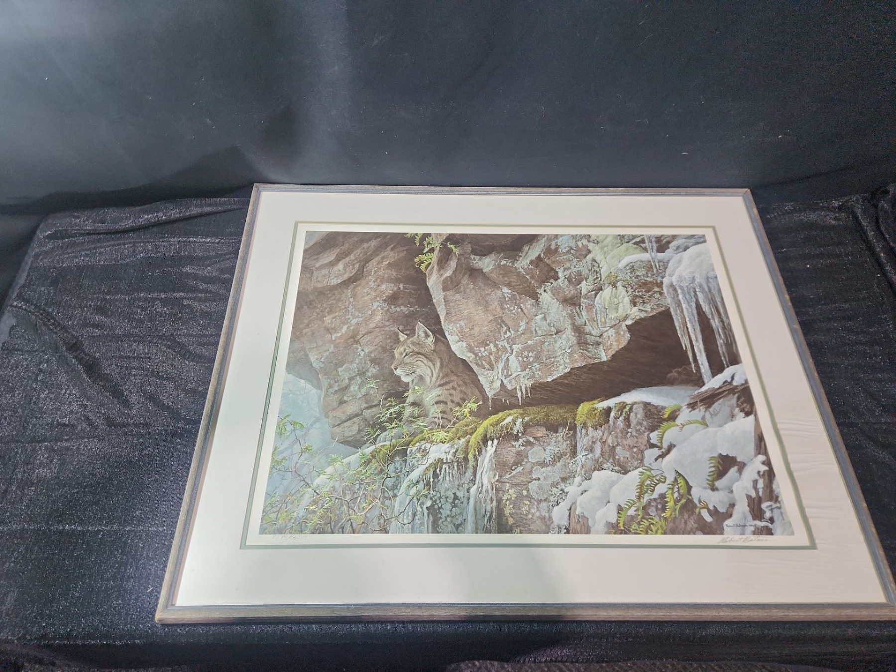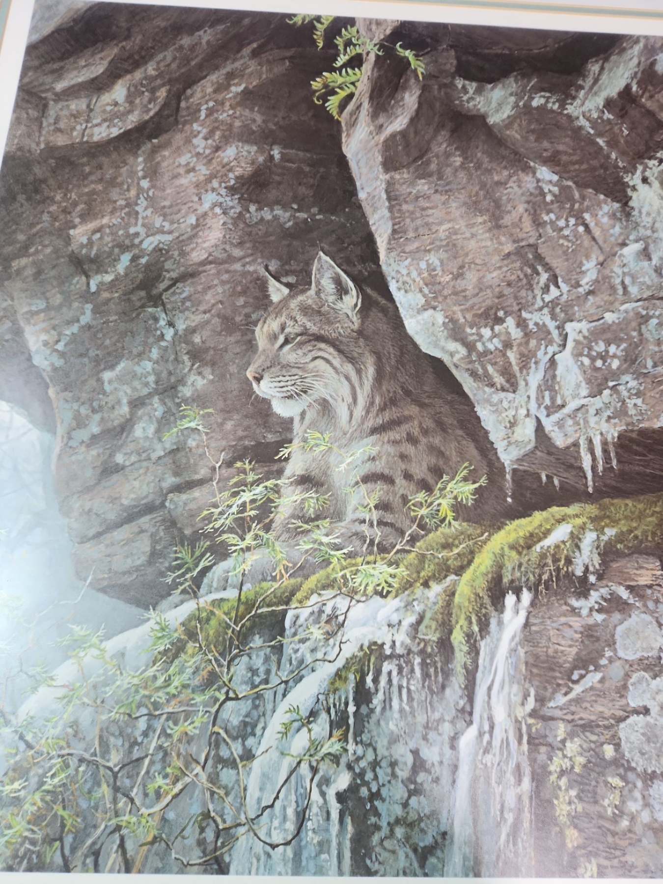 This is framed signed print of "At the Cliff- Bobcat" by Canadian artist Robert Bateman. The painting ( created in 1990) depicts a bobcat perched on a mossy rock ledge with snow and icicles surrounding it.