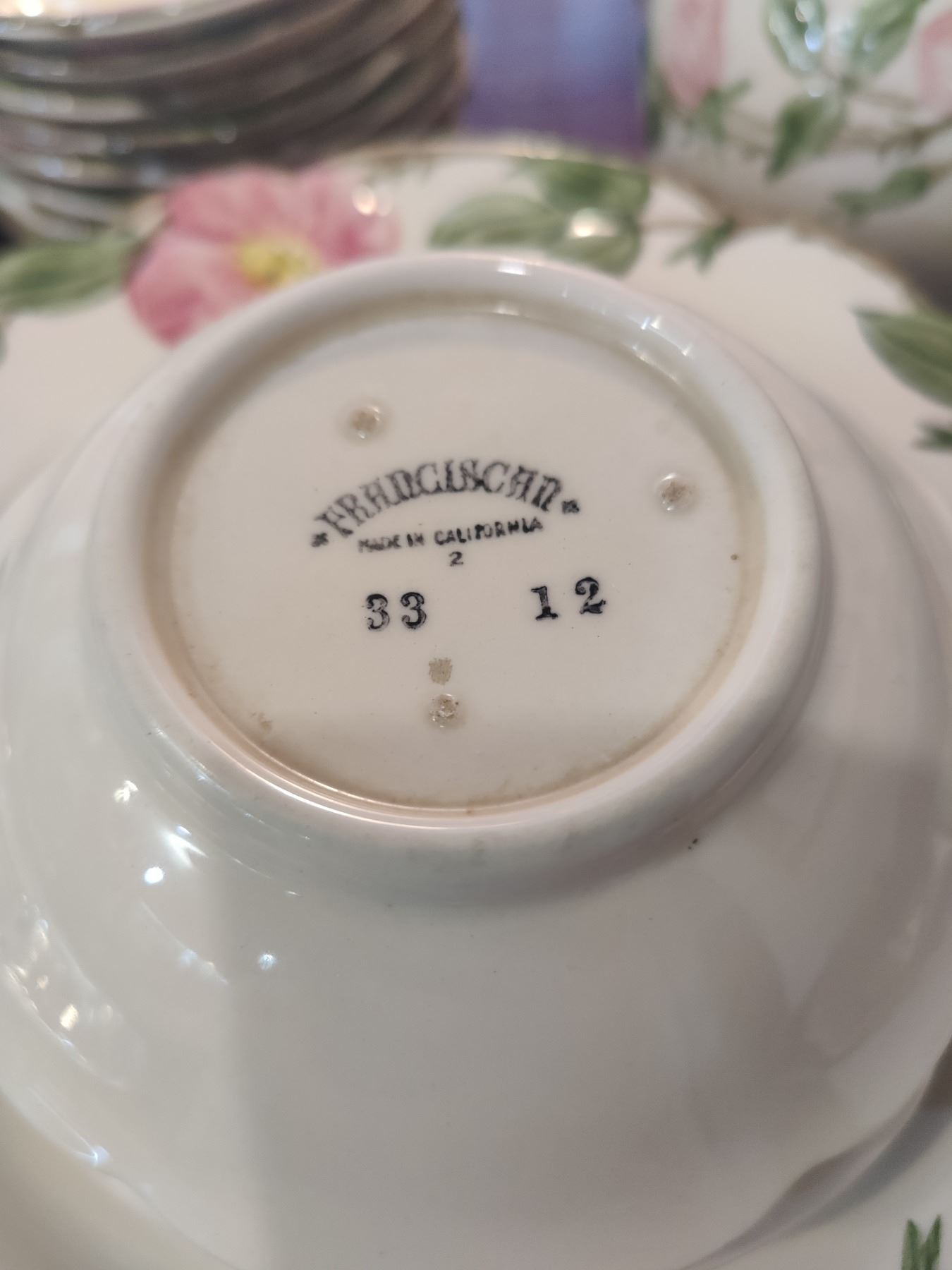 Immaculate Vintage Franciscan Ware Desert Rose (1940-1974) Complete Dinner set. Marked "Interpace Franciscan Earthenware Made in USA Oven Safe/ColorFast" with various production marks.