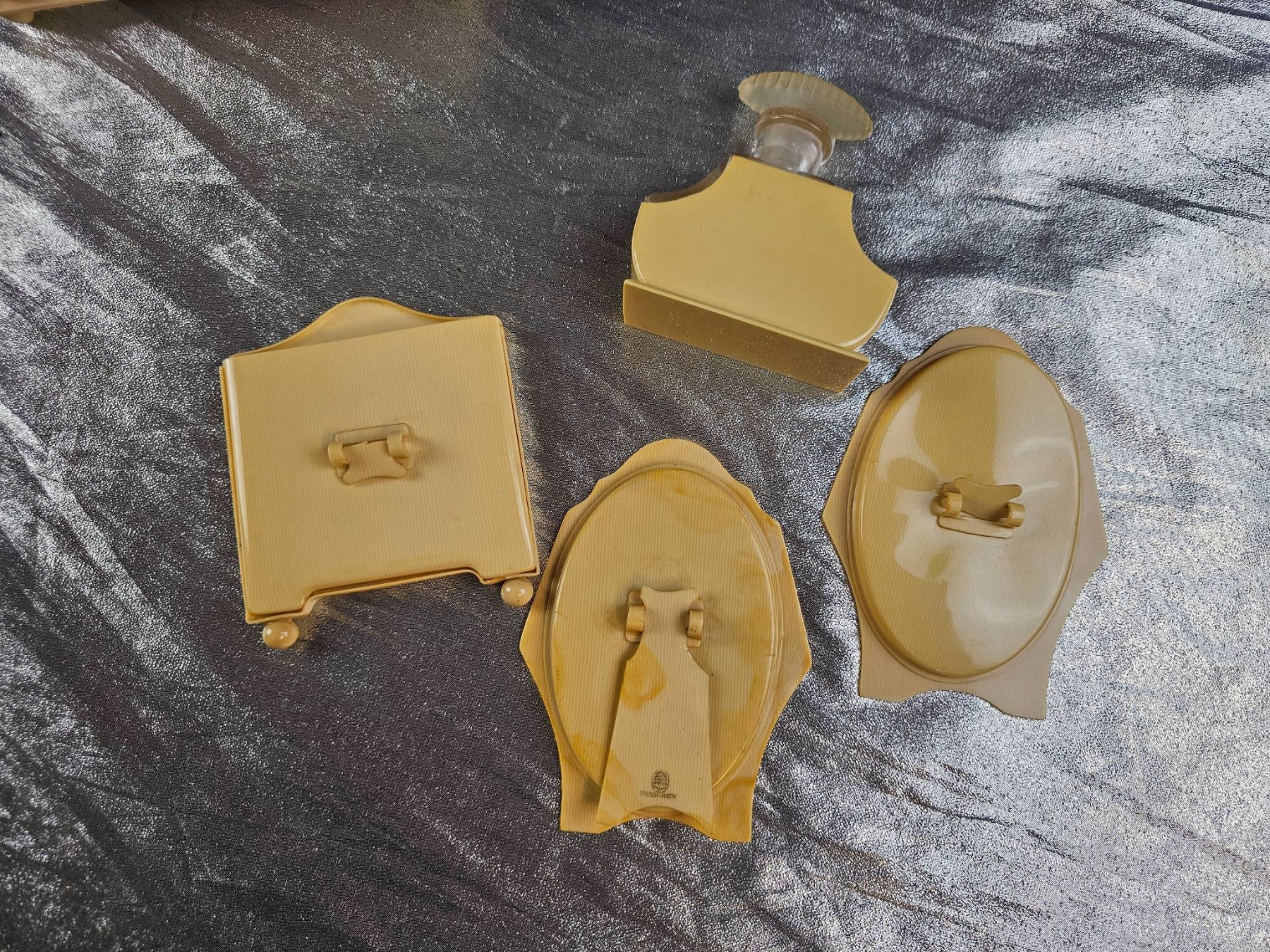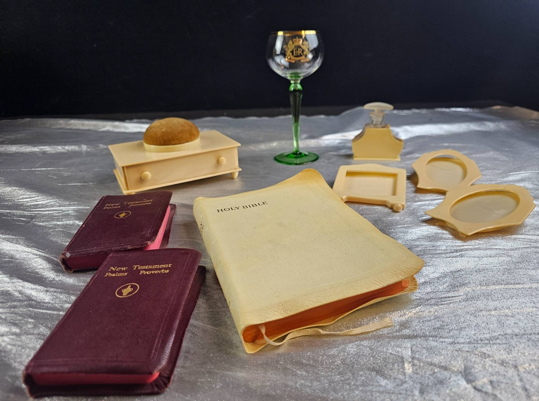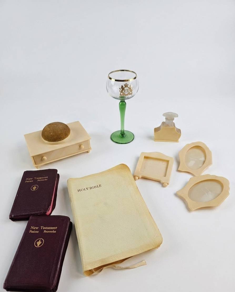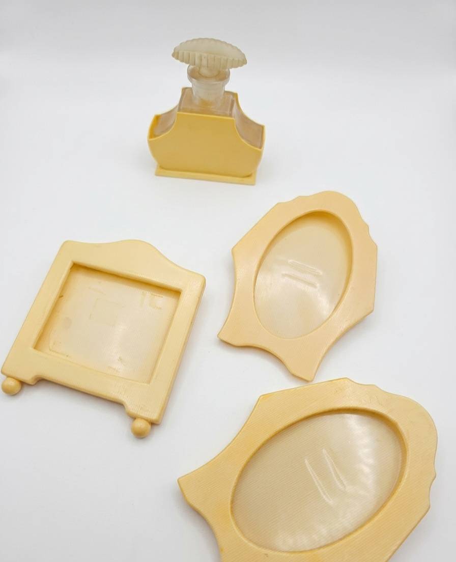 A curated assortment of French ivory vanity items and collectibles. The lot includes multiple photo frames, a perfume bottle with stopper, a pin cushion with drawer, and other miscellaneous items. Dimensions vary, with the pin cushion drawer approximately 4.5 inches wide and the goblet standing about 6 inches tall. Signs of age and wear are evident, including discoloration and minor imperfections, adding character to the set.