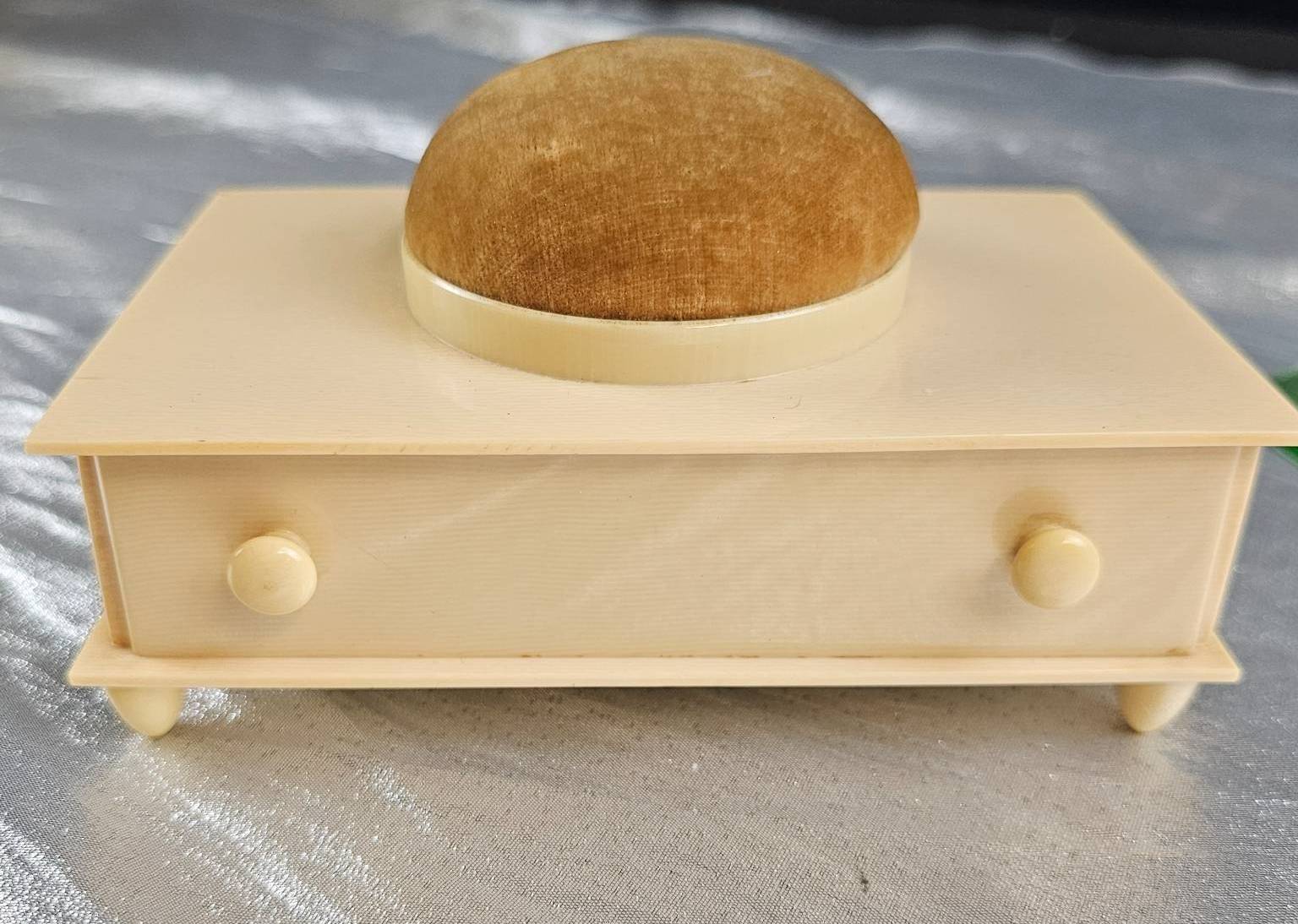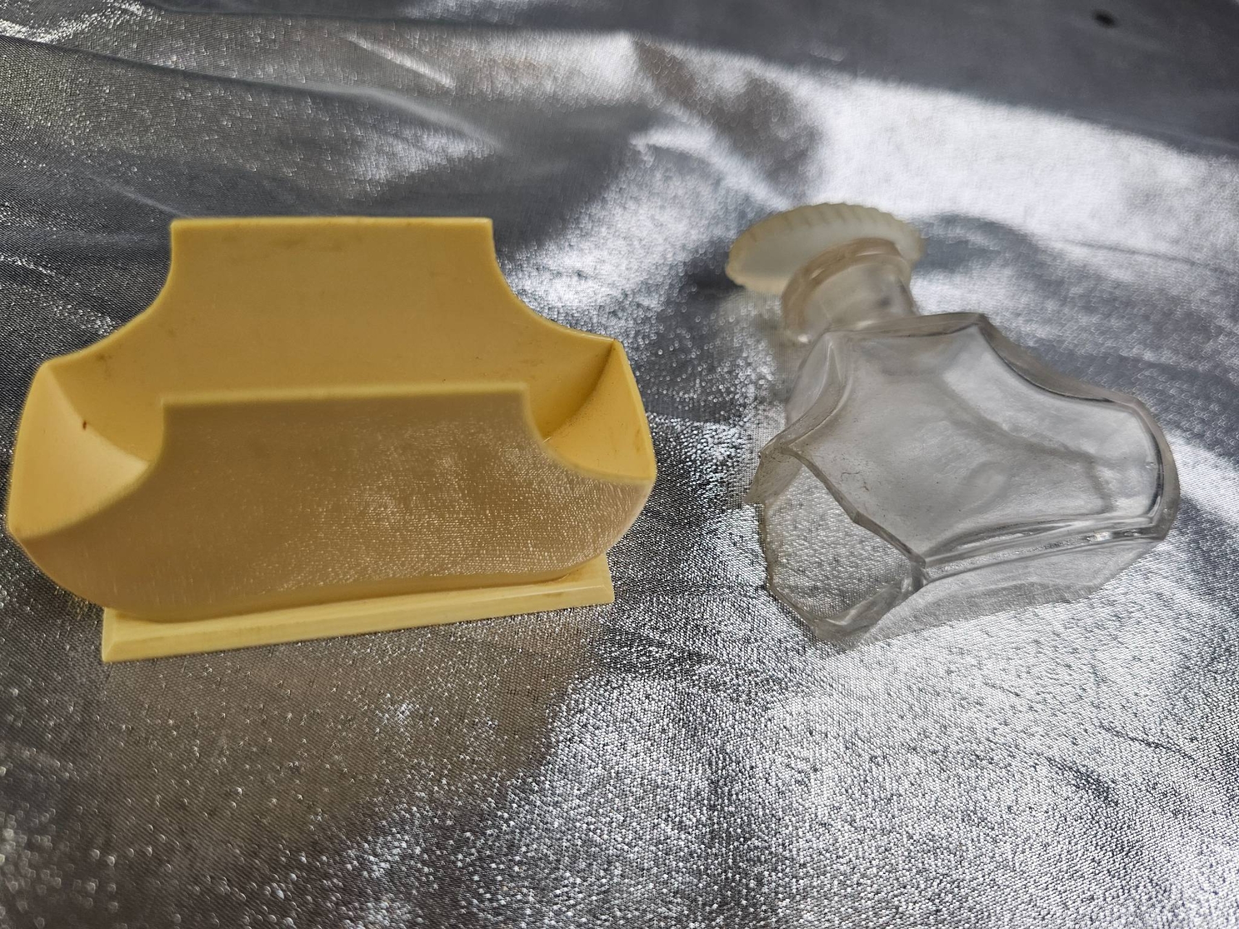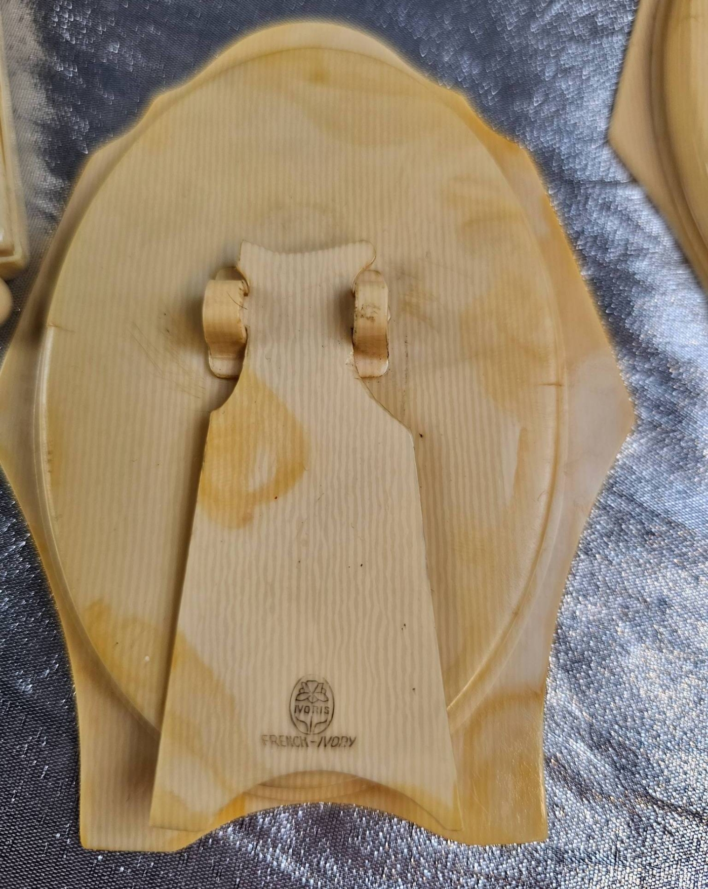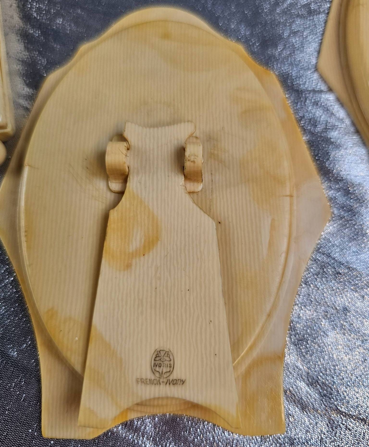 A curated assortment of French ivory vanity items and collectibles. The lot includes multiple photo frames, a perfume bottle with stopper, a pin cushion with drawer, and other miscellaneous items. Dimensions vary, with the pin cushion drawer approximately 4.5 inches wide and the goblet standing about 6 inches tall. Signs of age and wear are evident, including discoloration and minor imperfections, adding character to the set.