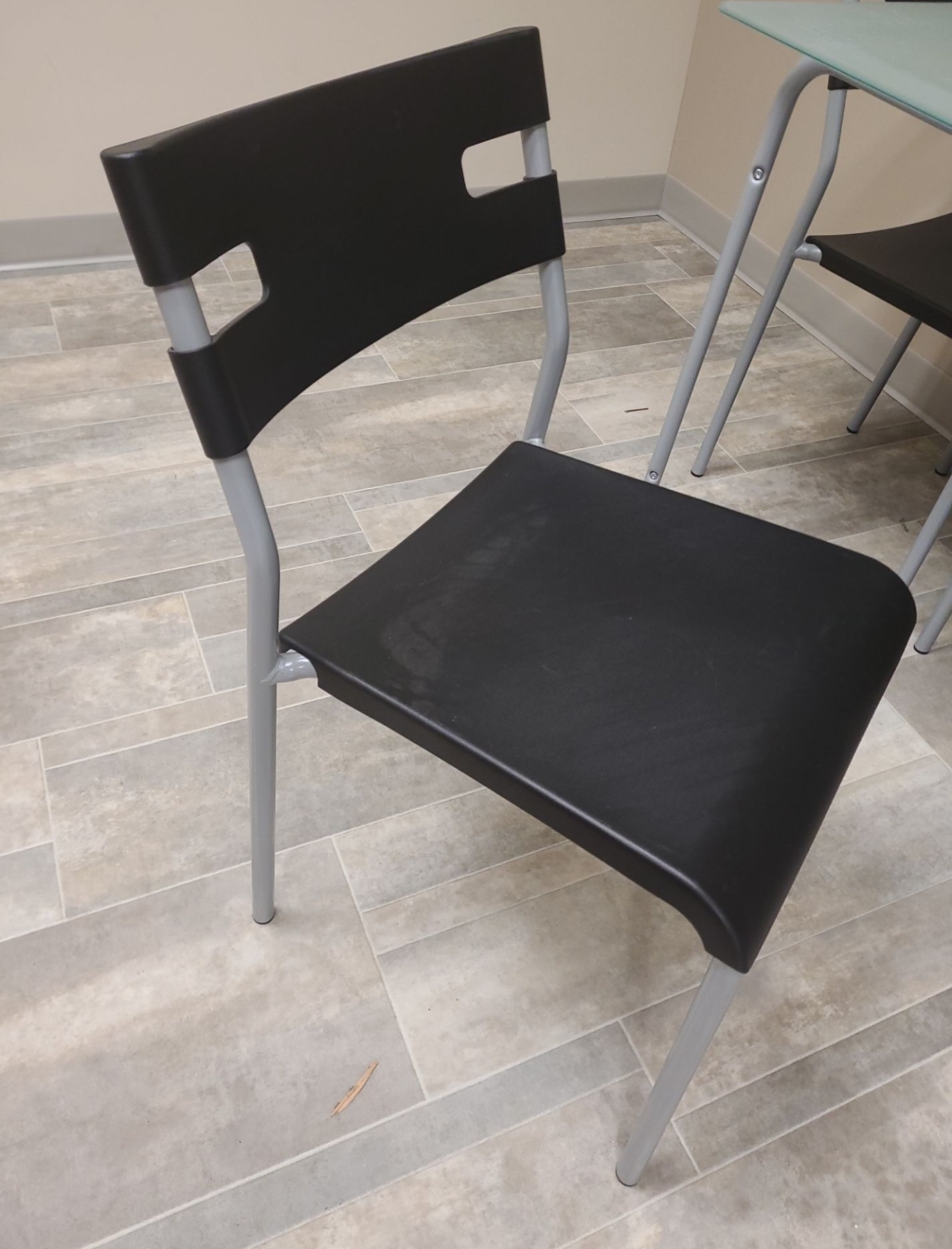 Frosted Glass Table 43 W, 30 D, 29 T and 4 Metal/ Plastic Chairs 16 W, 16 D, 30 T