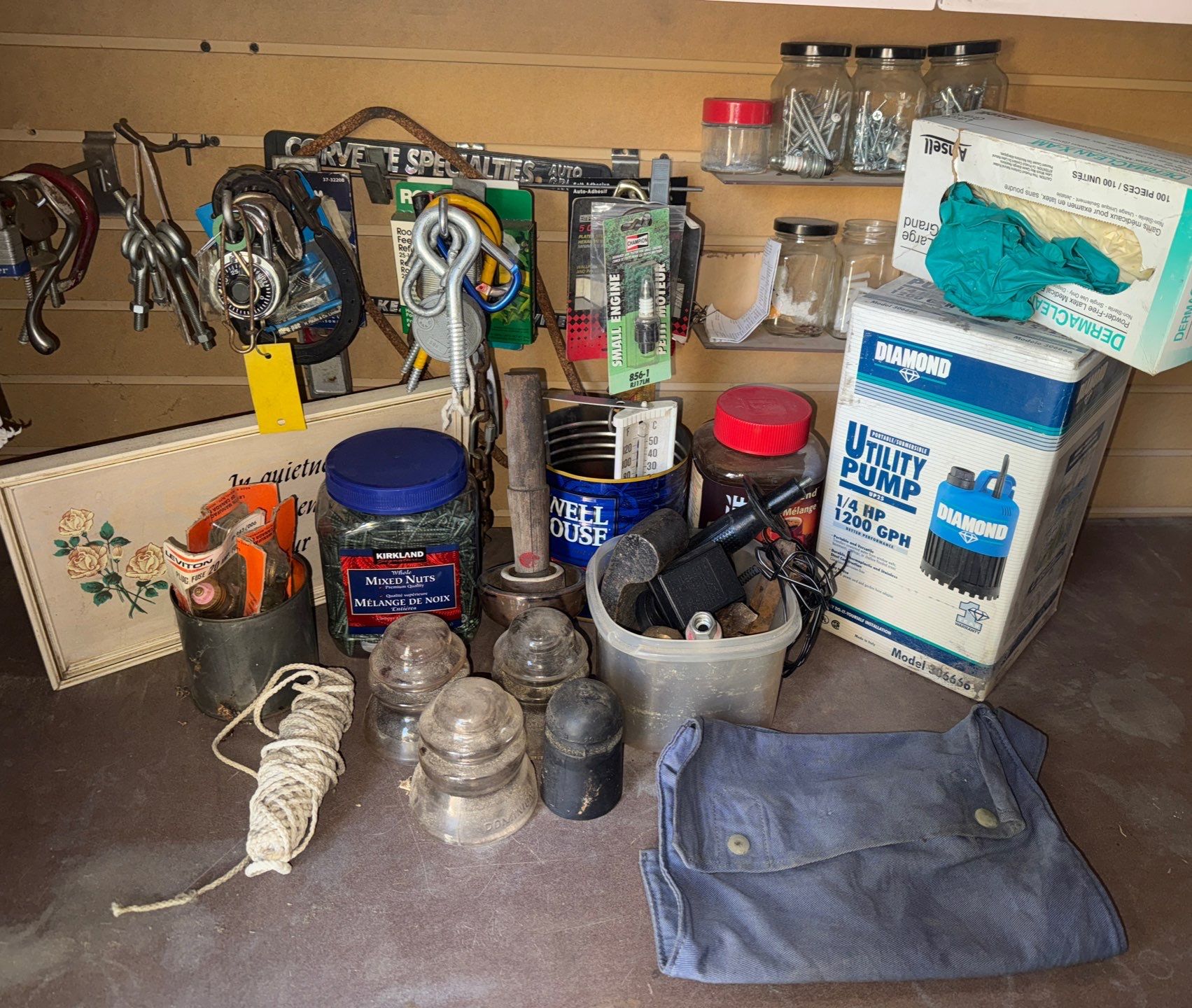 Gadget Haul of Shop miscellaneous items- Utility pump, Hooks, Insulators ++