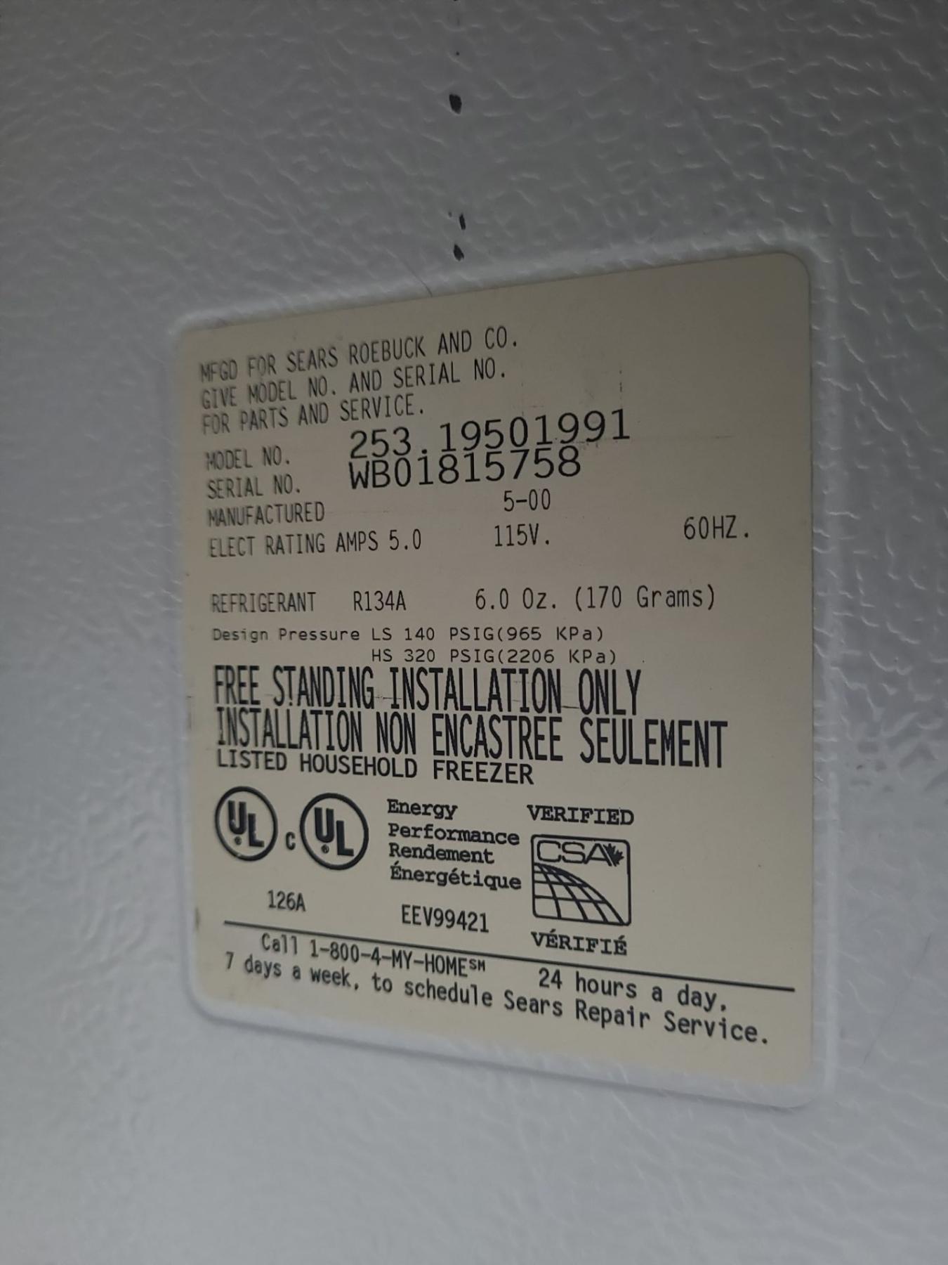 Galaxy Freezer Model 253.19501991, Defrosted, Bring Assistance