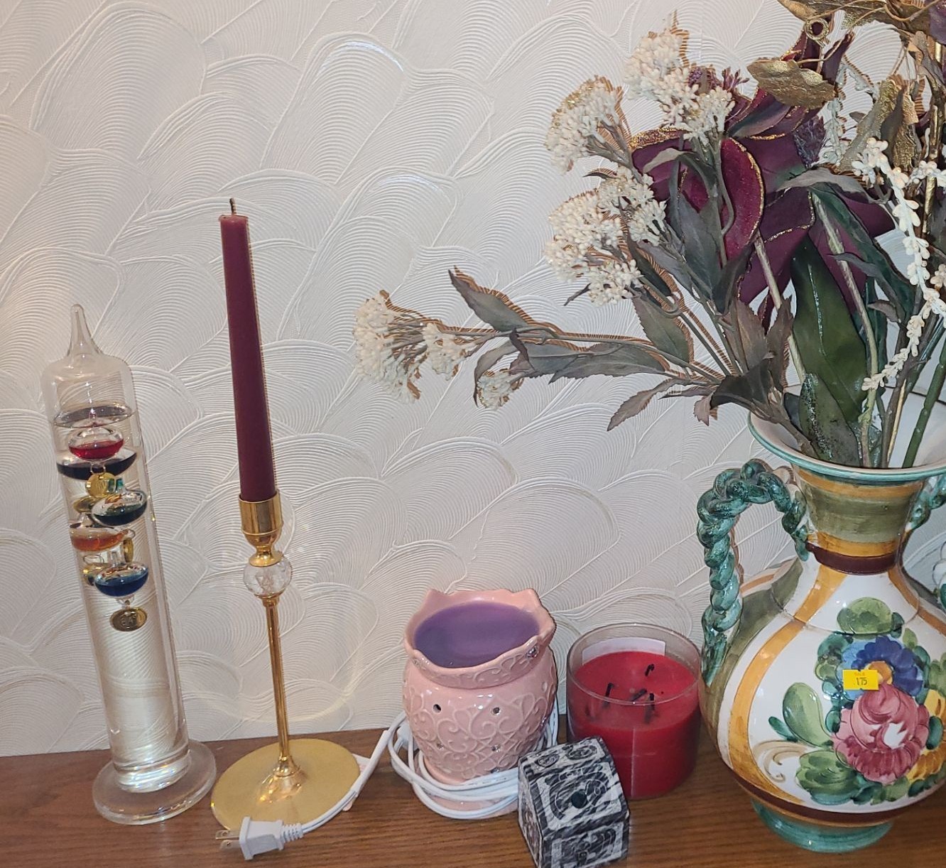 Galileo Thermometer, Wax Warmer, Pitcher 12 T, Tassel Candlesticks, Greenery- Tallest in Vase: 31 T