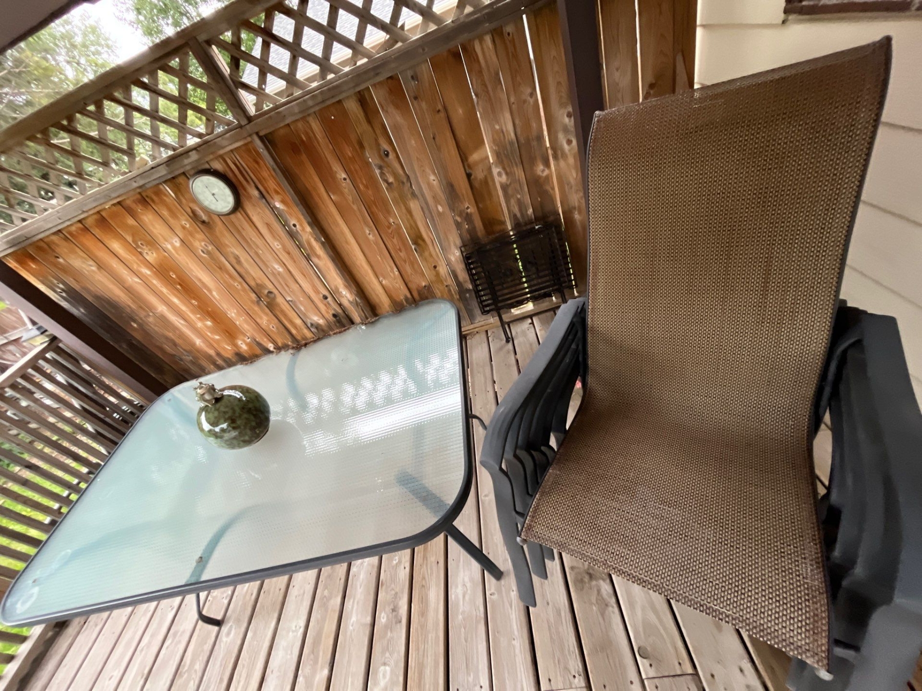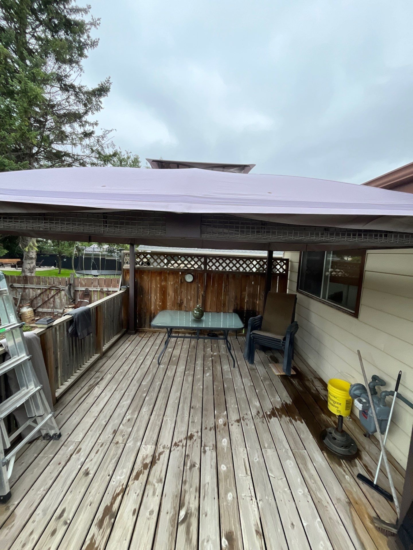 Gazebo with privacy tent, mosquito netting, and patio table with six chairs
