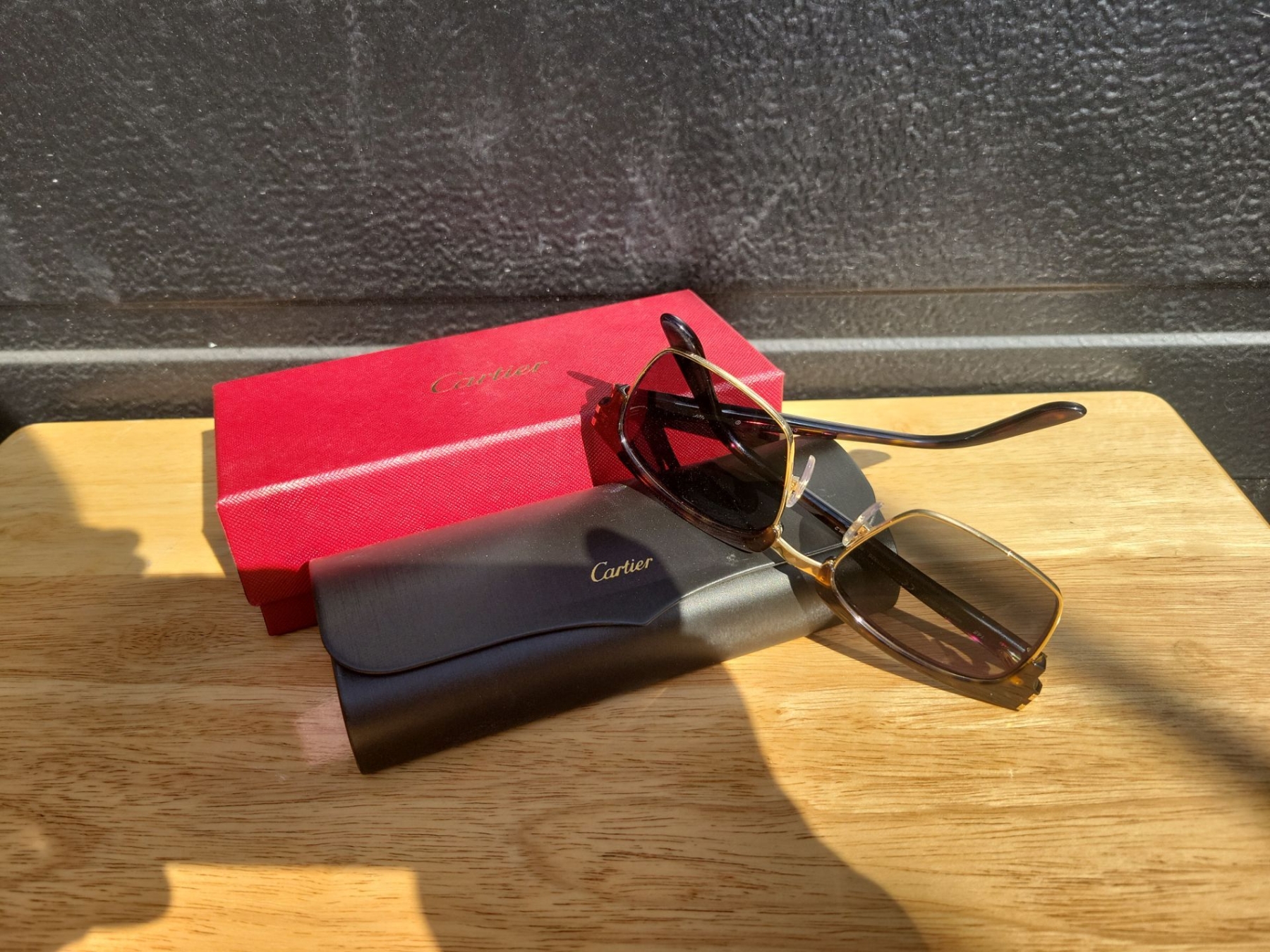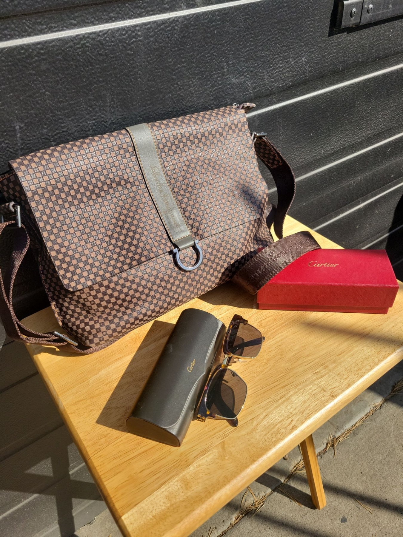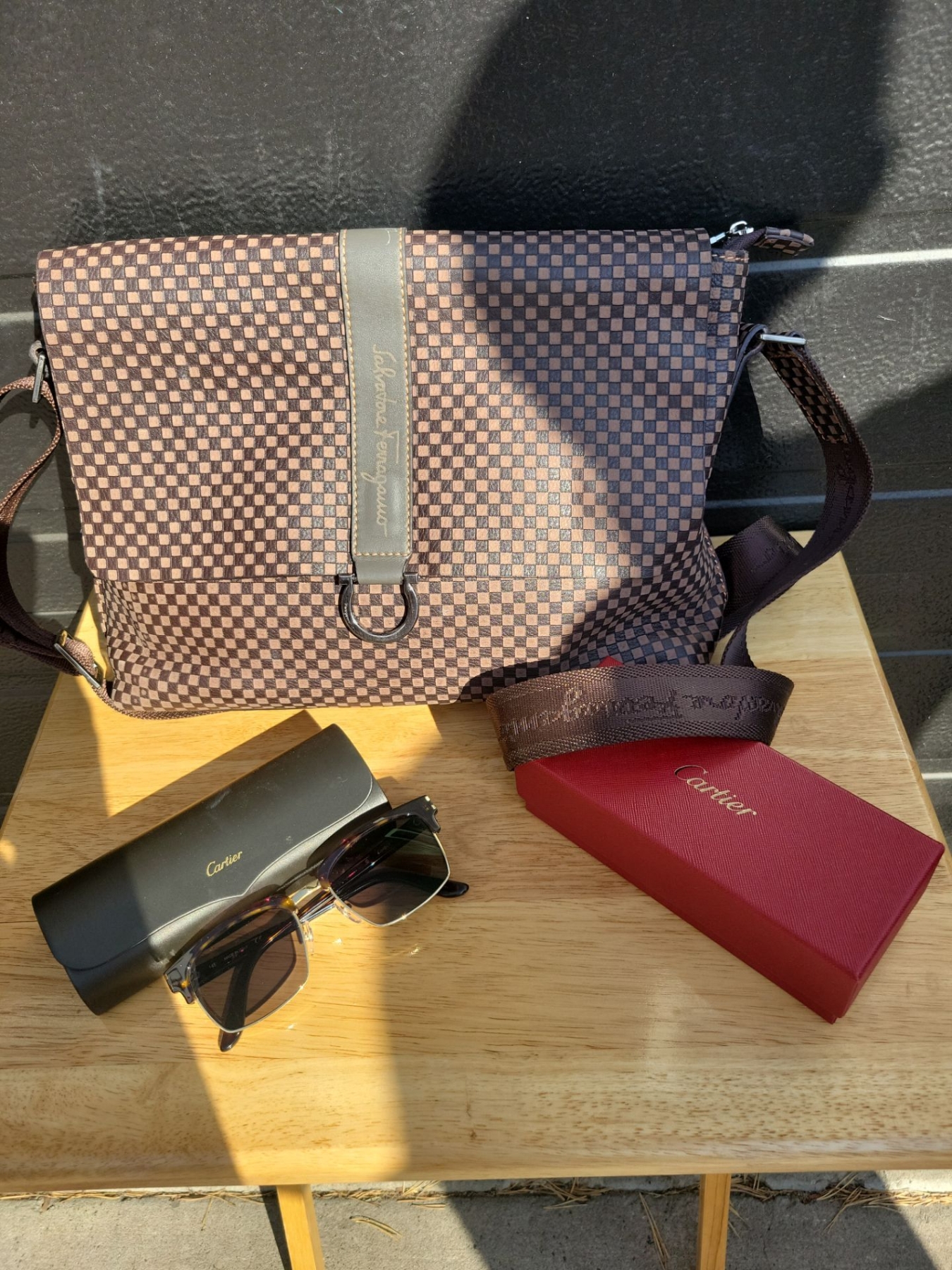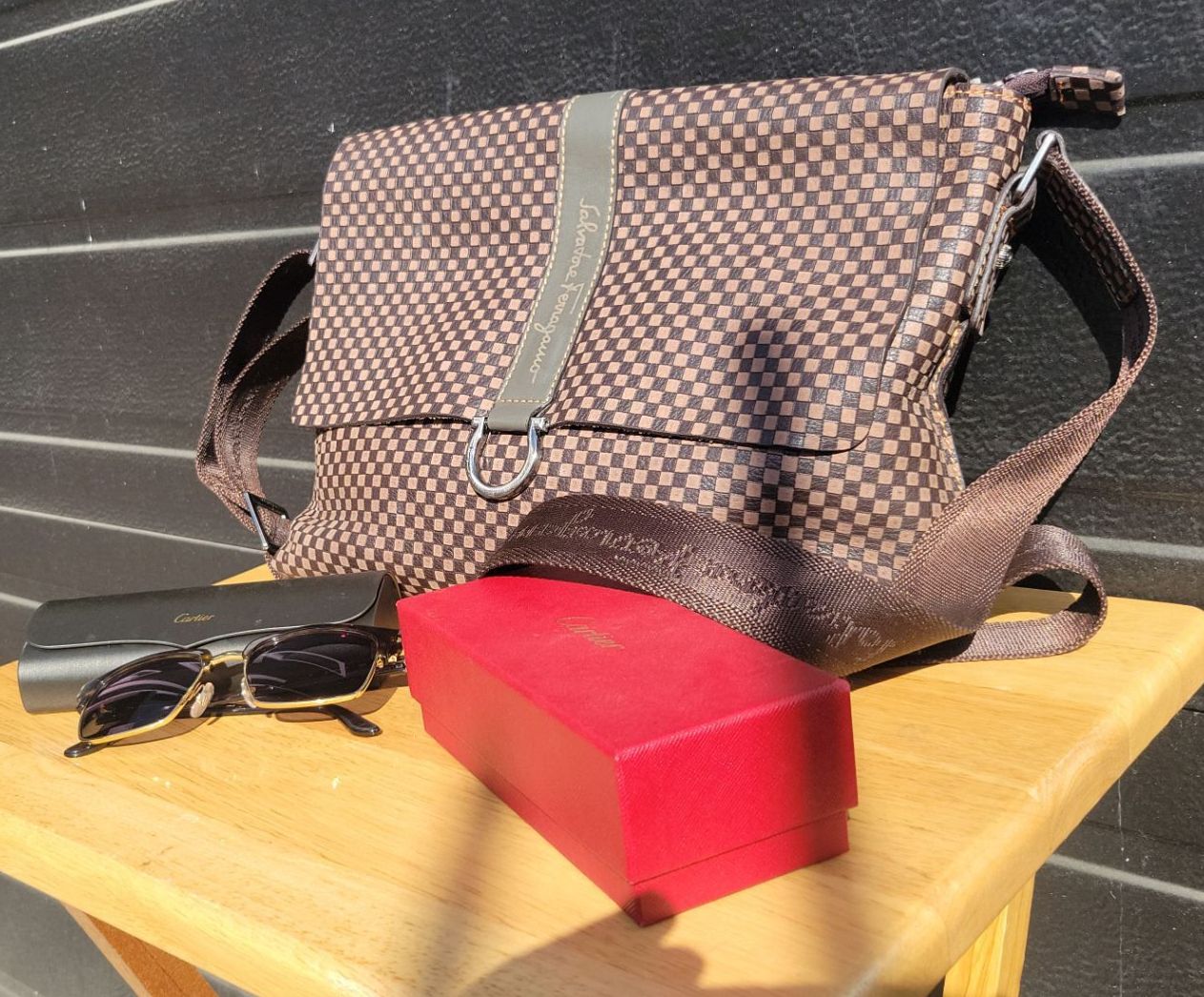 Genuine Leather Salvador Ferragamo Messenger Bag w/ Cartier Sun Glasses