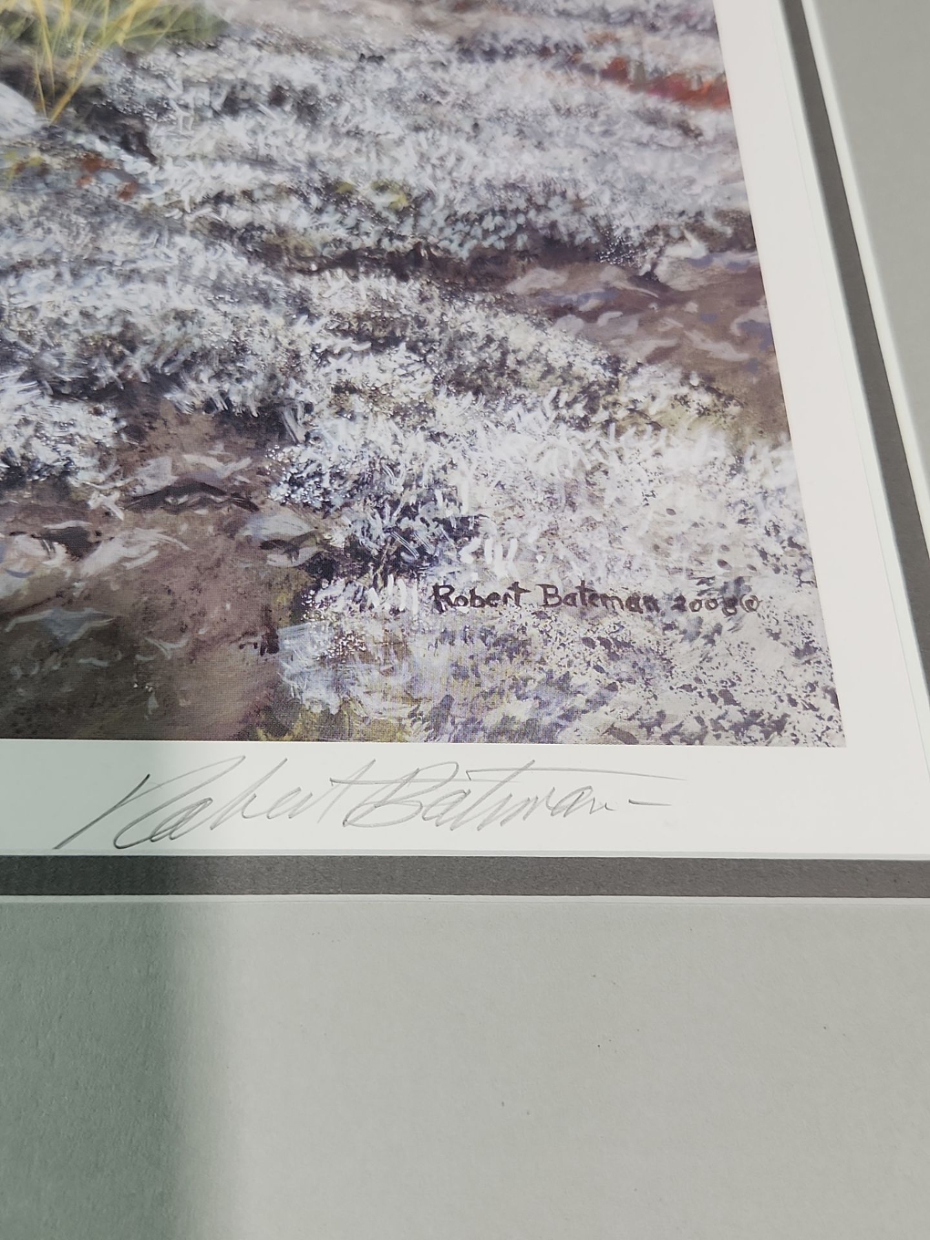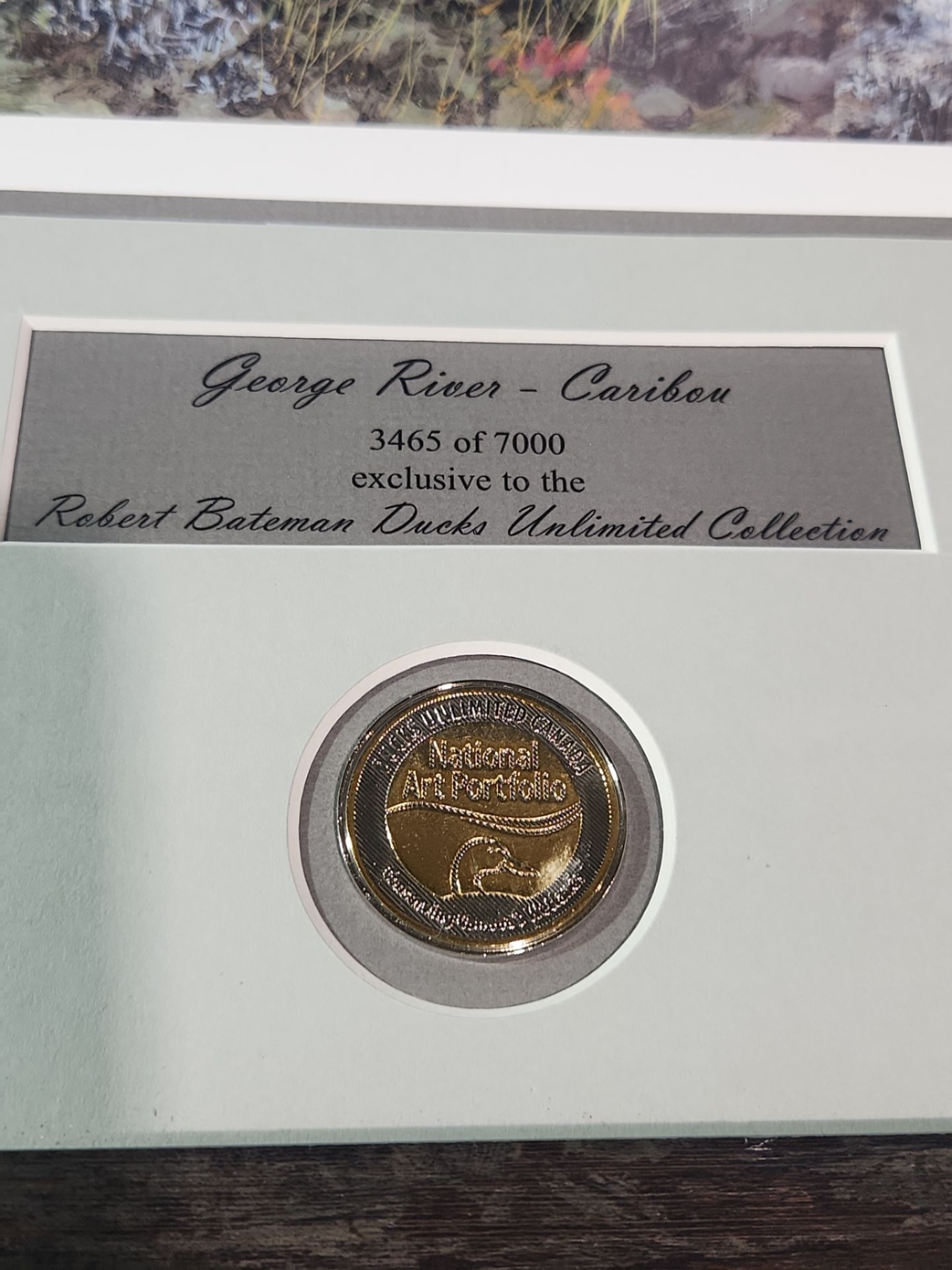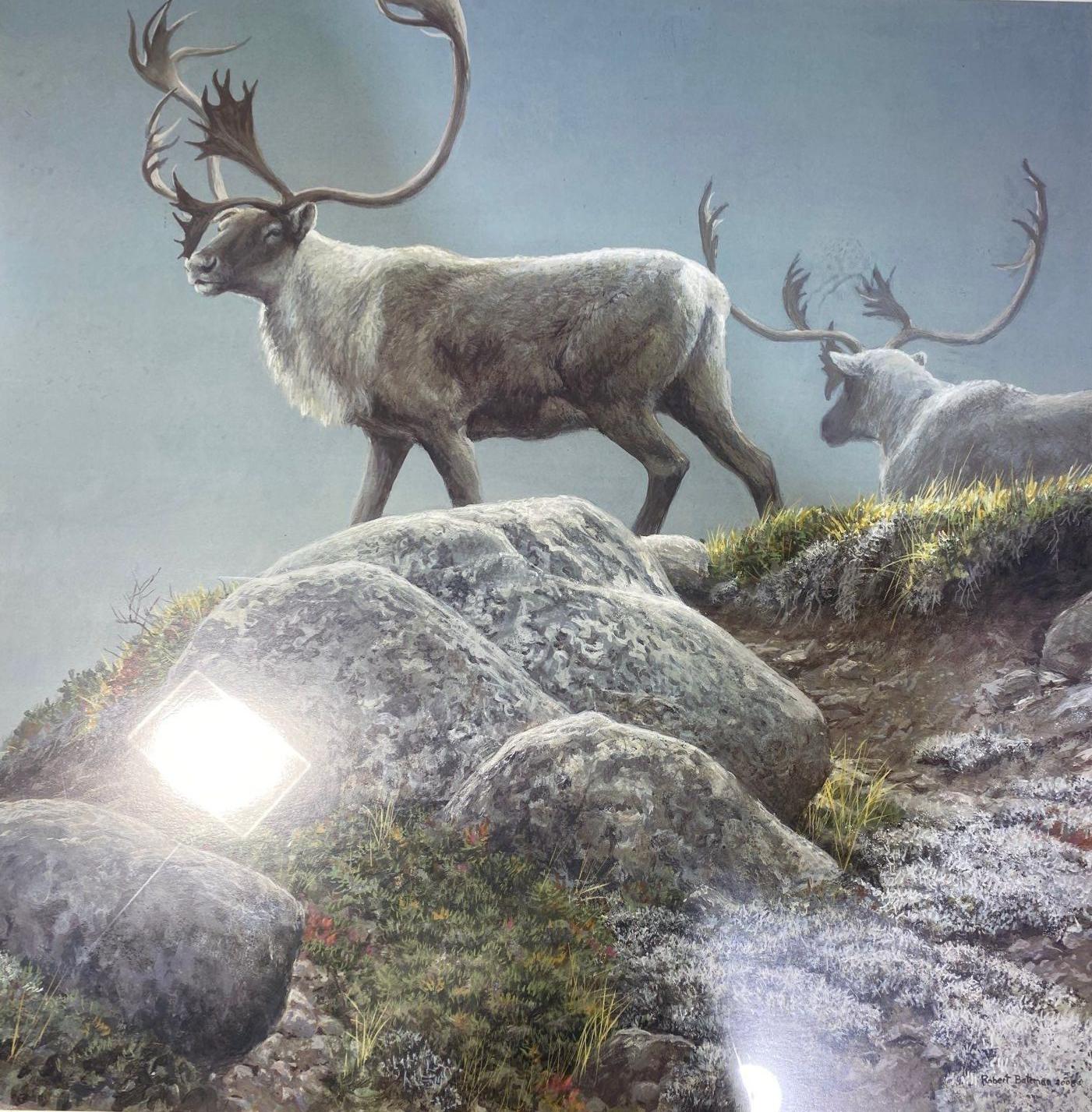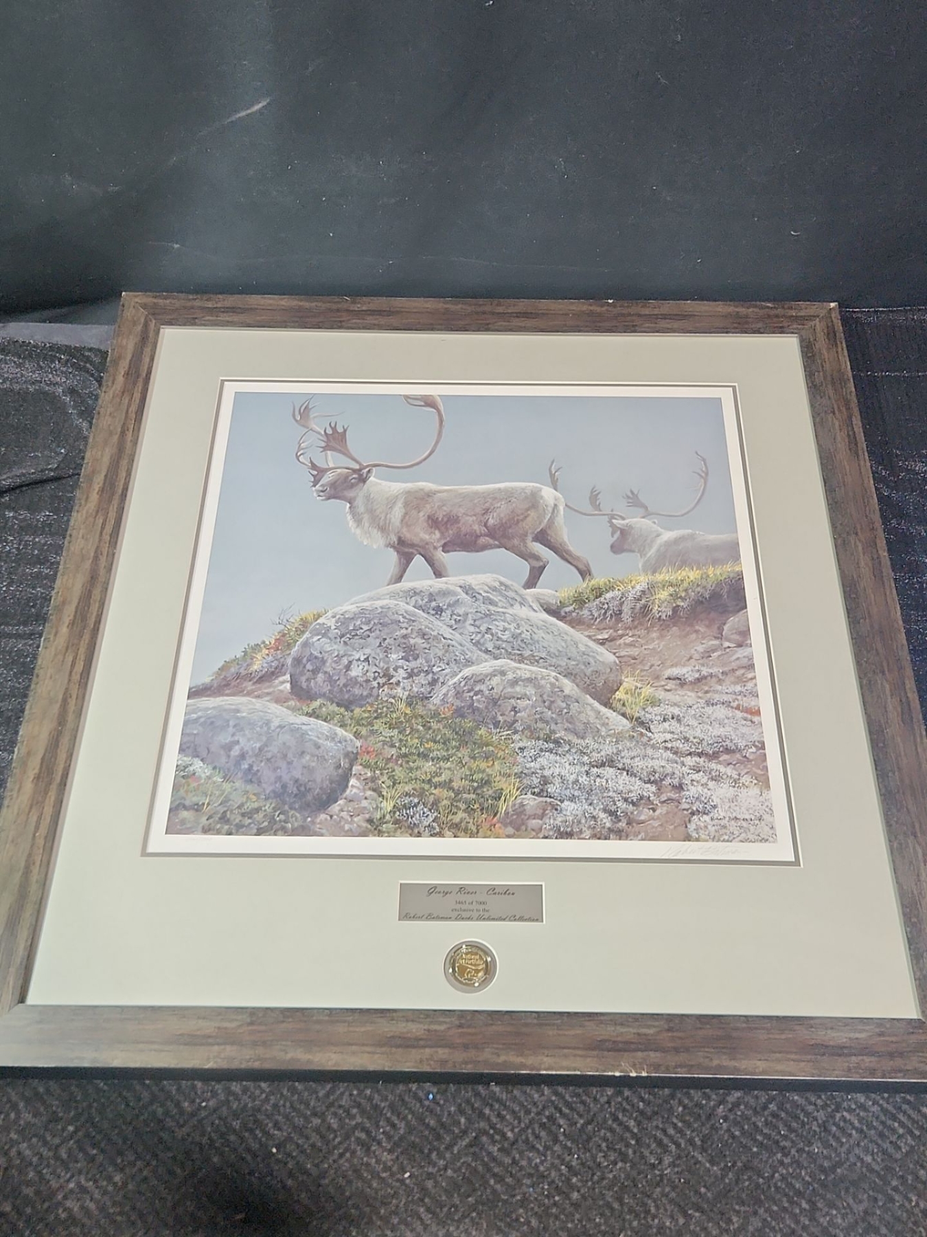 This is framed , signed print of the artwork "George River Caribou " by artist Robert Bateman. The George River Caribou are a specific herd or caribou found in North America.