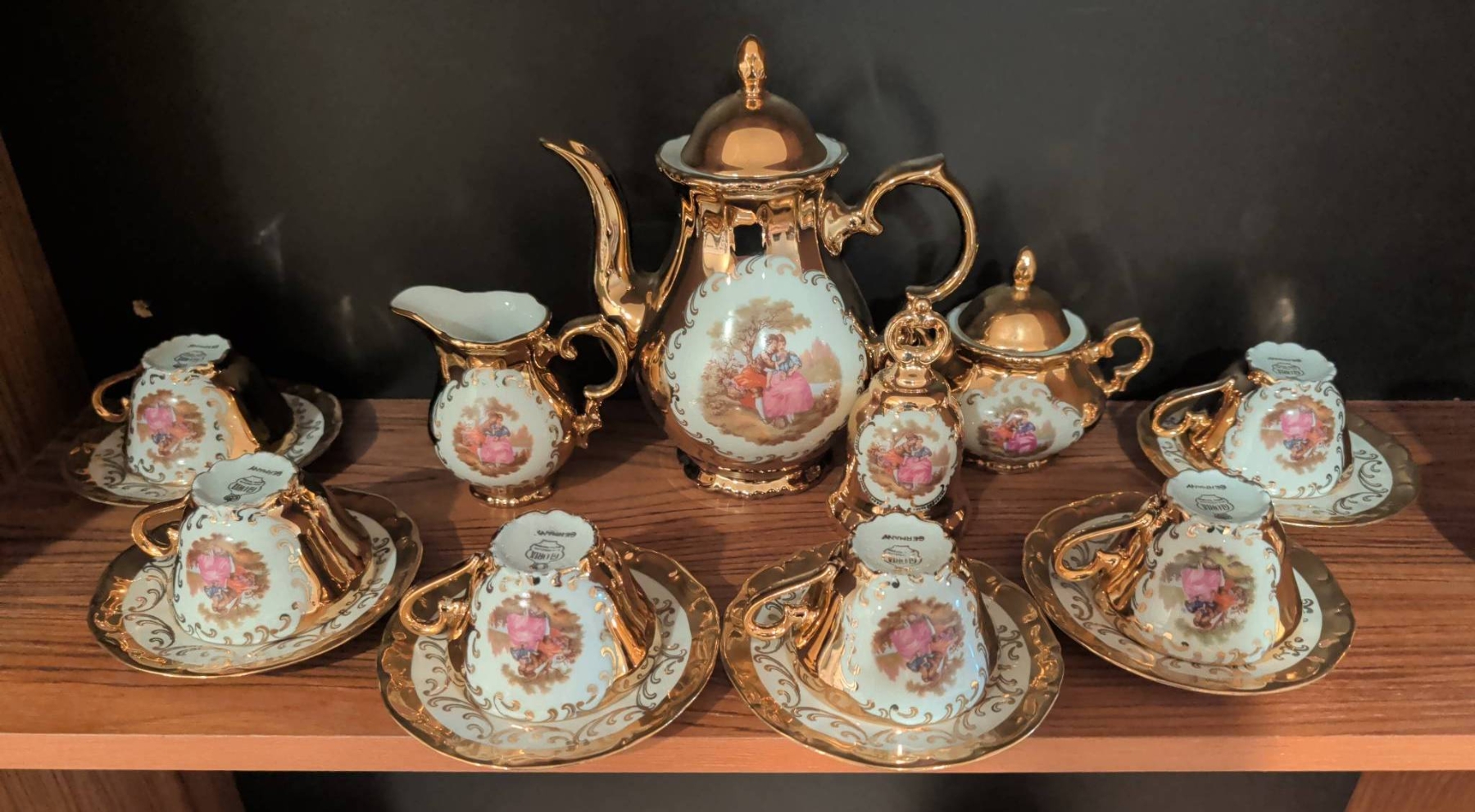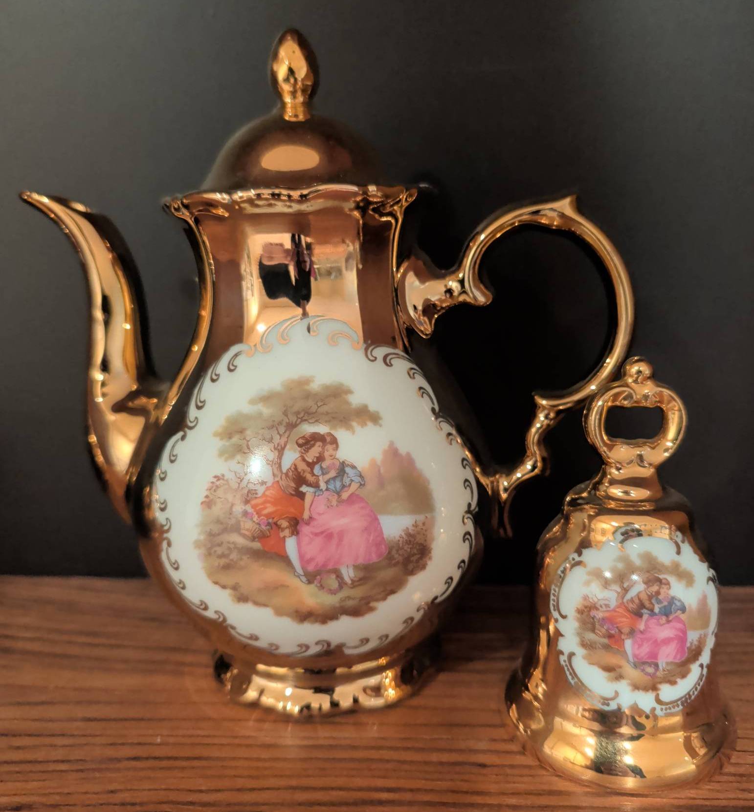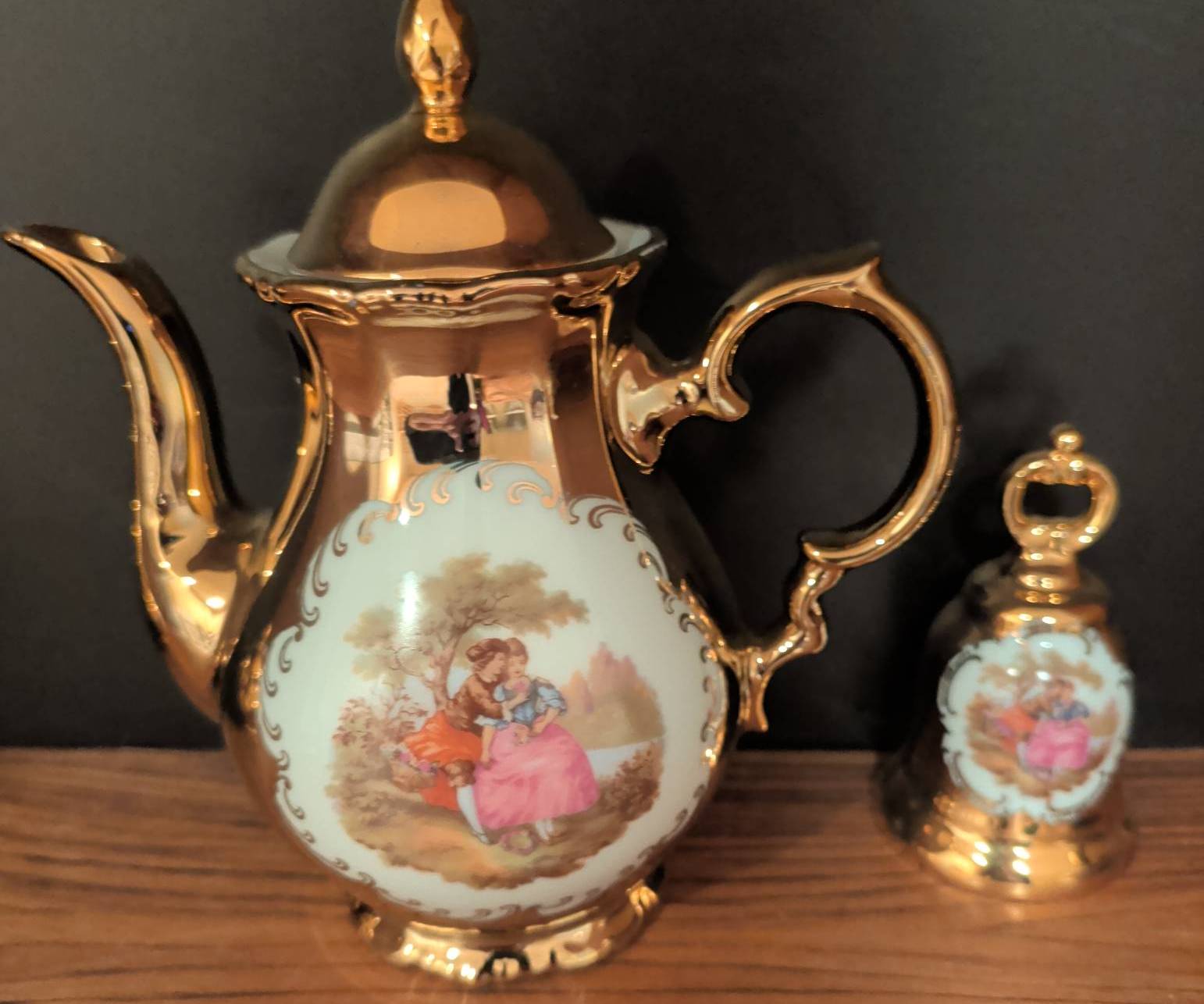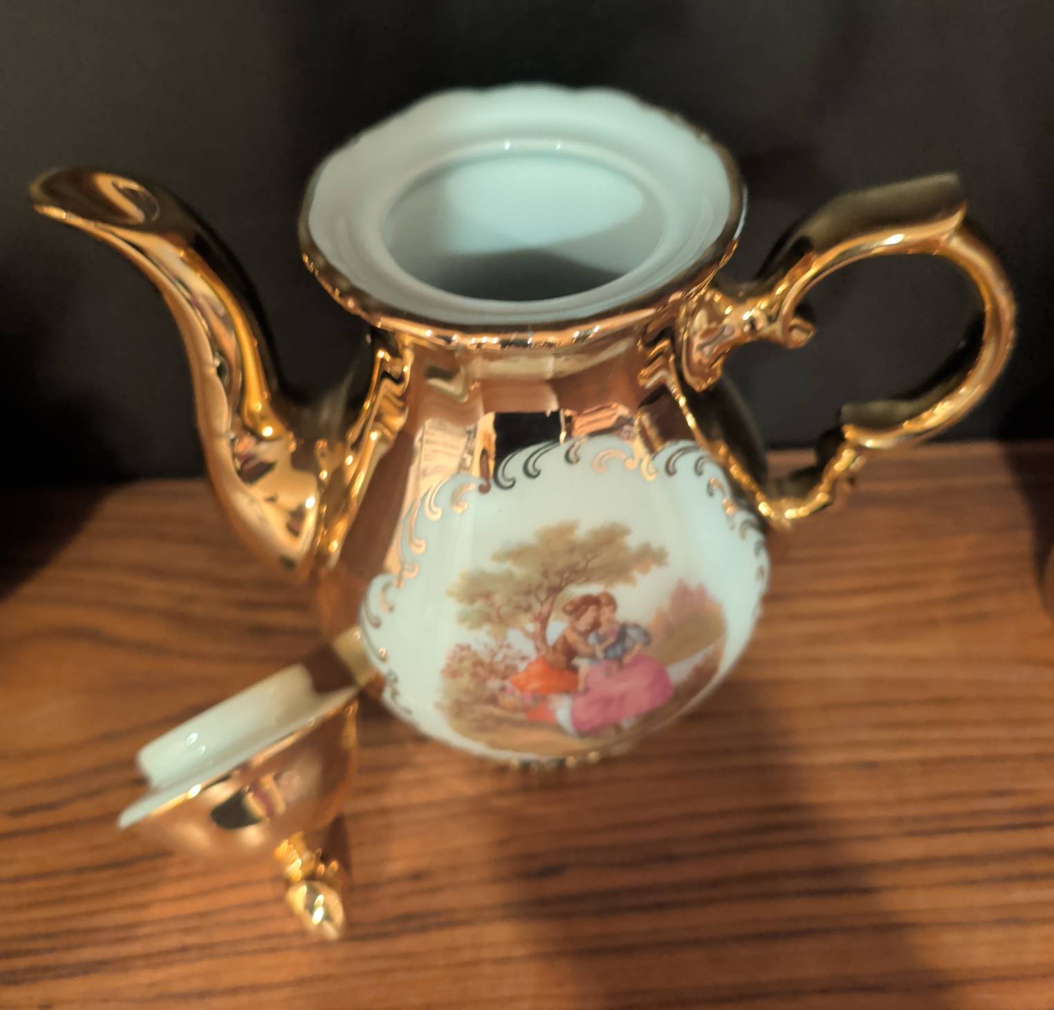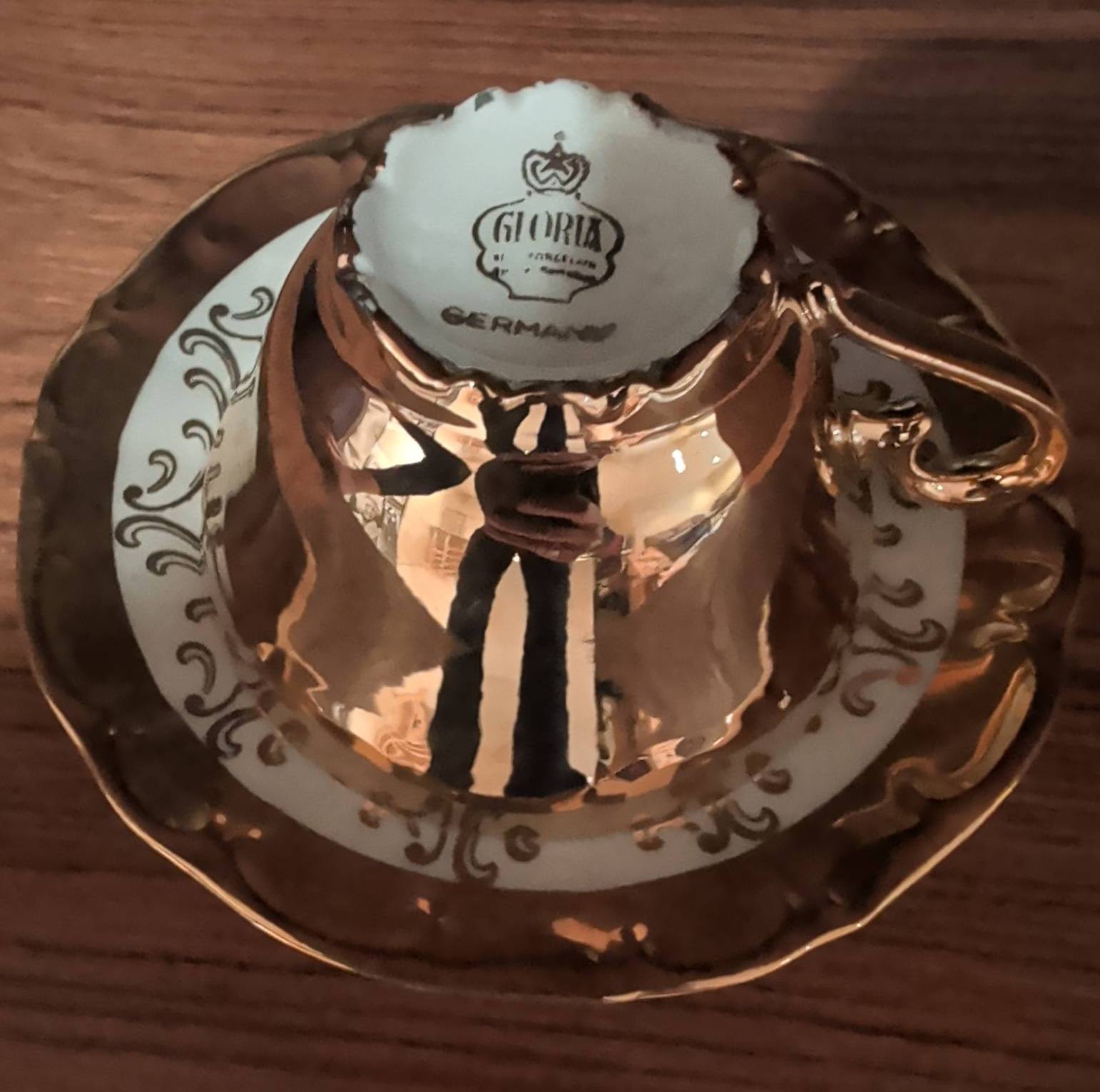 Elegant German ‘Gloria’ porcelain tea set with gilded accents, romantic painted scenes, and intricate scroll patterns. Includes six teacups, saucers, a teapot, sugar bowl, creamer, and a decorative bell. Accompanied by Royal Chelsea ‘Golden Rose’ English Bone China with gilded rose designs, containing a small plate and bowl ensemble. Items stamped to indicate origin (‘Germany’ and ‘England’) showcase quality craftsmanship.
