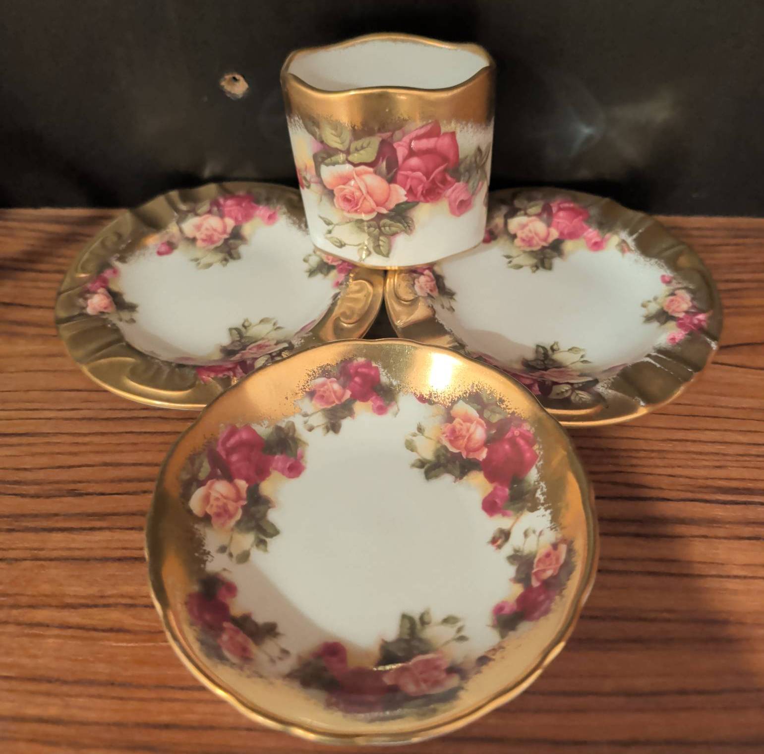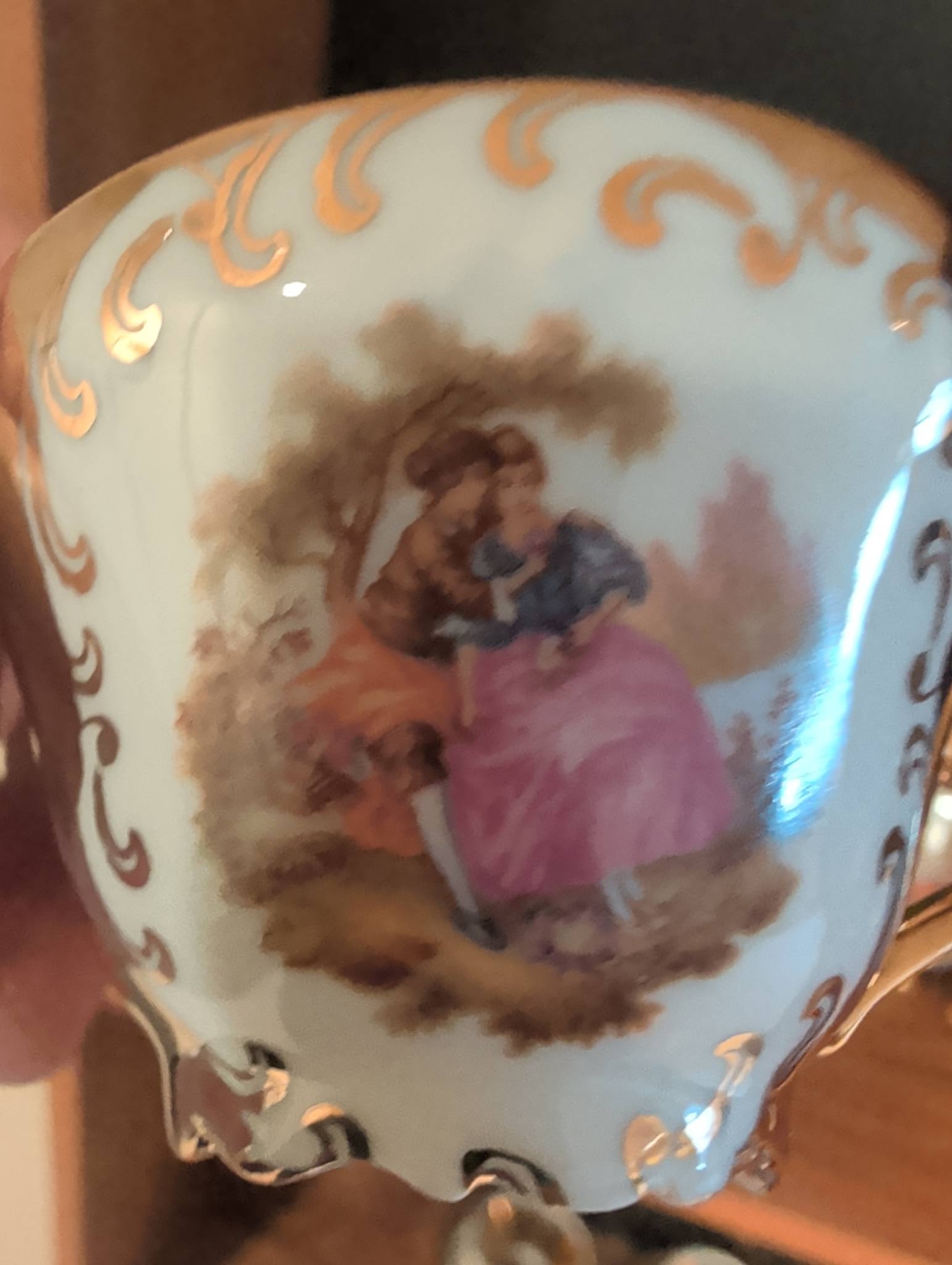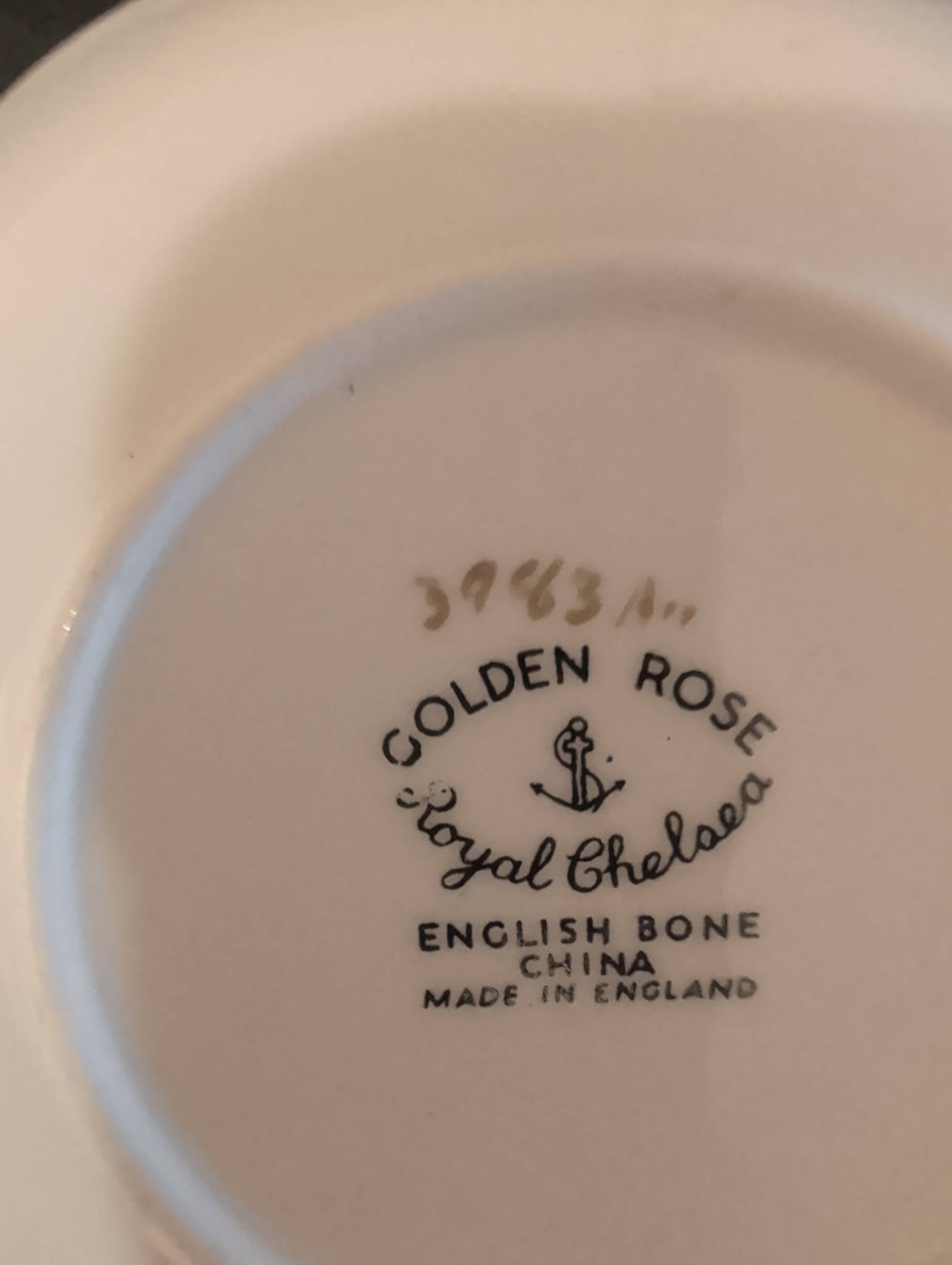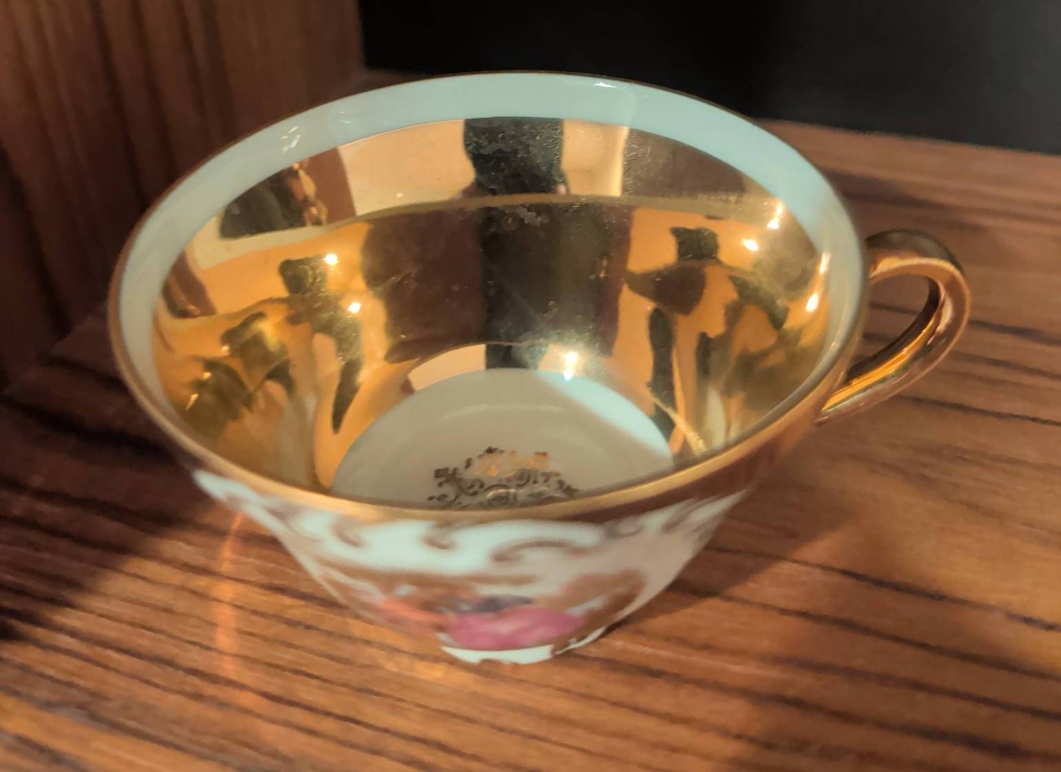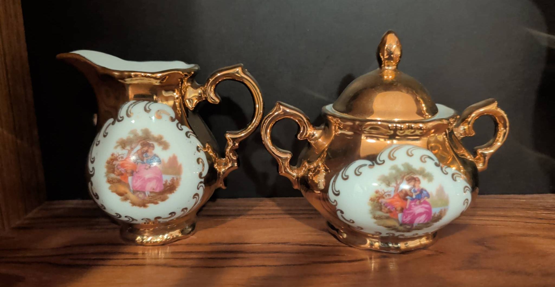 Elegant German ‘Gloria’ porcelain tea set with gilded accents, romantic painted scenes, and intricate scroll patterns. Includes six teacups, saucers, a teapot, sugar bowl, creamer, and a decorative bell. Accompanied by Royal Chelsea ‘Golden Rose’ English Bone China with gilded rose designs, containing a small plate and bowl ensemble. Items stamped to indicate origin (‘Germany’ and ‘England’) showcase quality craftsmanship.