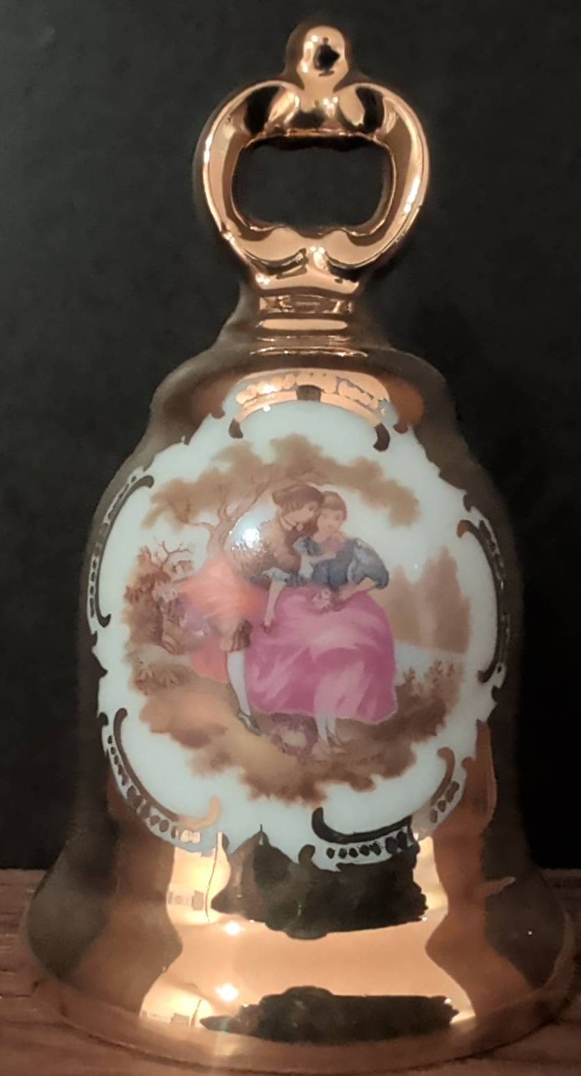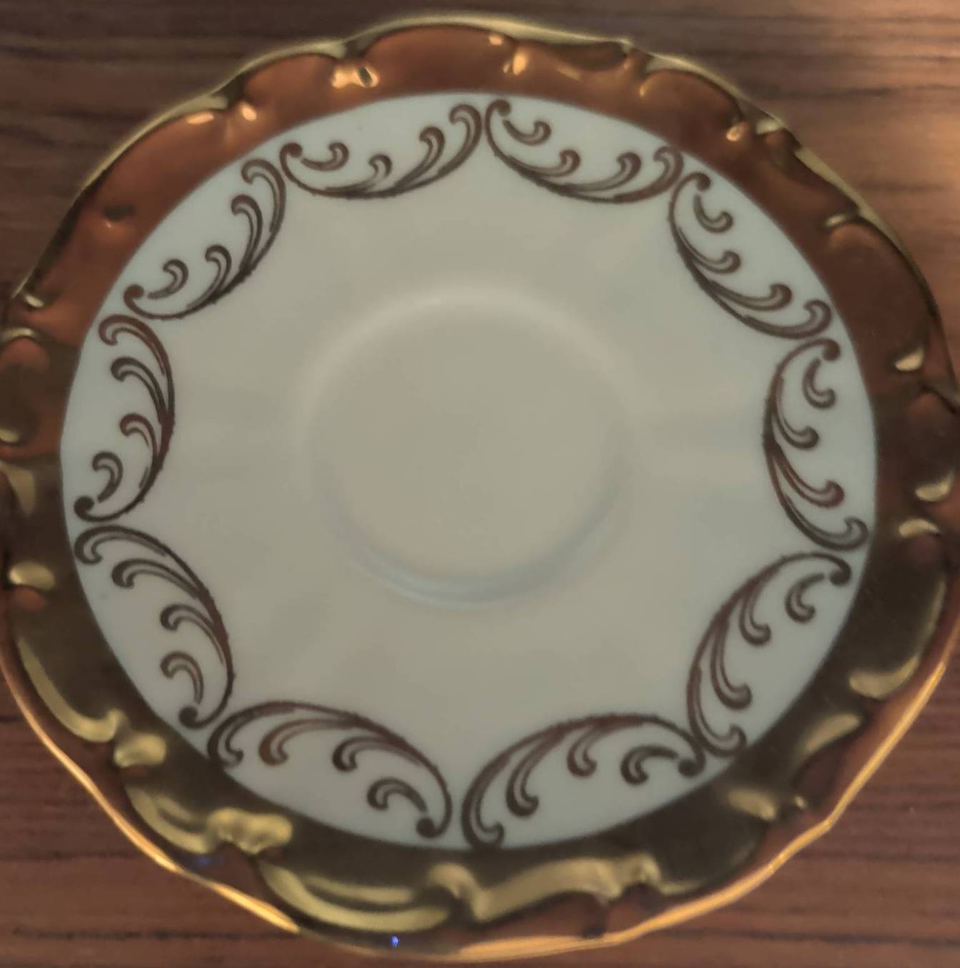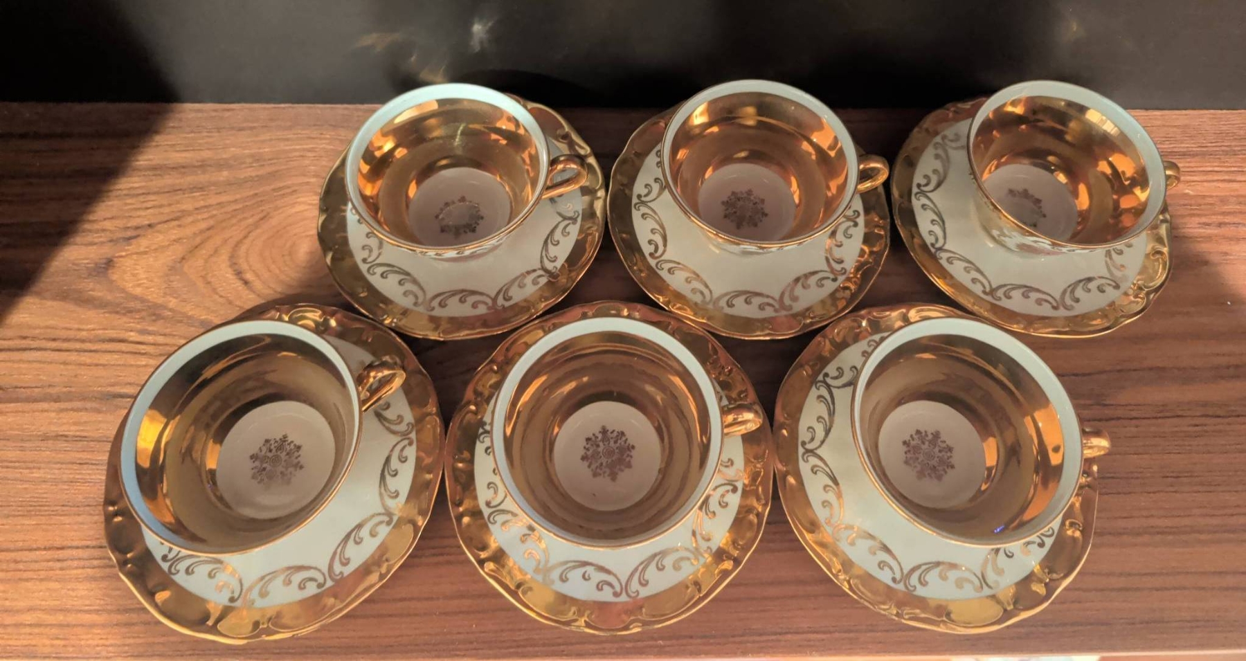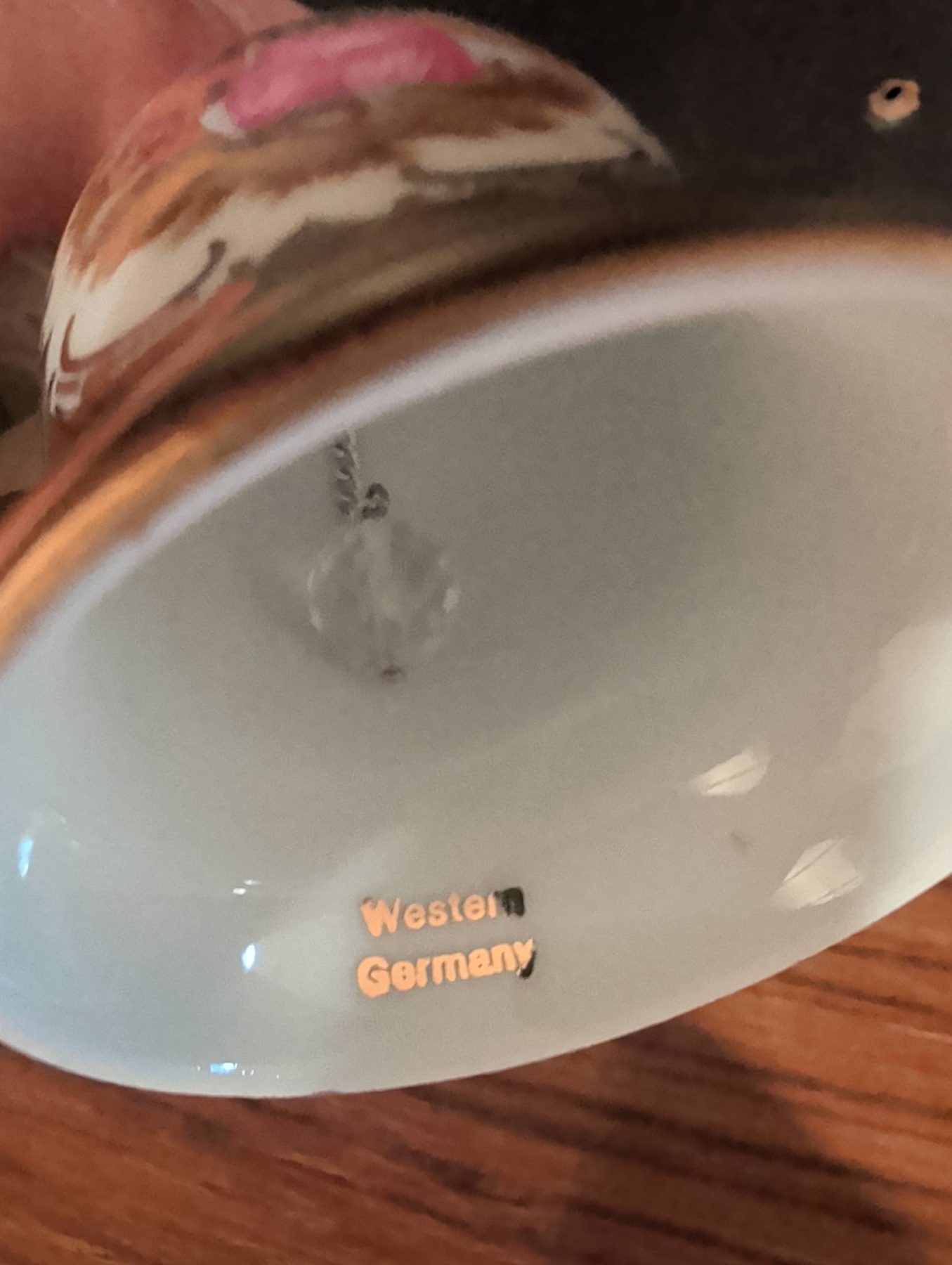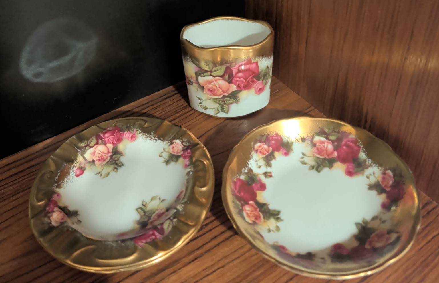 Elegant German ‘Gloria’ porcelain tea set with gilded accents, romantic painted scenes, and intricate scroll patterns. Includes six teacups, saucers, a teapot, sugar bowl, creamer, and a decorative bell. Accompanied by Royal Chelsea ‘Golden Rose’ English Bone China with gilded rose designs, containing a small plate and bowl ensemble. Items stamped to indicate origin (‘Germany’ and ‘England’) showcase quality craftsmanship.