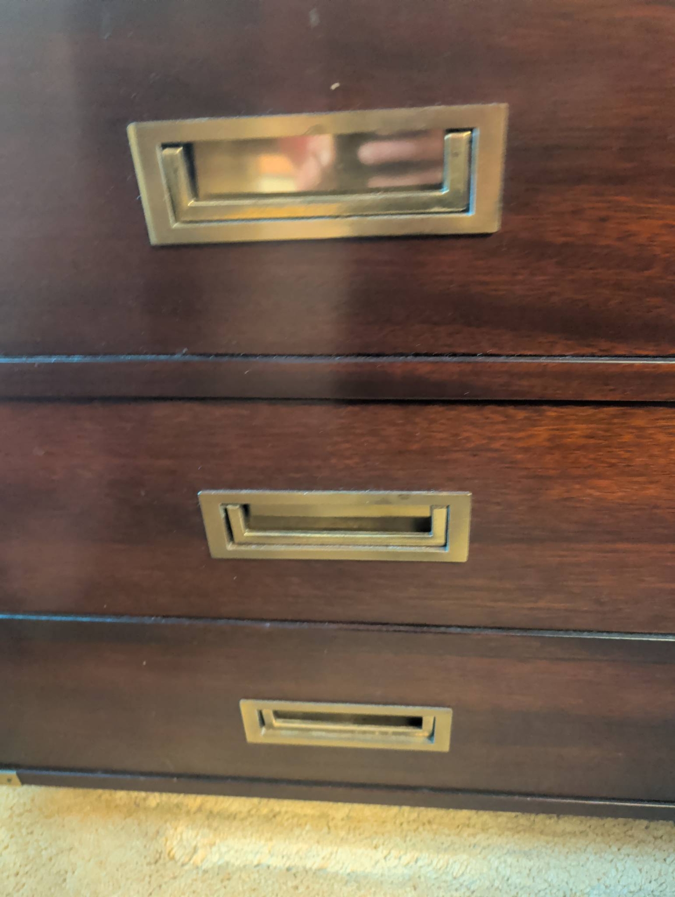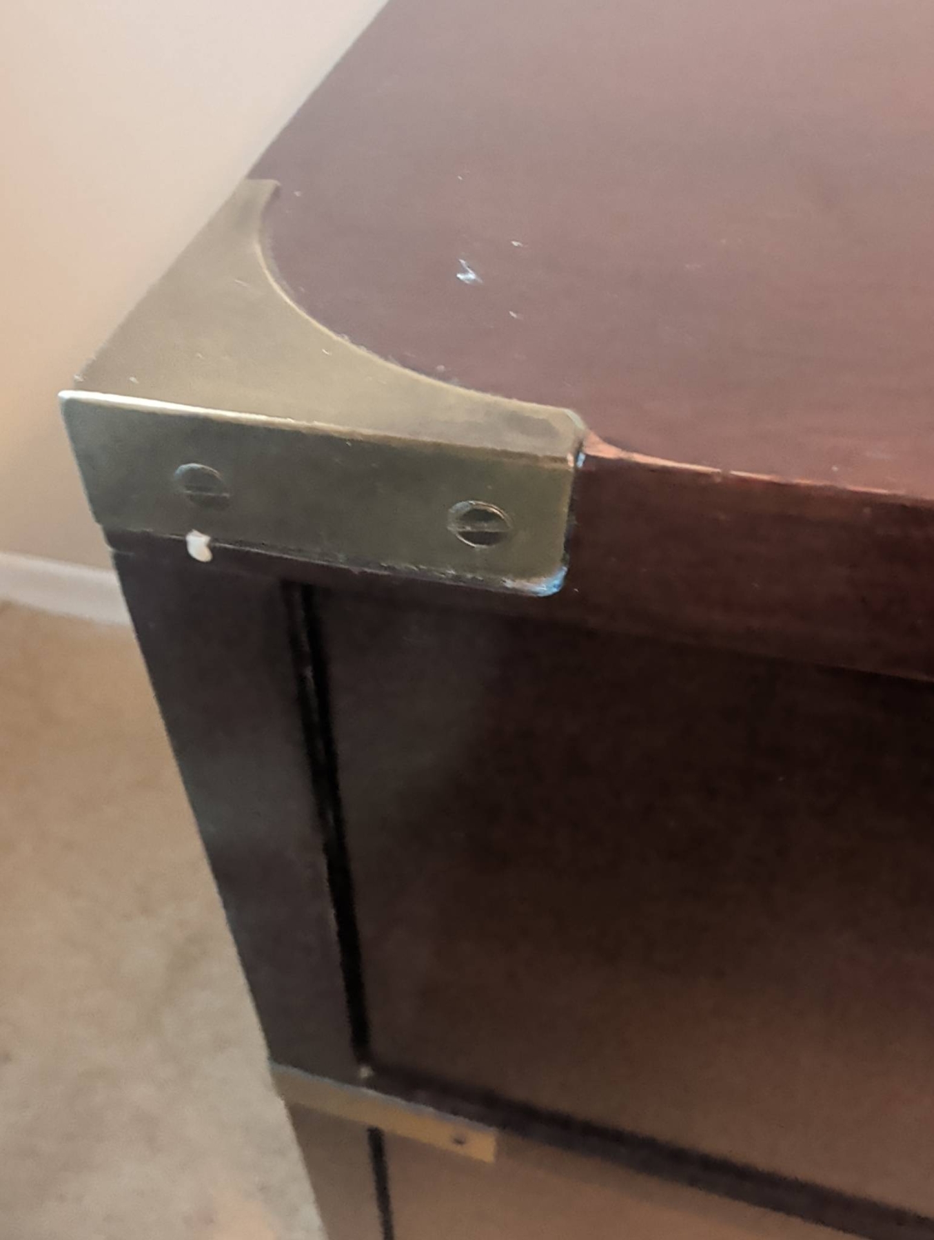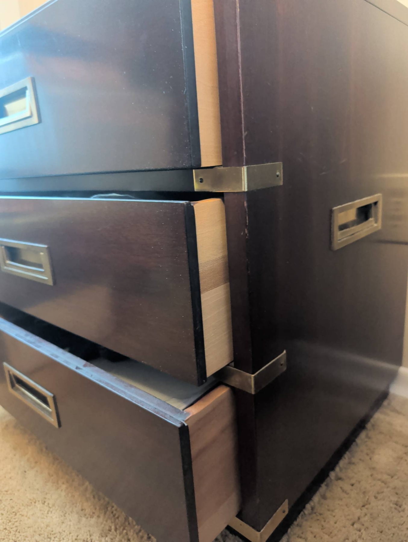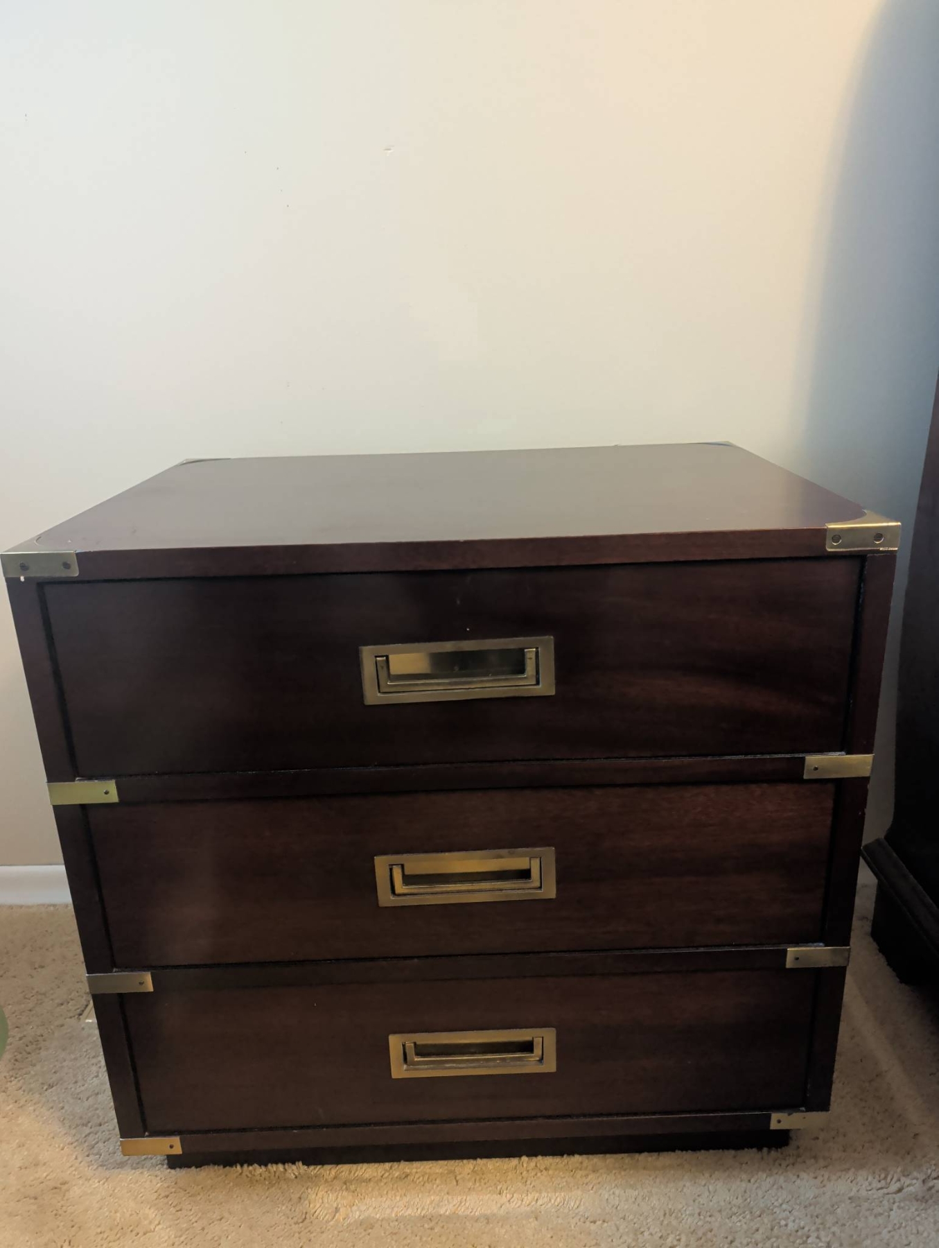 Wooden 3-drawer nightstand featuring a campaign-style design with stylish brass corner brackets and recessed handles. Constructed with a rich dark finish supported by sturdy rectangular form. Dimensions are approximately 24 inches wide, 18 inches deep, and 24 inches high. Some minor wear is visible on the brass and wood, consistent with age and normal use, adding character to this piece.