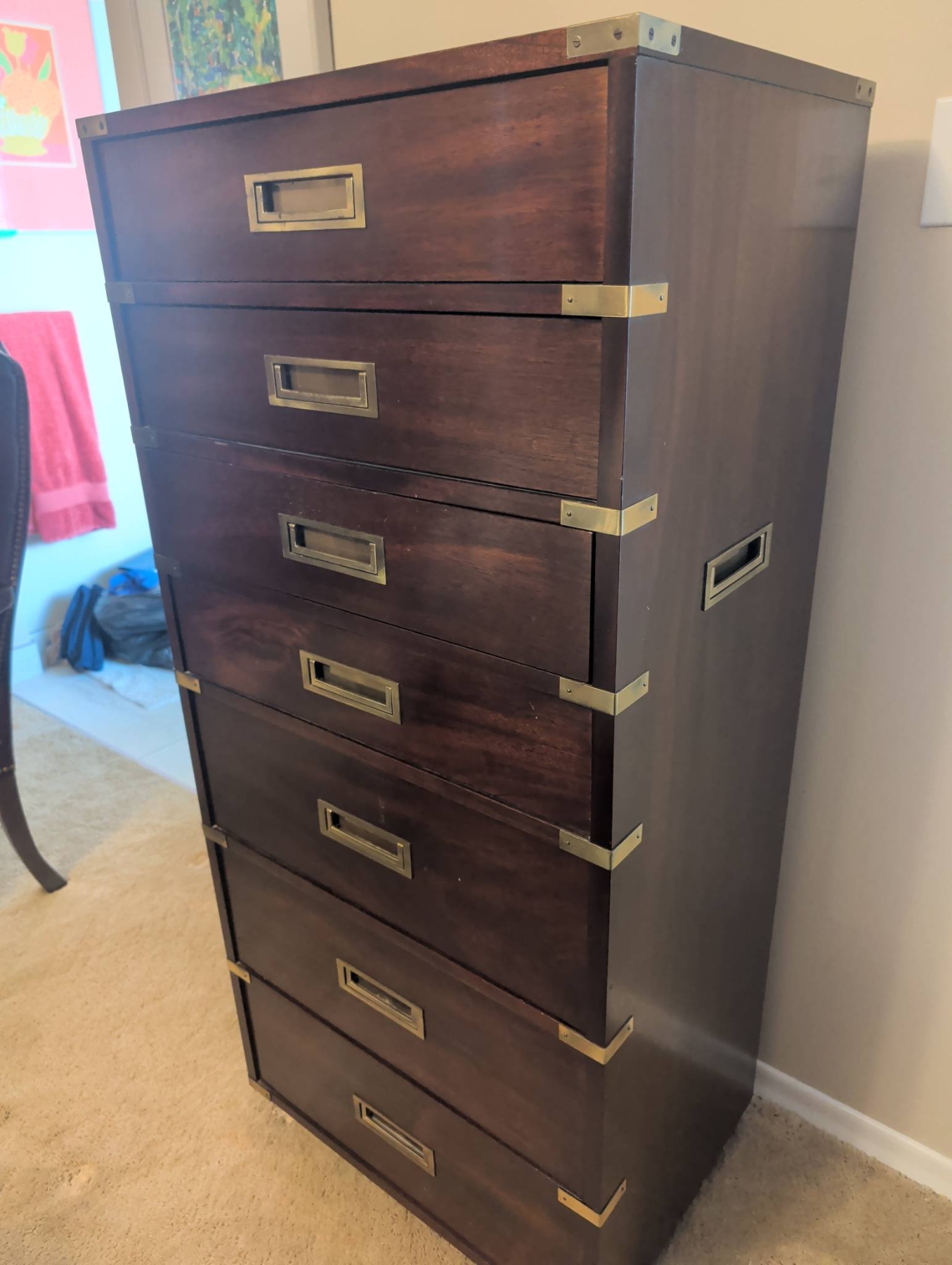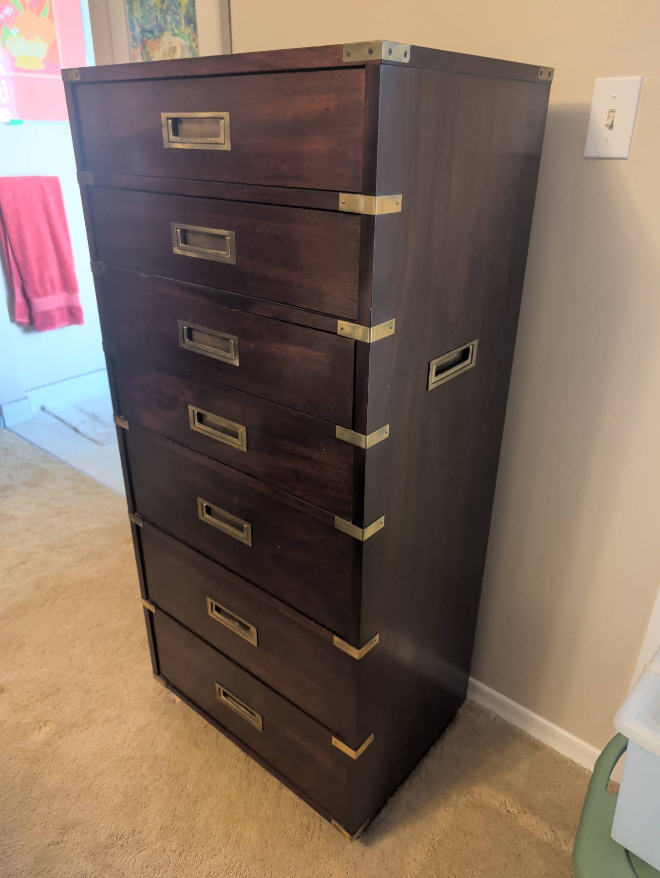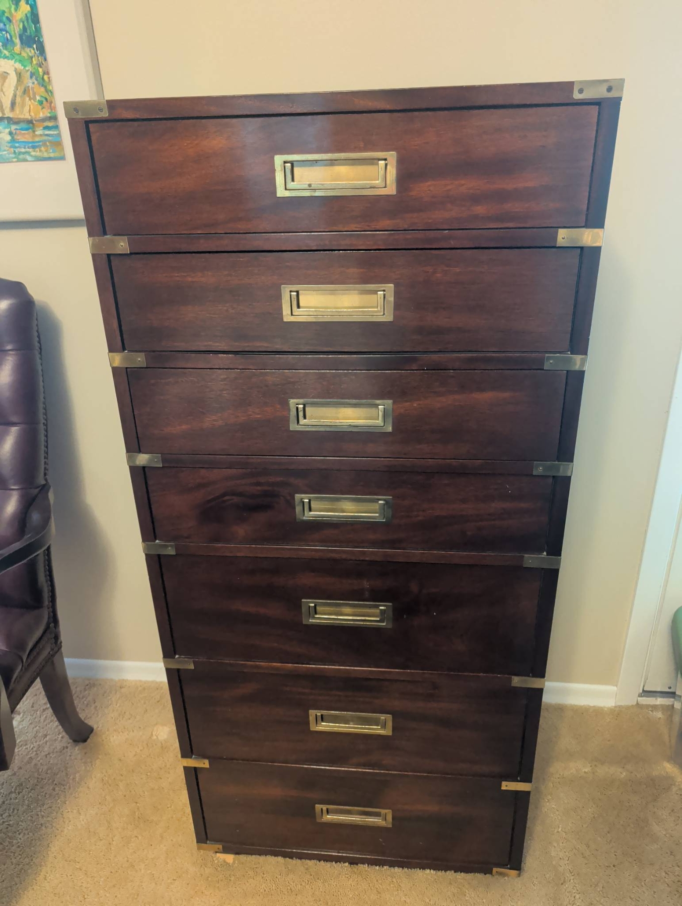 Gibbard Craftsmen seven-drawer tall chest in a campaign-style design, featuring rich wood construction and brass accents, including corner brackets, inset drawer pulls, and side handles. The chest provides ample storage space with its seven smooth-gliding drawers. Dimensions: approximately 55 inches tall, 24 inches wide, and 18 inches deep. A functional and elegant storage solution.