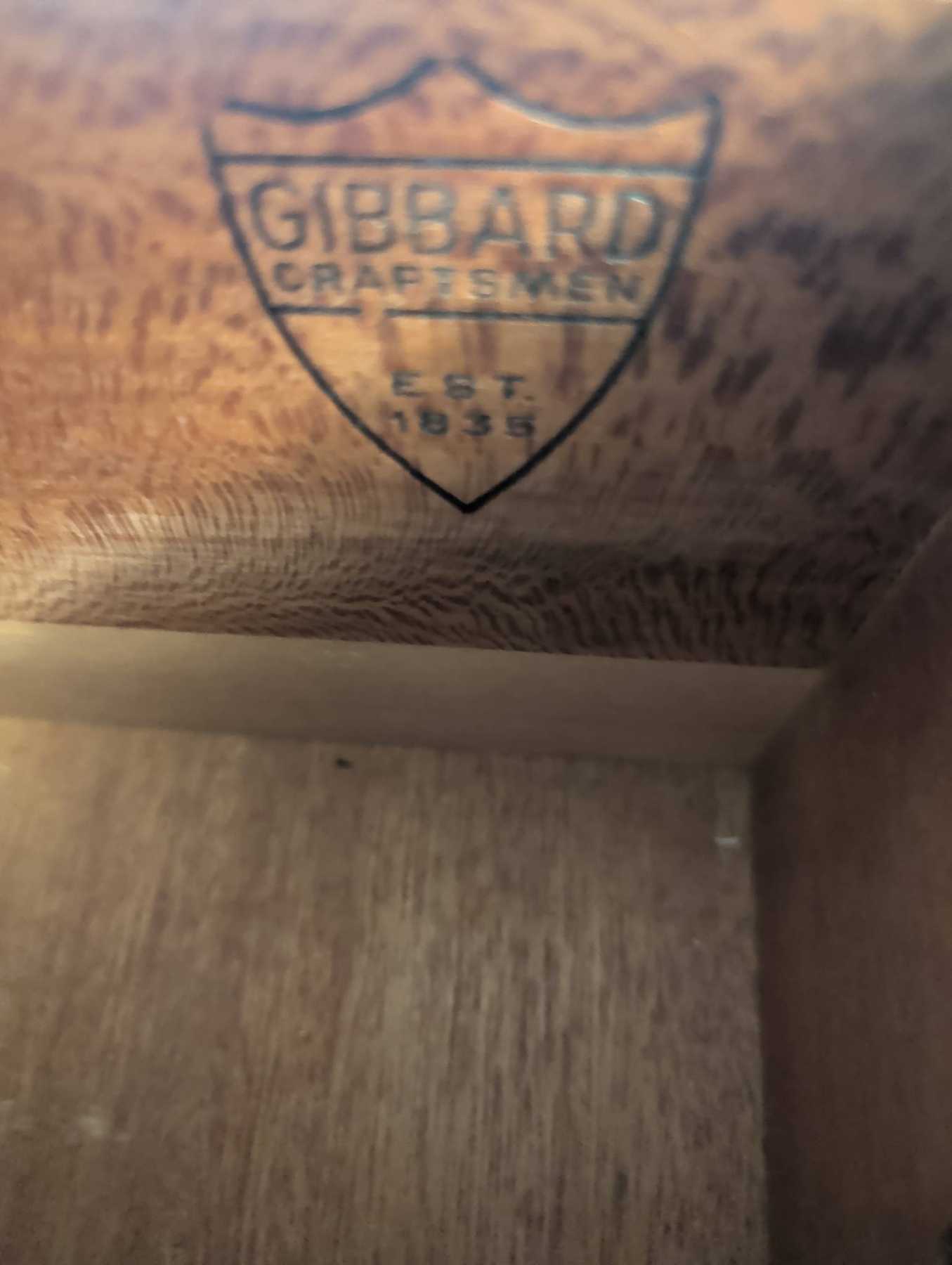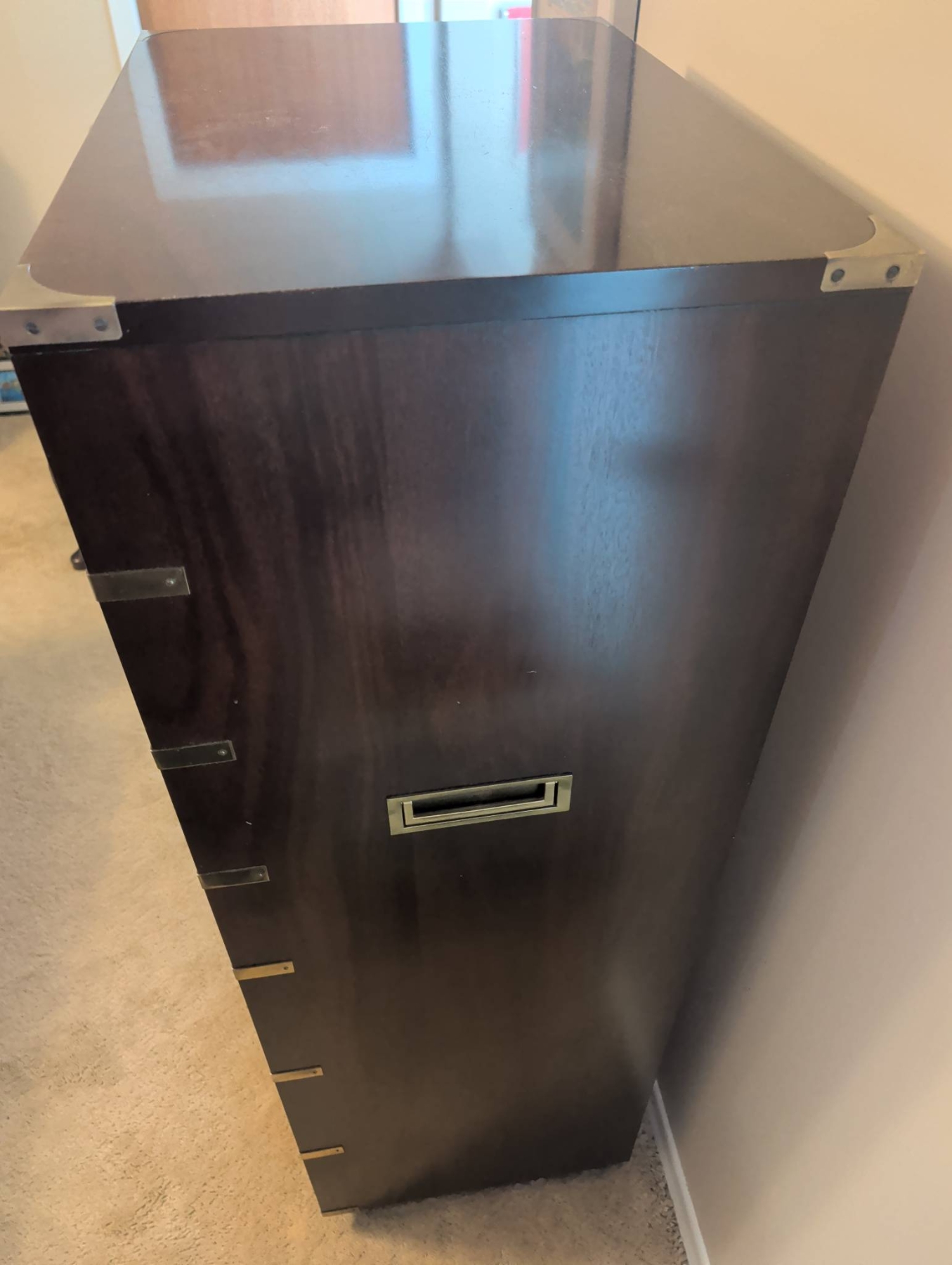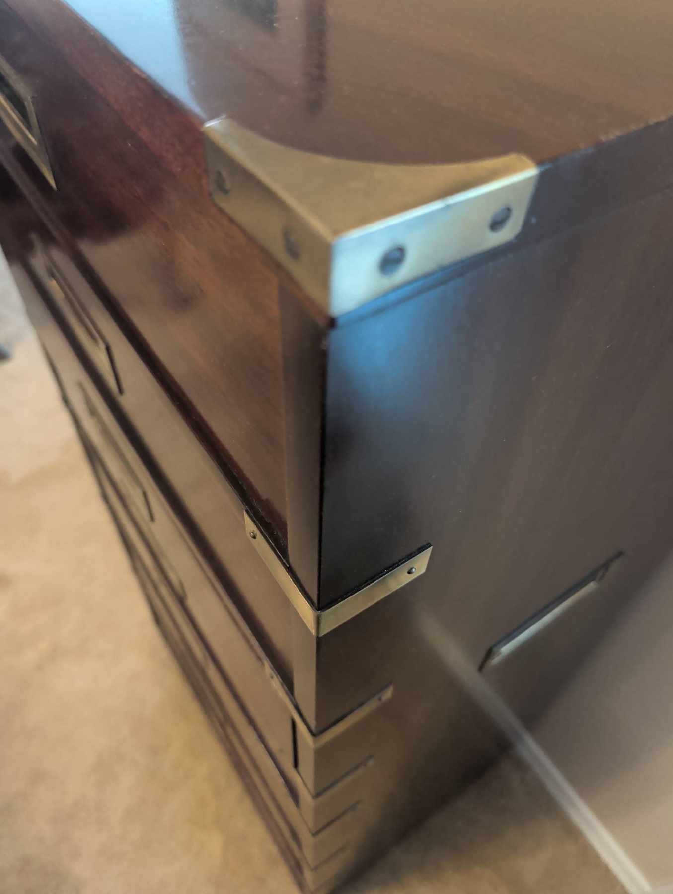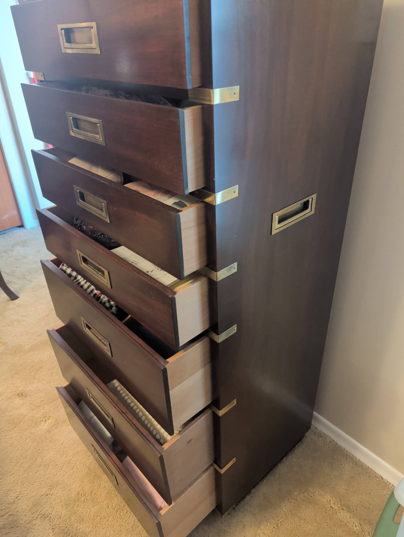 Gibbard Craftsmen seven-drawer tall chest in a campaign-style design, featuring rich wood construction and brass accents, including corner brackets, inset drawer pulls, and side handles. The chest provides ample storage space with its seven smooth-gliding drawers. Dimensions: approximately 55 inches tall, 24 inches wide, and 18 inches deep. A functional and elegant storage solution.