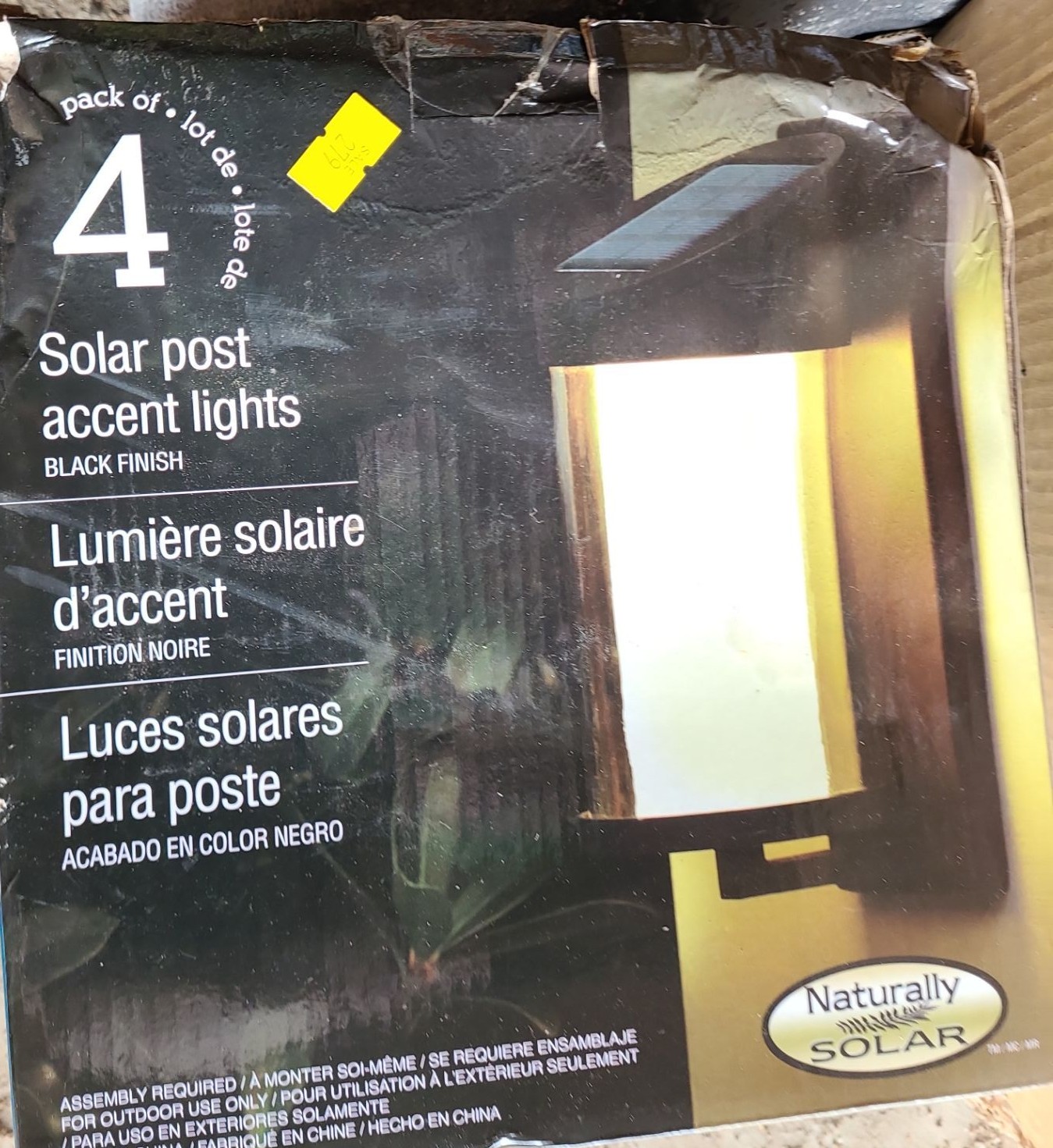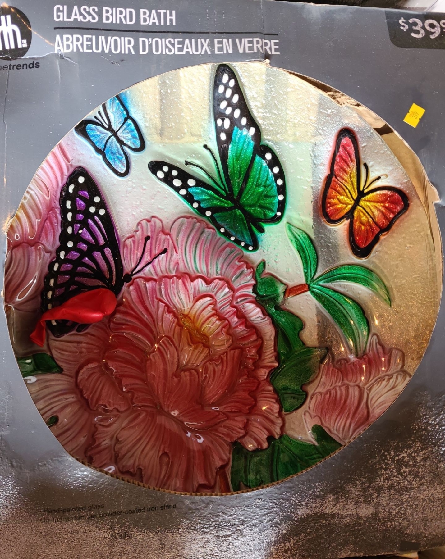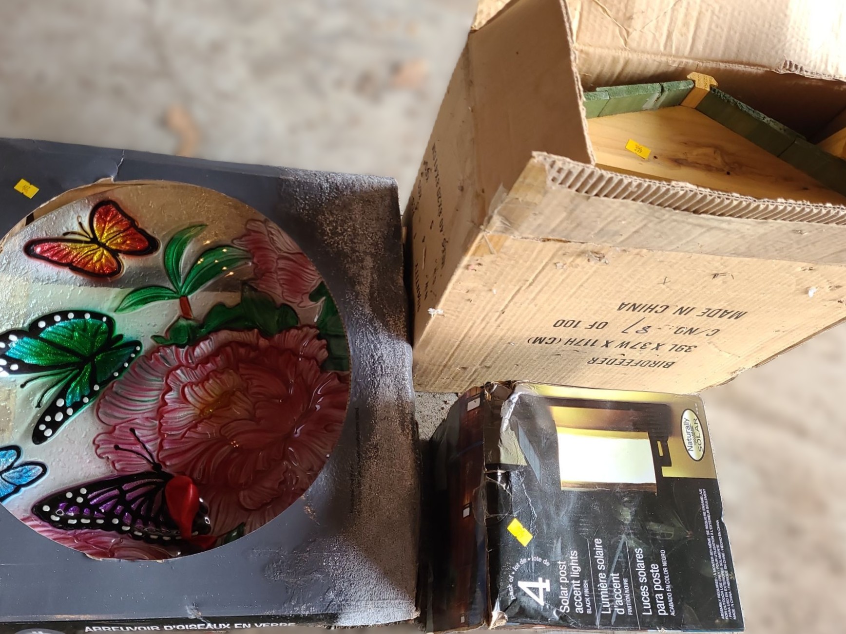 Glass Birdbath, Wooden Birdhouse, Solar Post Accent Lights (New in Boxes/ Boxes Damaged)