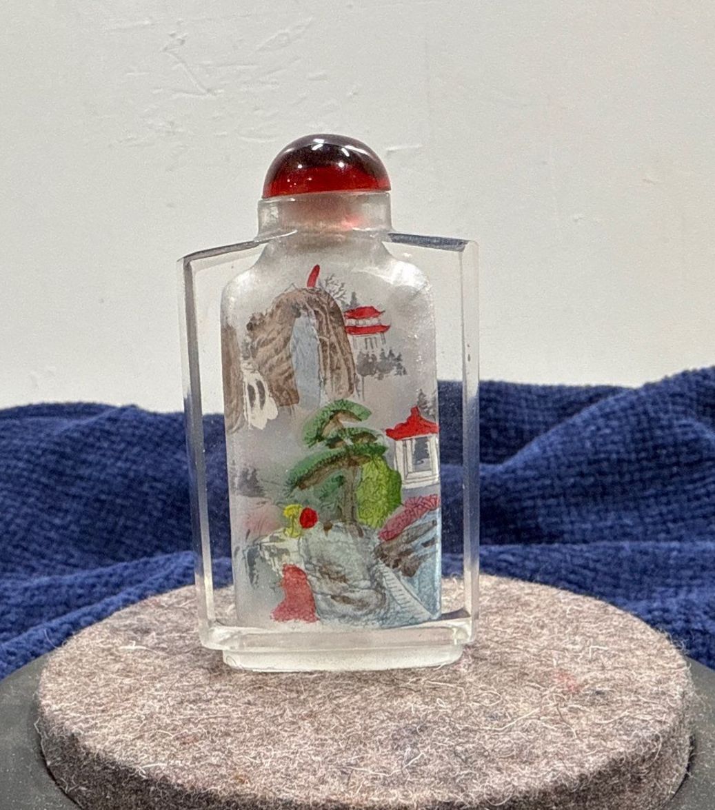 Glass Hand Painted Mountain Village Scene Snuff Bottle 3H