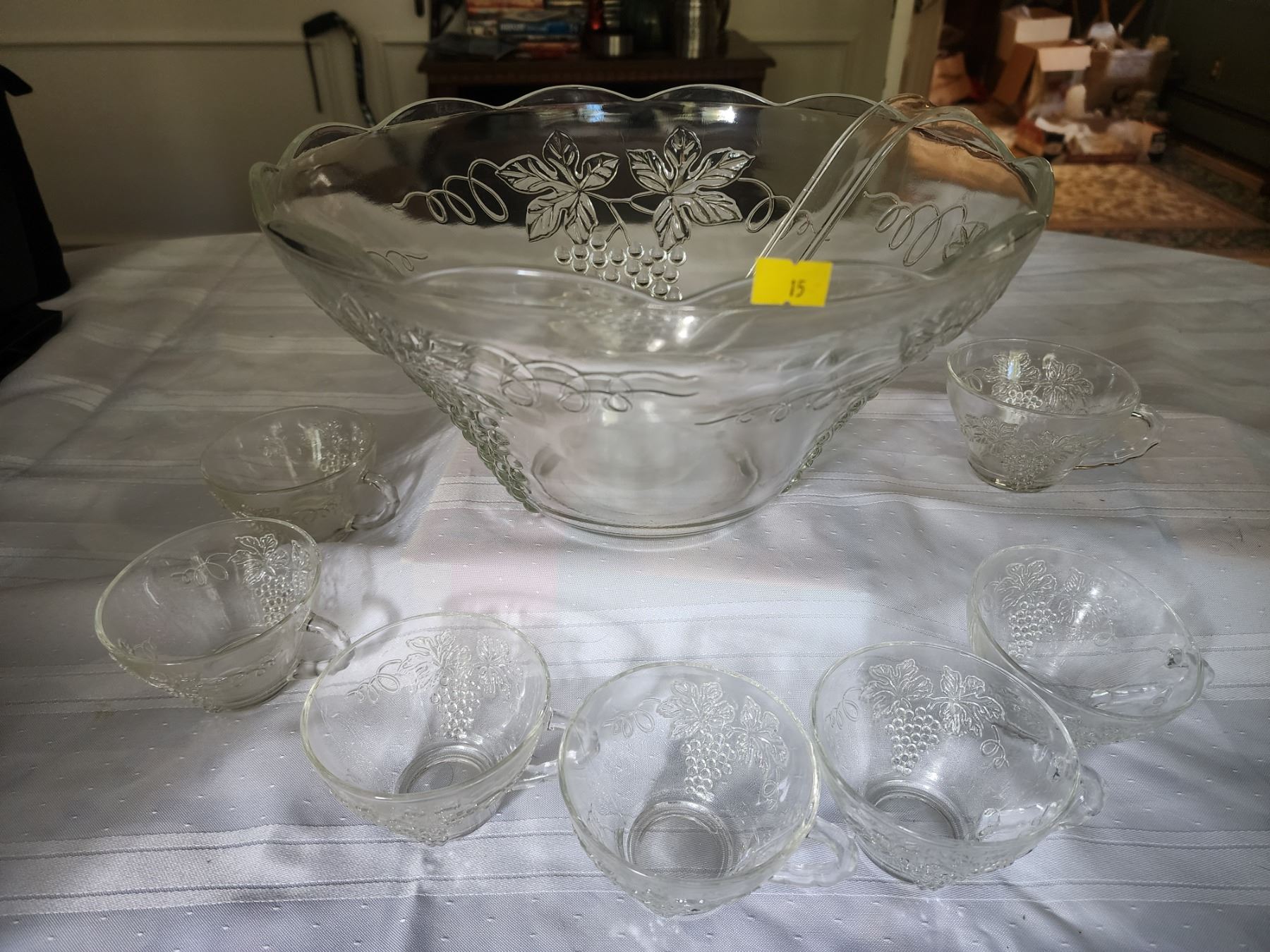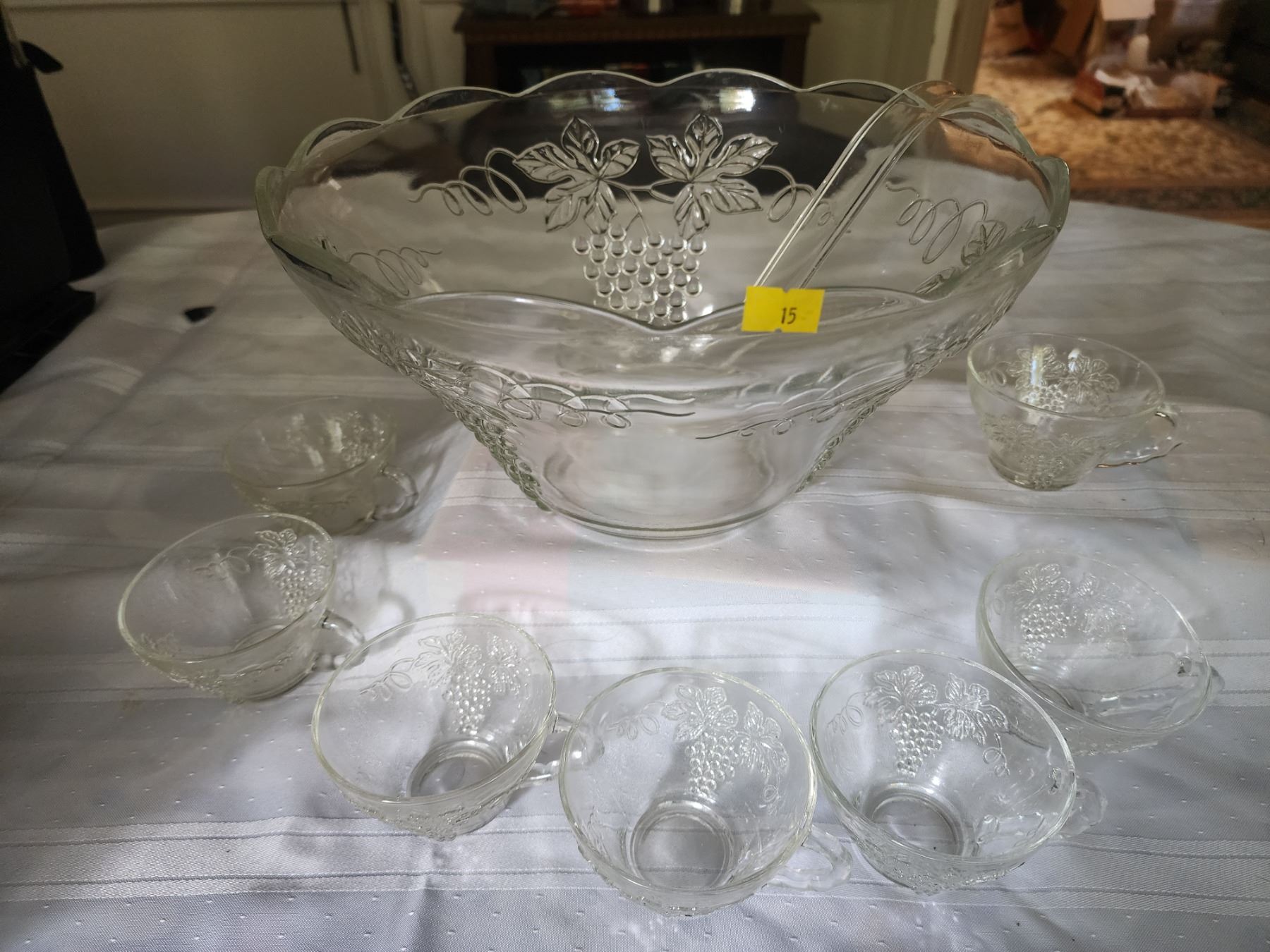 Includes 1 punch bowl, 1 laddel and 12 glass cups