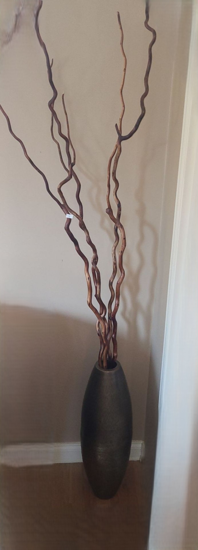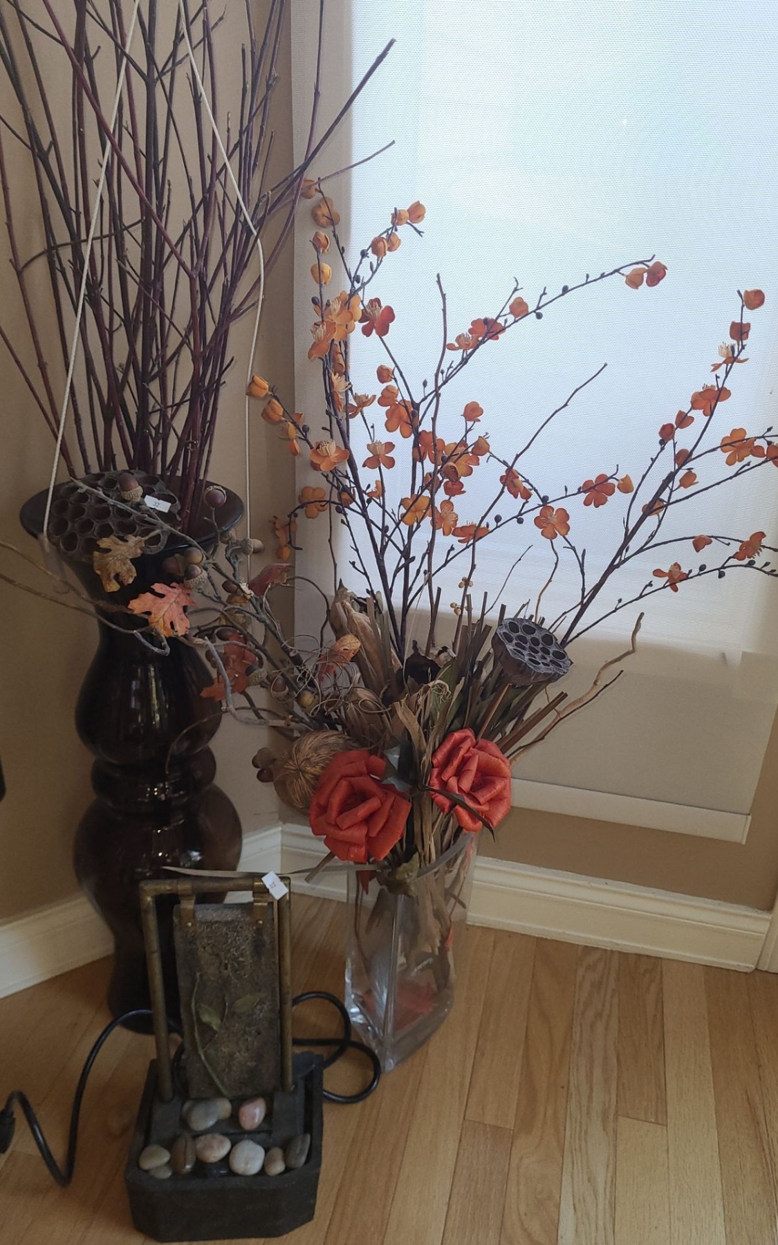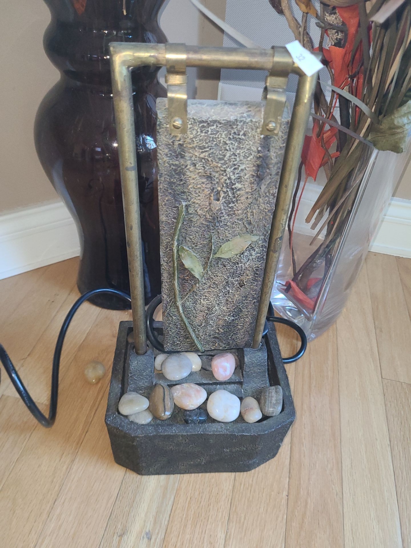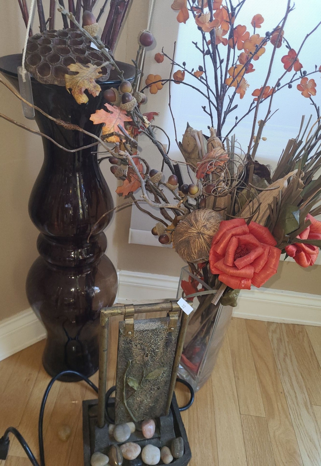 Glass Vases- Tallest: 25.5 T, Tabletop Fountain 7.5 W, 6 D, 16 T, Metal Vase 24 T, Faux Greenery