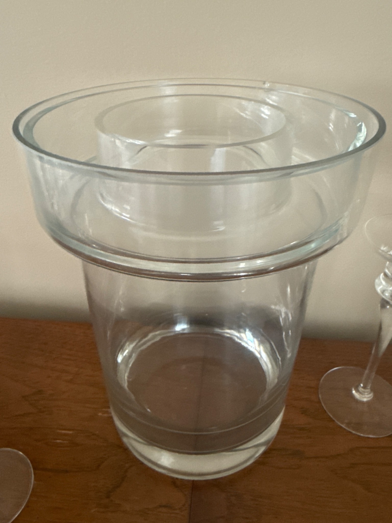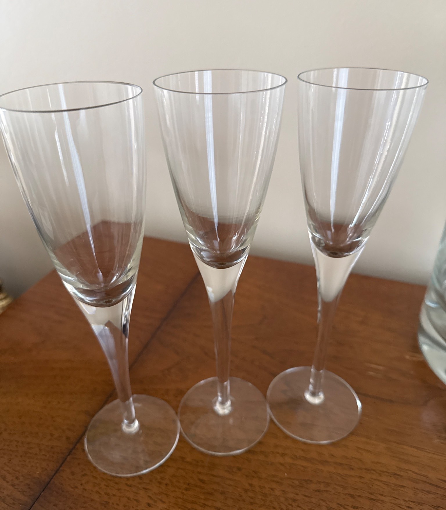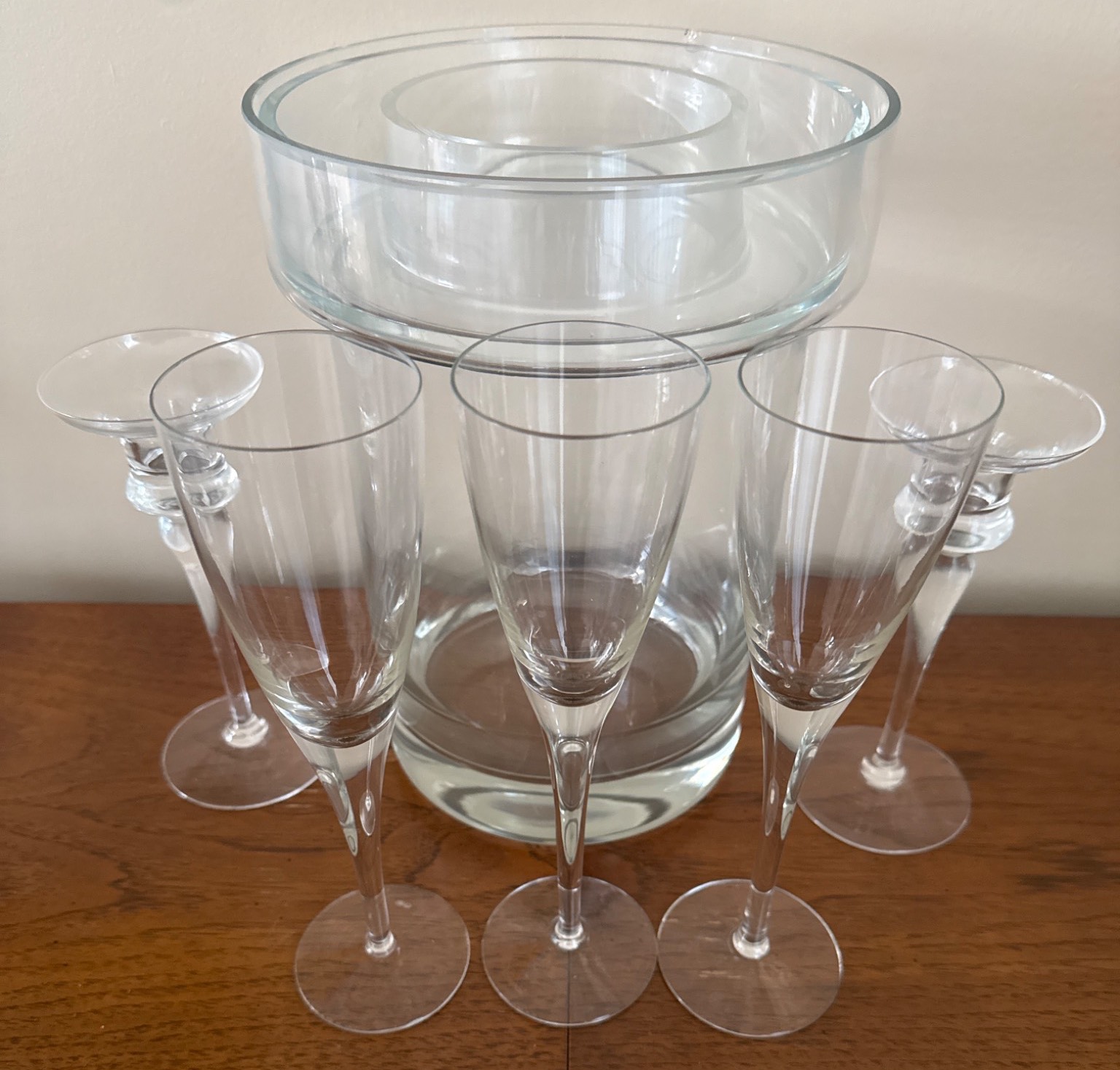 Elegant set featuring a clear glass vase and a pair of matching candle holders, accompanied by six slender champagne flutes. The vase is perfect for floral arrangements, while the delicate candle holders add a refined touch to any decor. All items are glass, with timeless simplicity to suit any setting. Measurement details are not provided for precise dimensions.