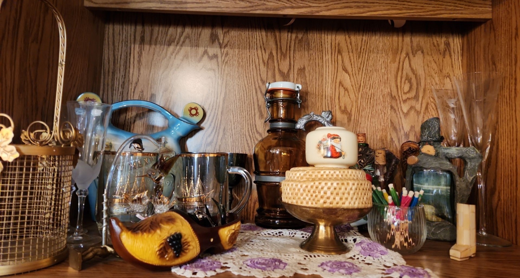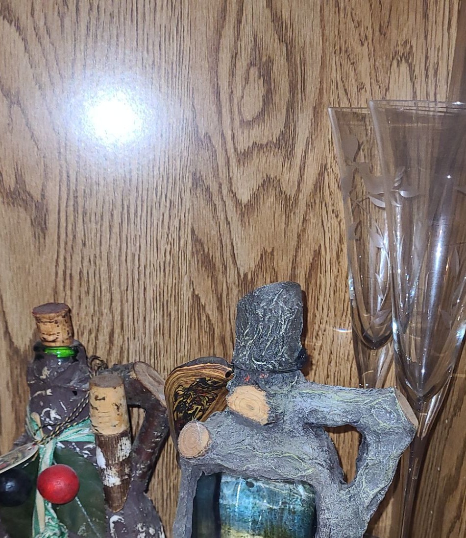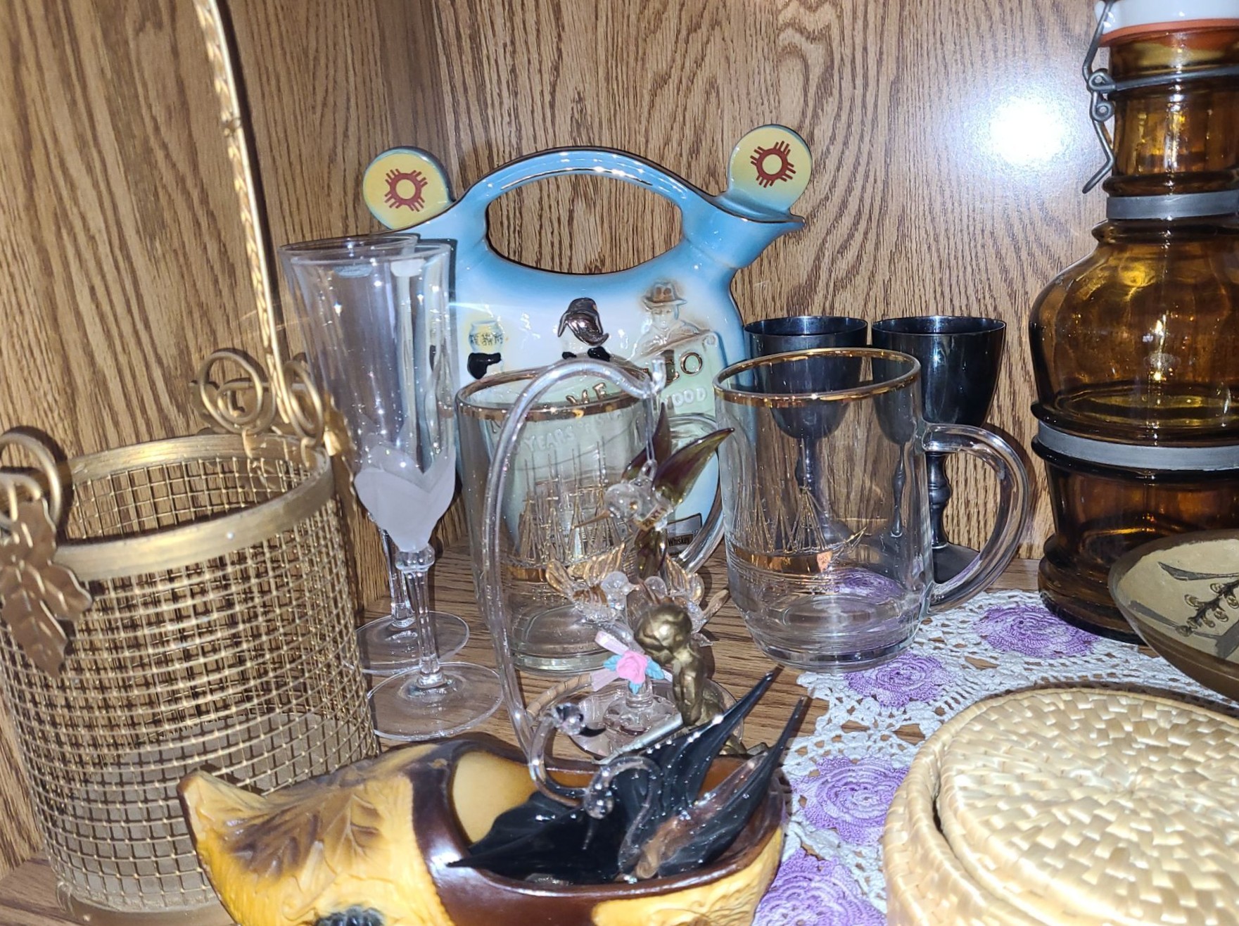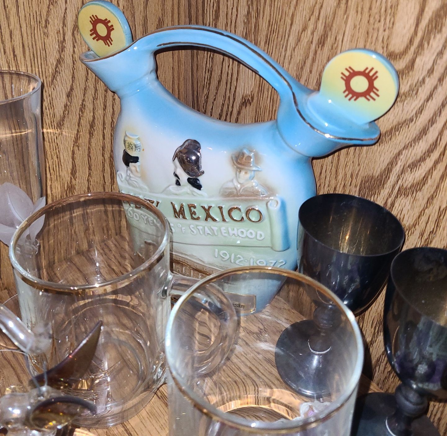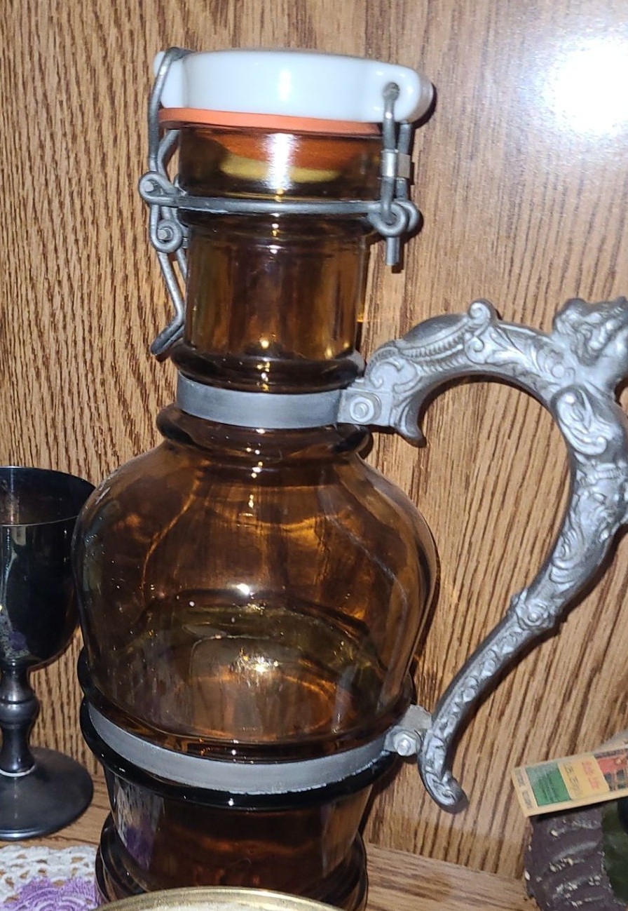 Gold Metal Wire Wine Bottle Holder, Amber Bottle w/ Pewter Handle 11 T, Mugs and More!