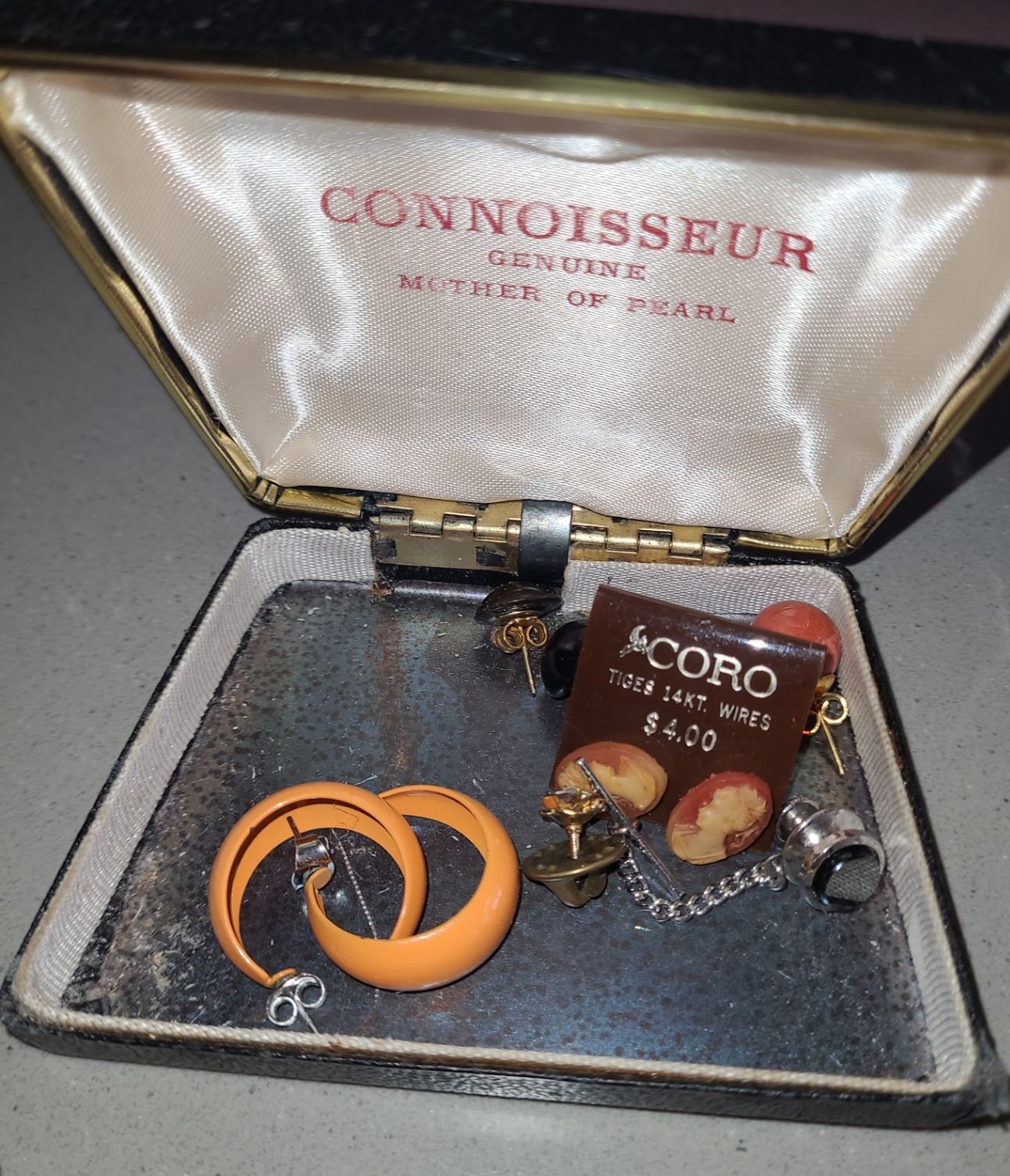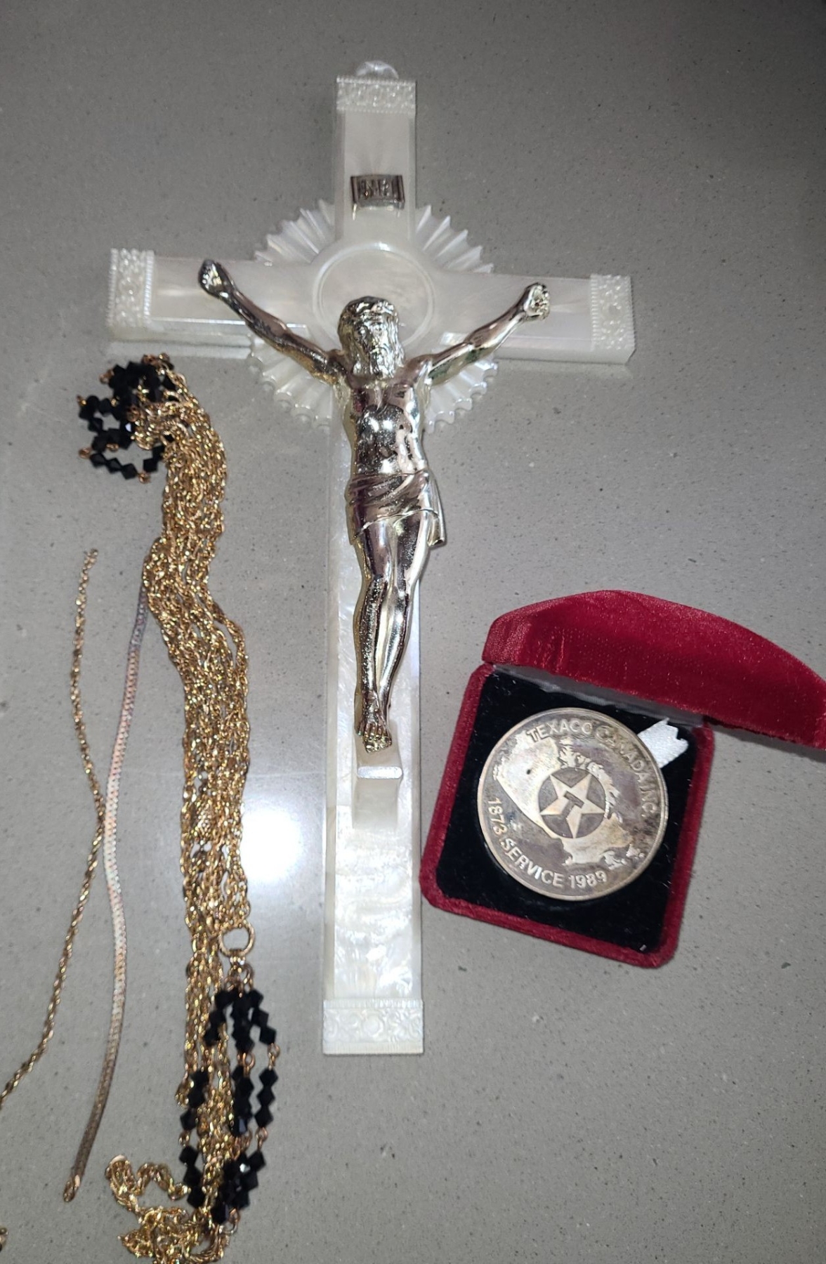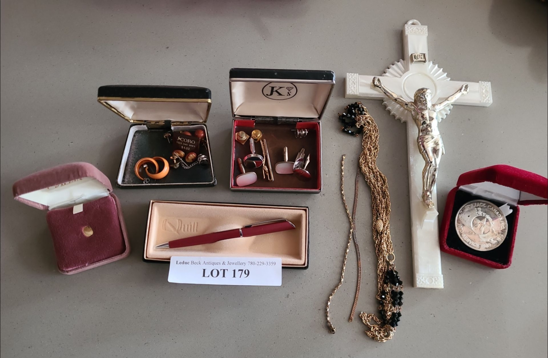 Gold Tie Clip .42g 10k, Texaco Service Coin, Cuff Links, Pen & Crucifix