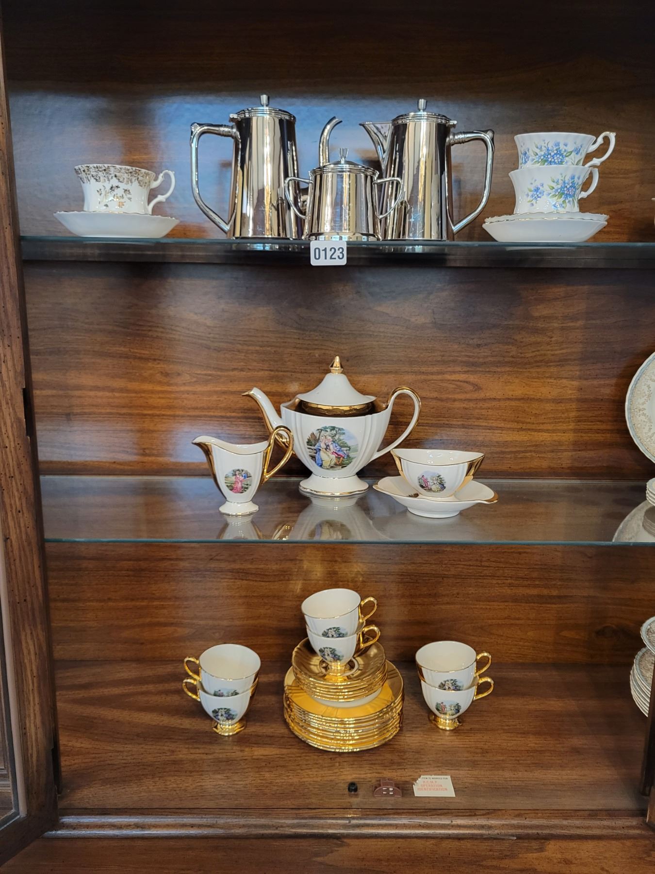 Gold/White Tea Set - "Mom" Cup & Saucer - Silver Colored Tea Pot, Coffee Pot & Sugar Dish