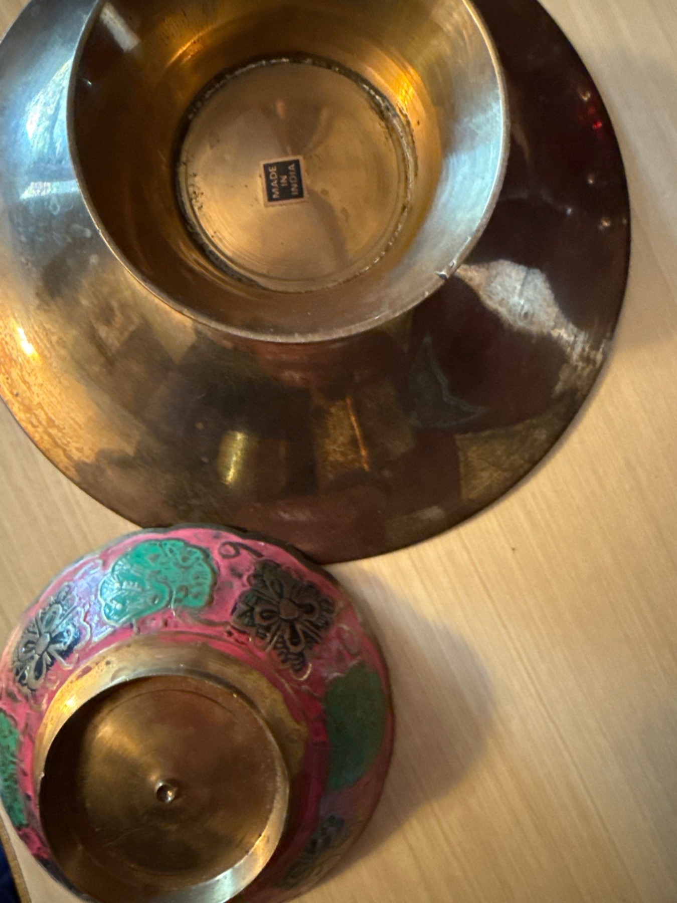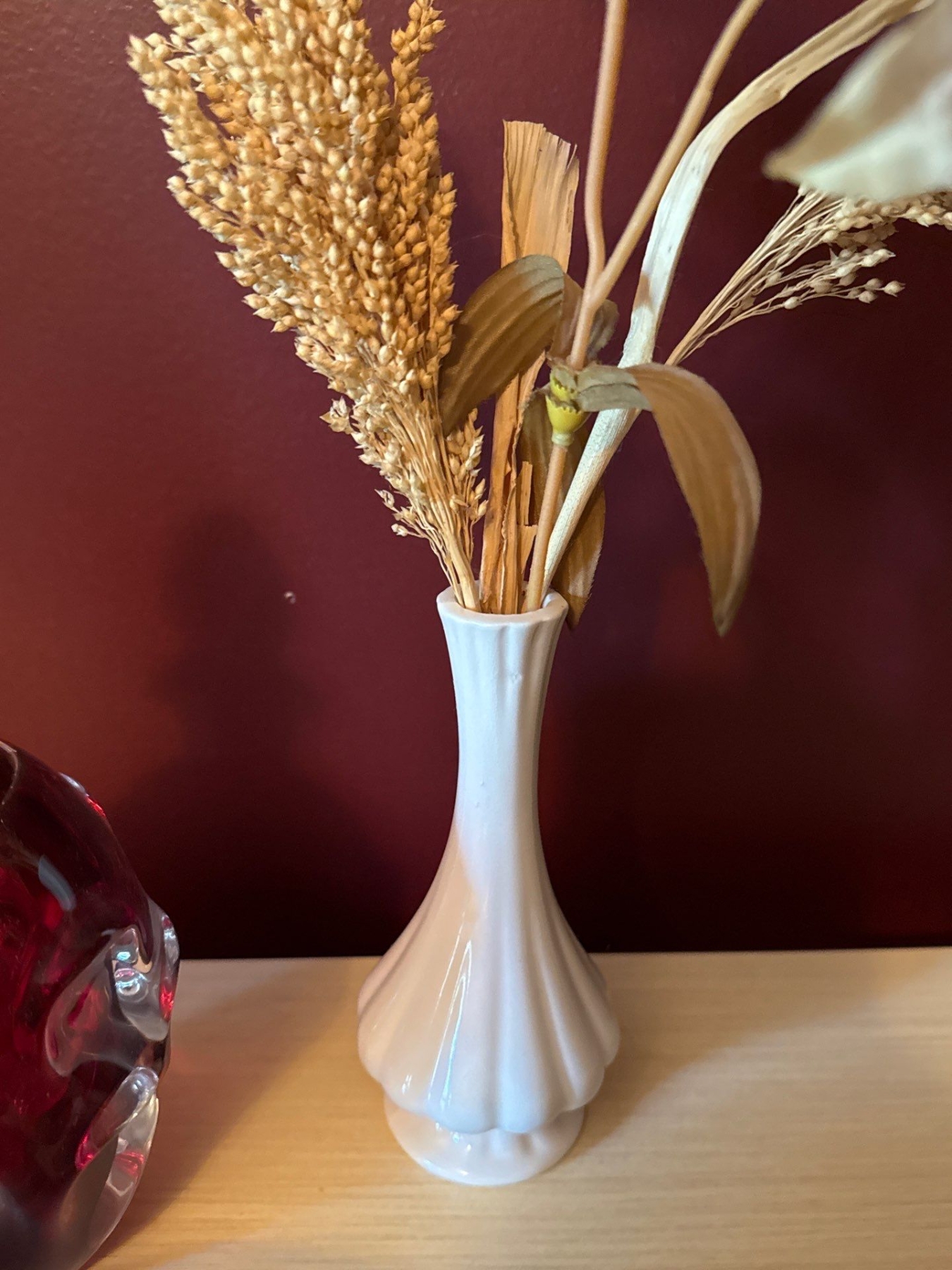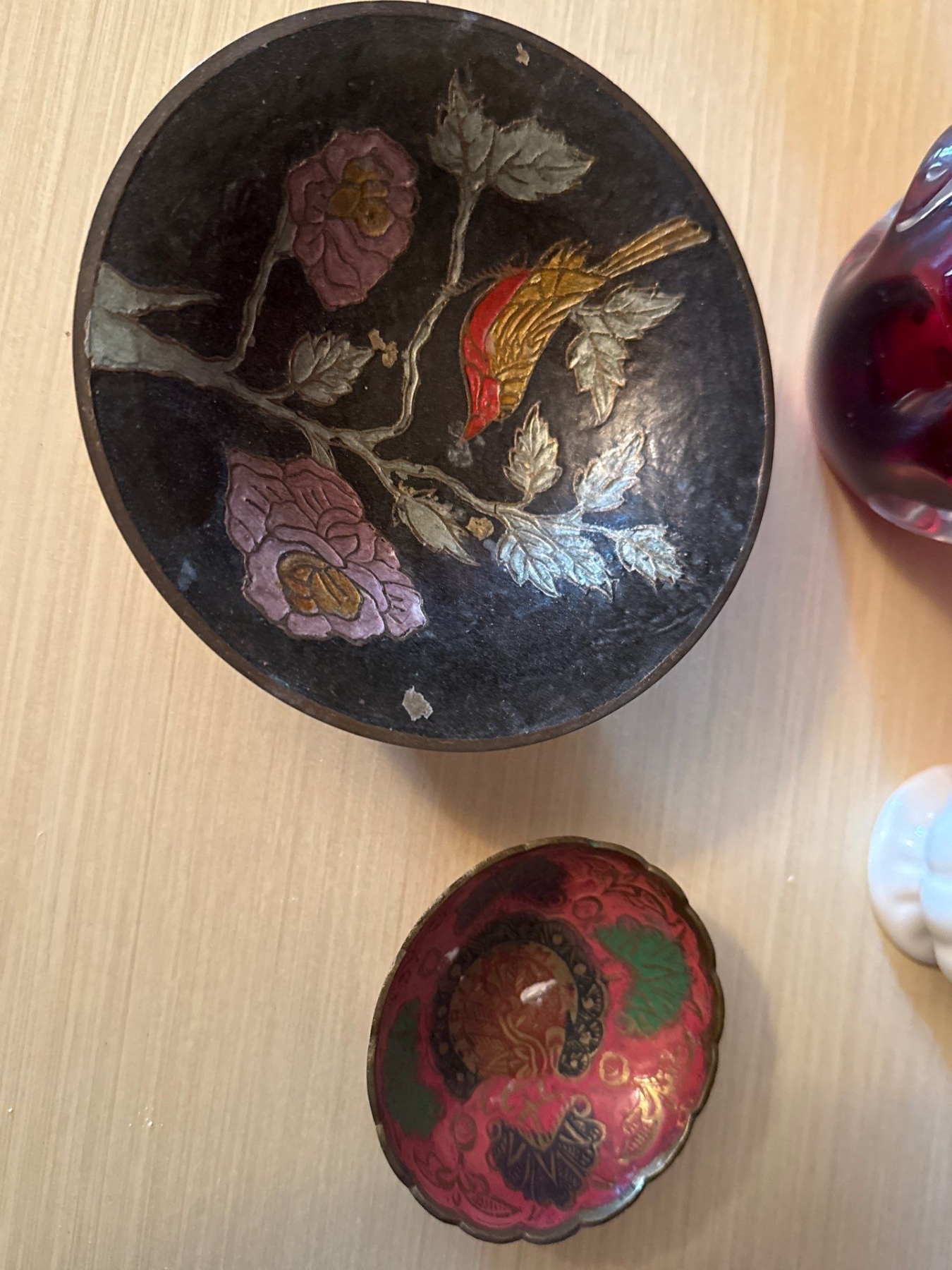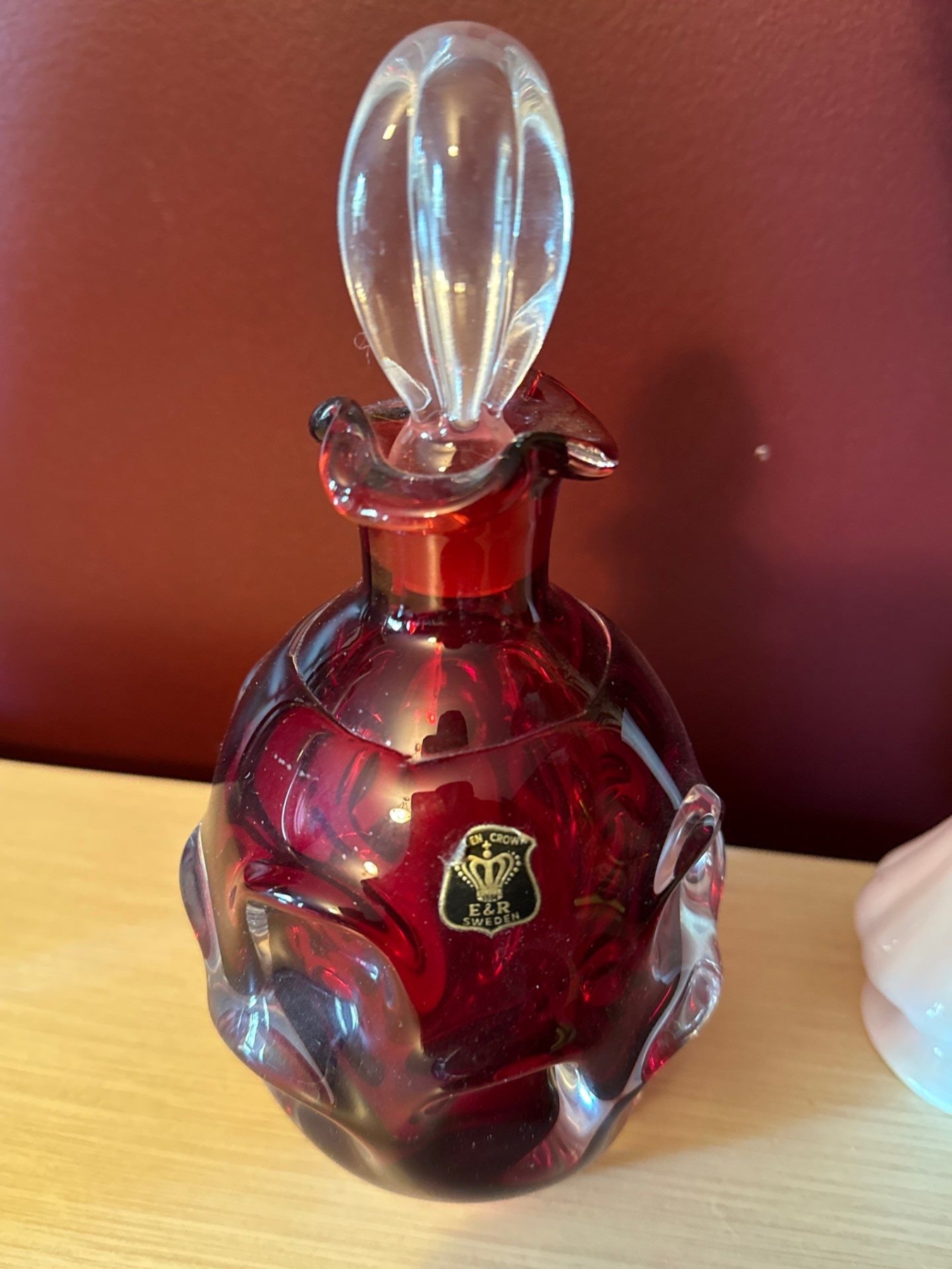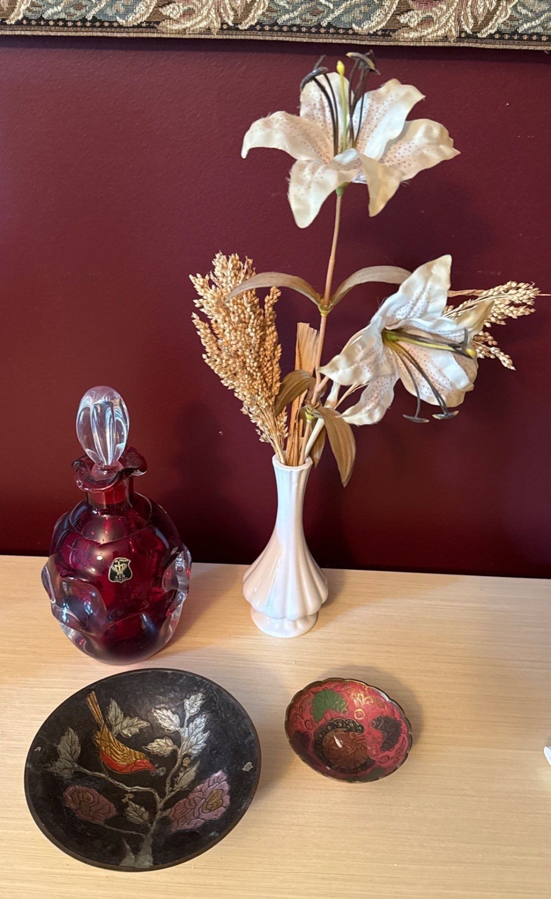 Golden Crown Red Glass Decanter w/ Decorative Brass Plates, White Milk Vase