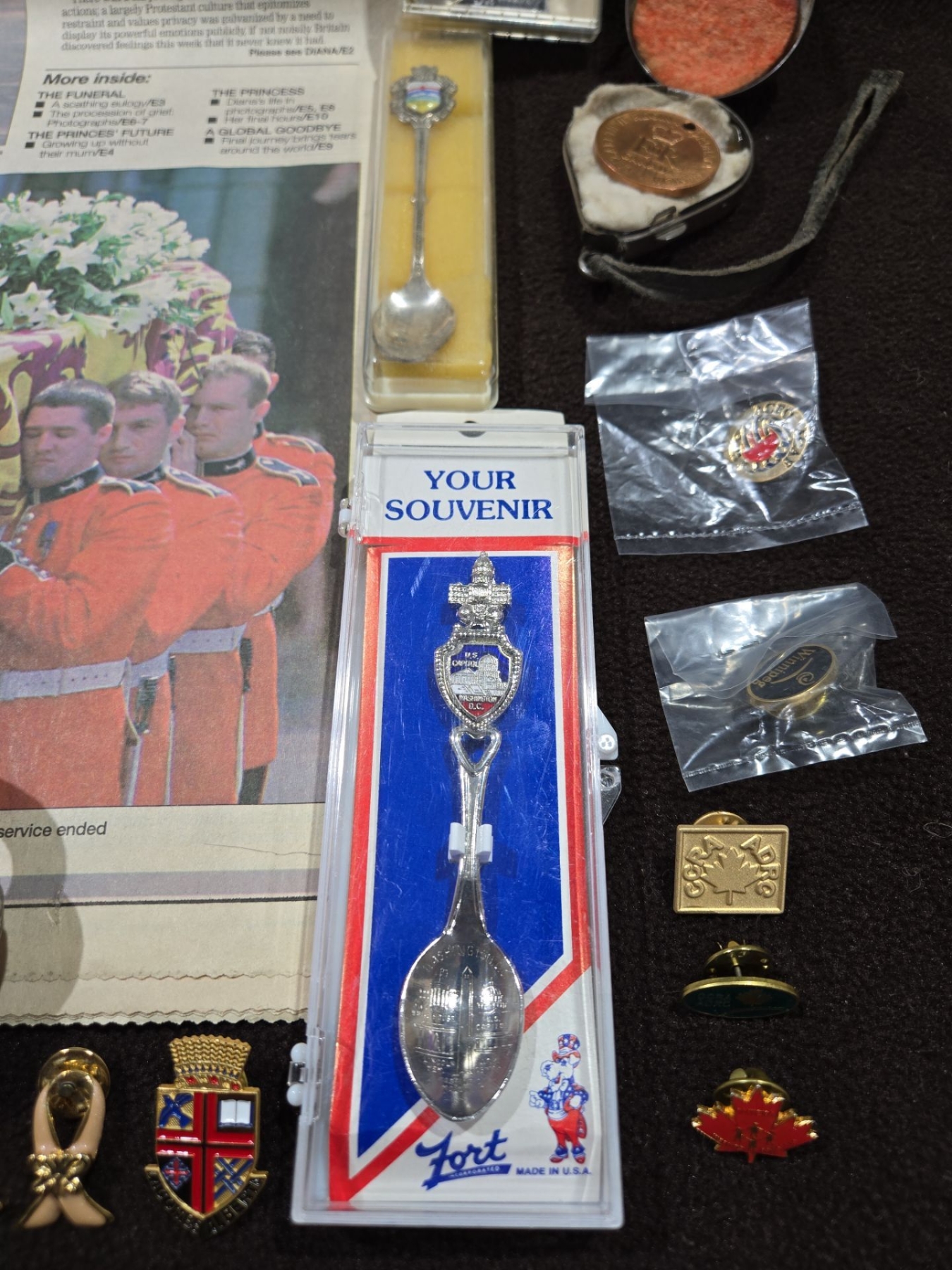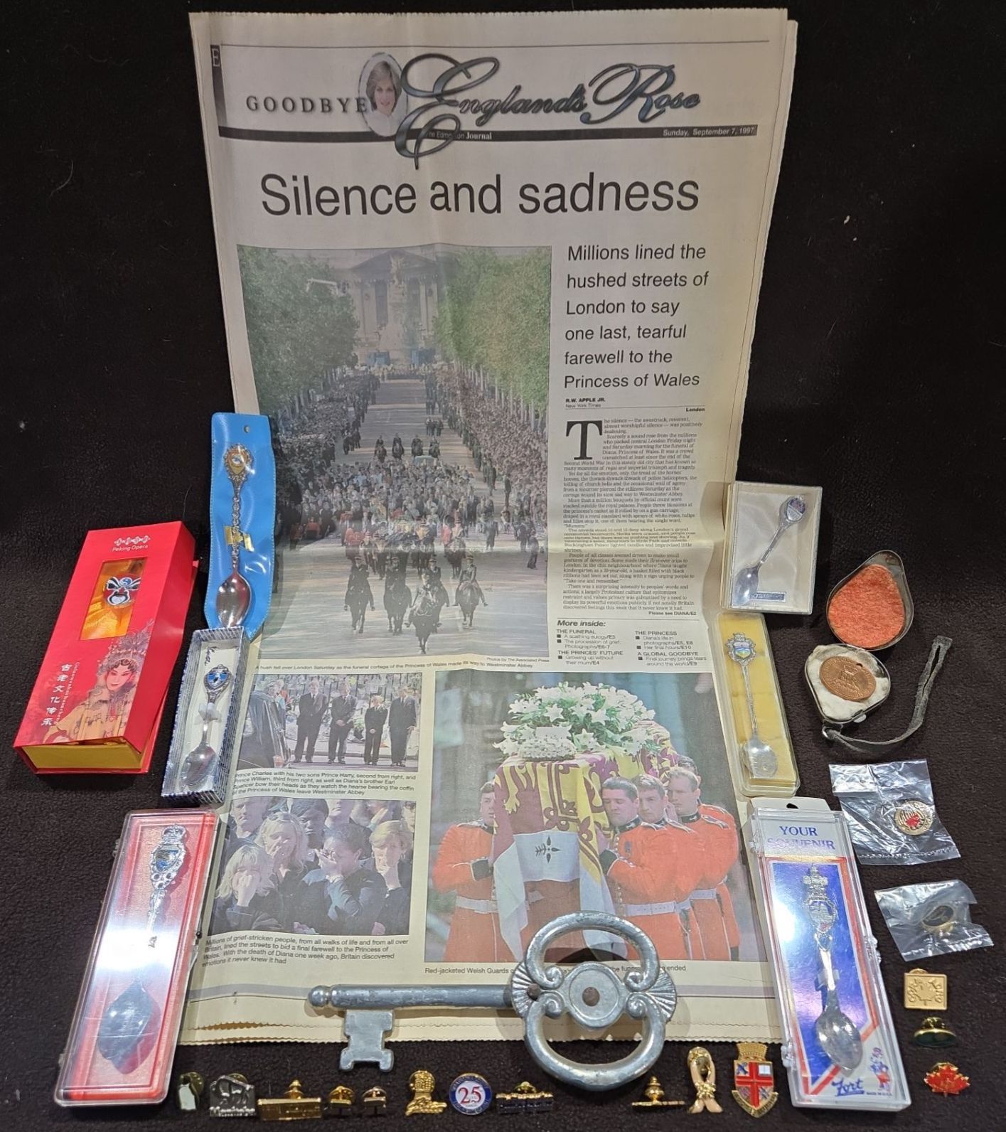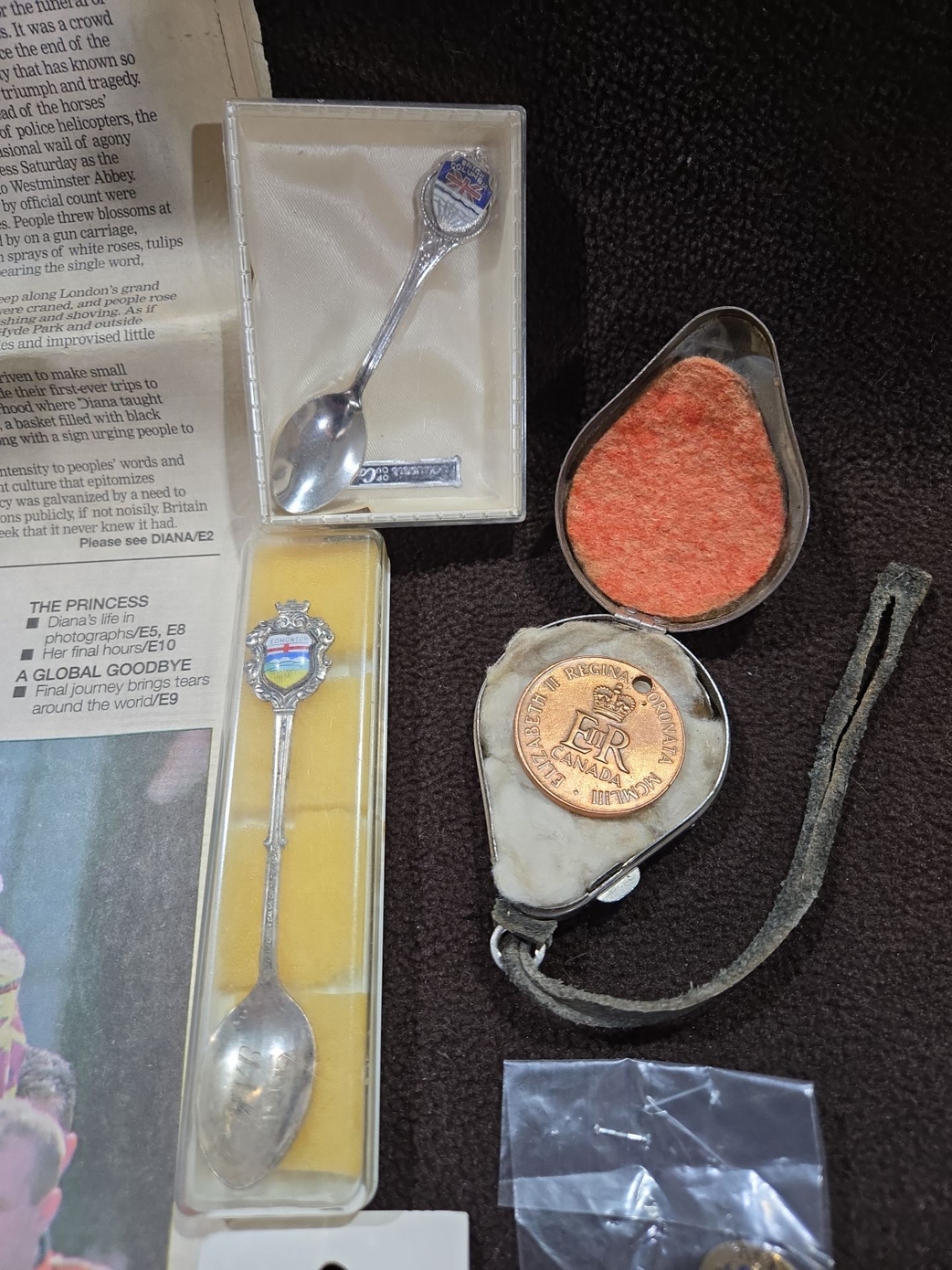 Goodbye England Rose Newspaper Article + Estate pins, Queens Jubilee Copper Coin & More