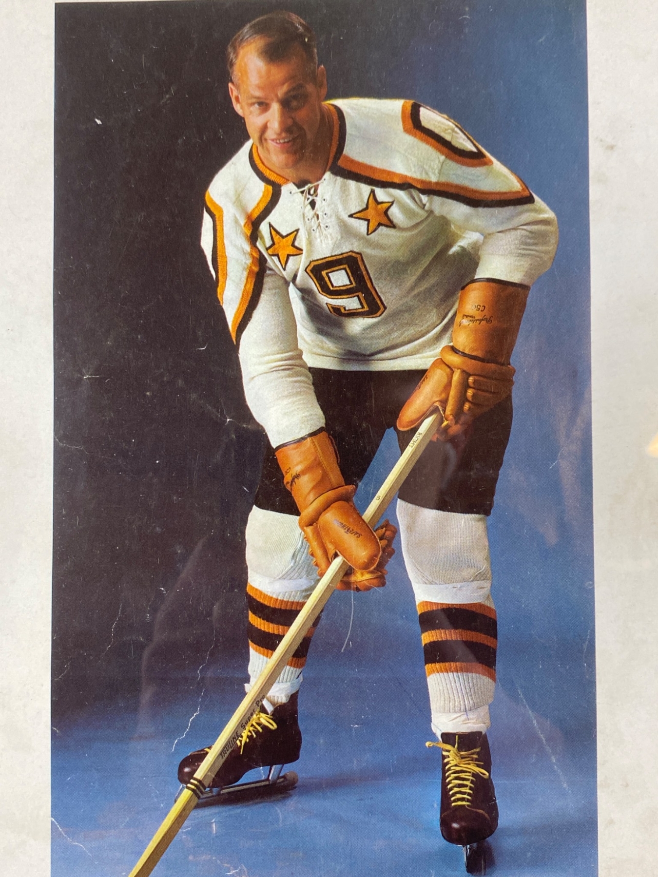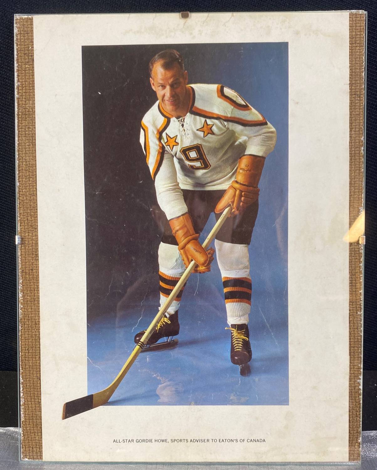 Printed wall display featuring legendary hockey player Gordie Howe in his All-Star uniform, noted as the 'Sports Adviser to Eaton's of Canada.' Mounted on a wooden backing and secured with metal clips, this collectible is perfect for hockey enthusiasts and Gordie Howe fans. Shows some signs of wear and aging, adding vintage character.