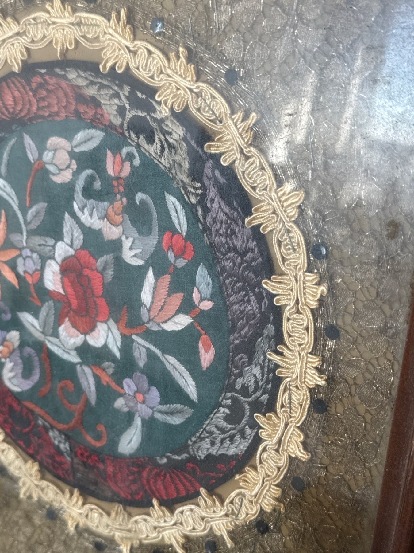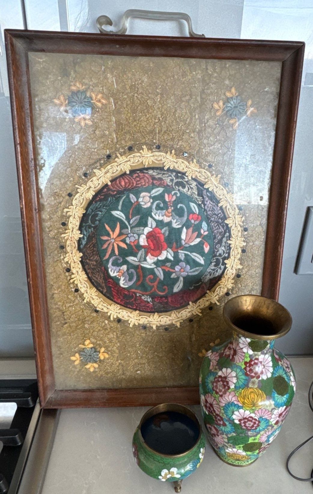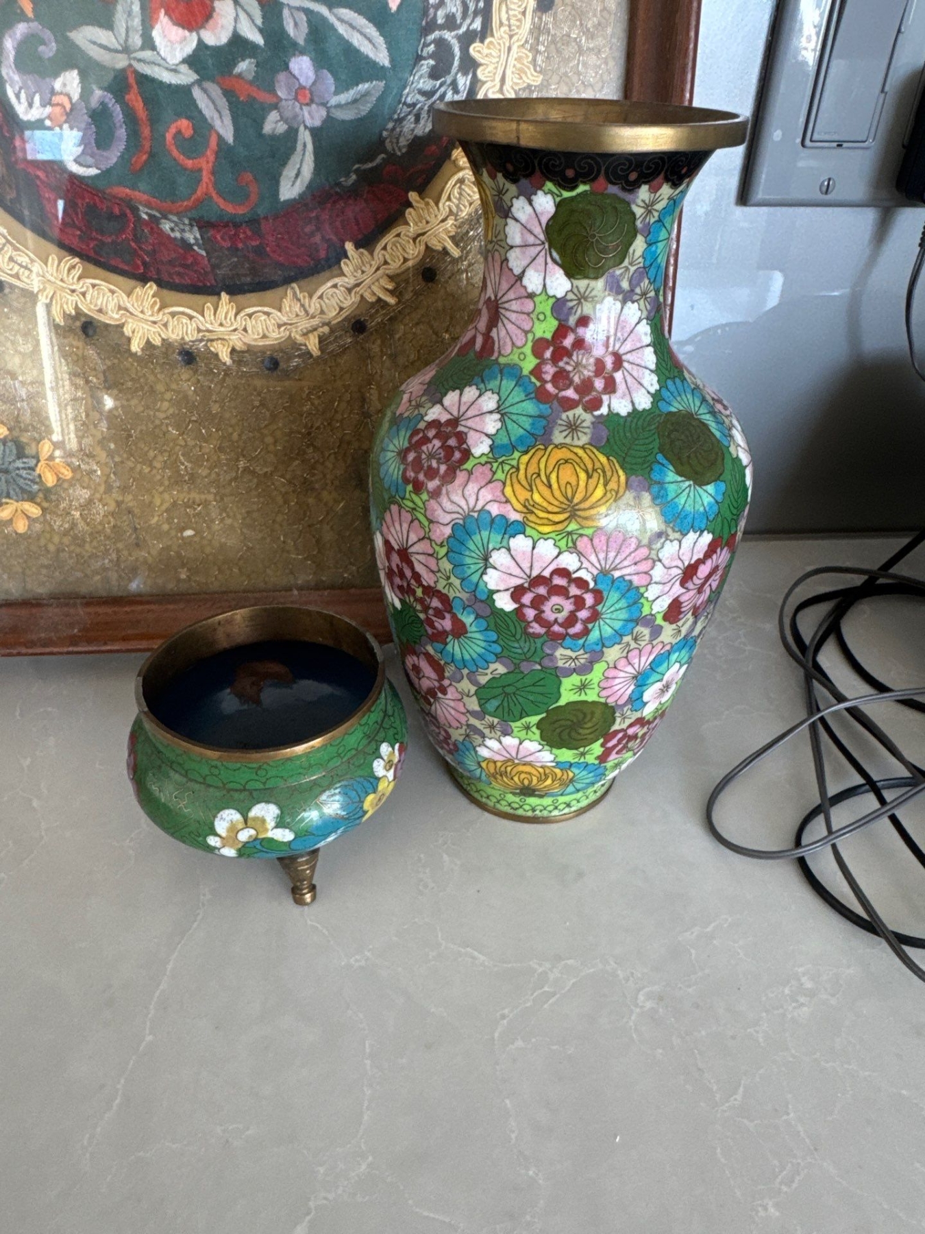Gorgeous Cloisonne Vase & Footed Candy Dish w/ Asian Needlecraft Wall Emblem 16L
