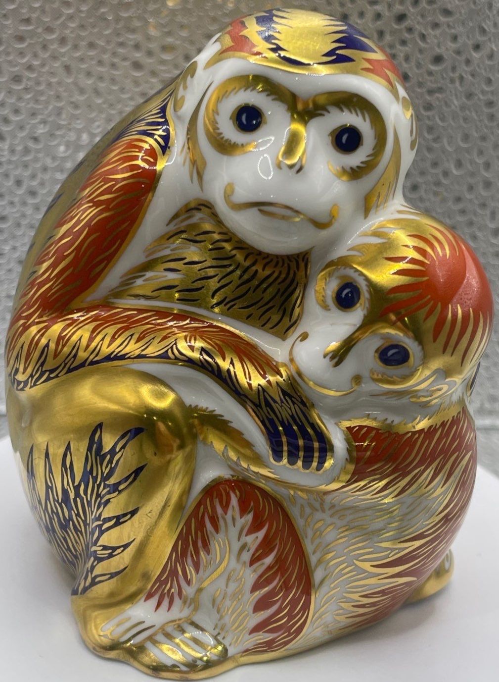 Gorgeous English Royal Crown Derby Bone China Persian Momma & Baby Monkey Figurine - 4In Tall