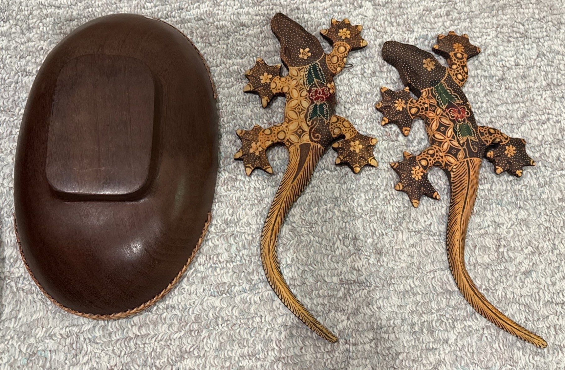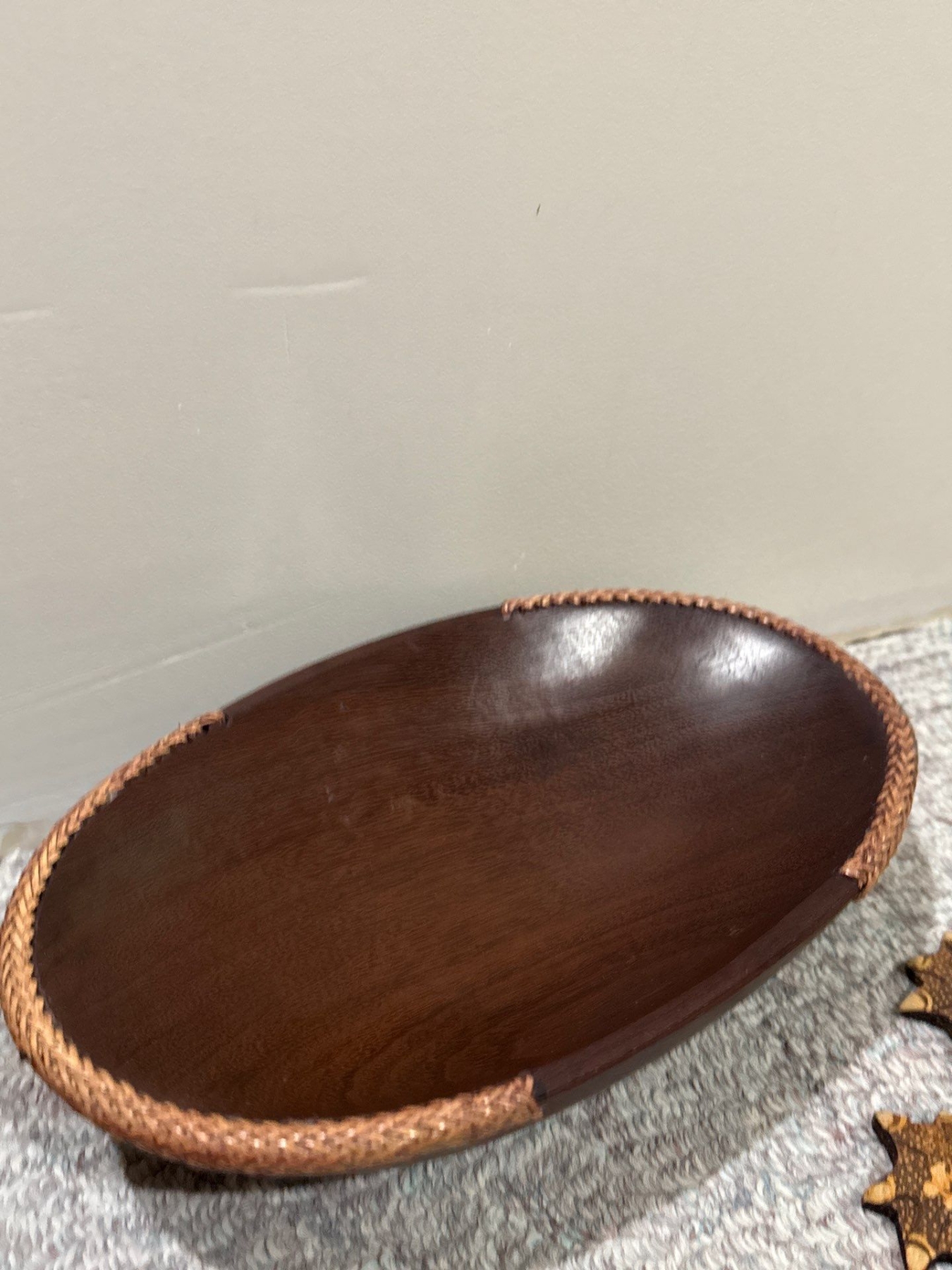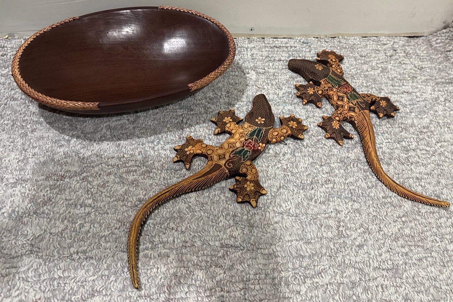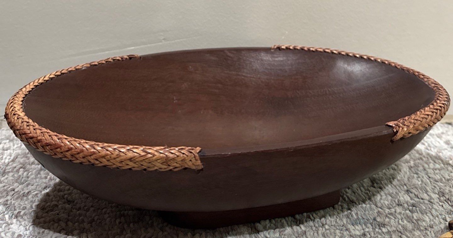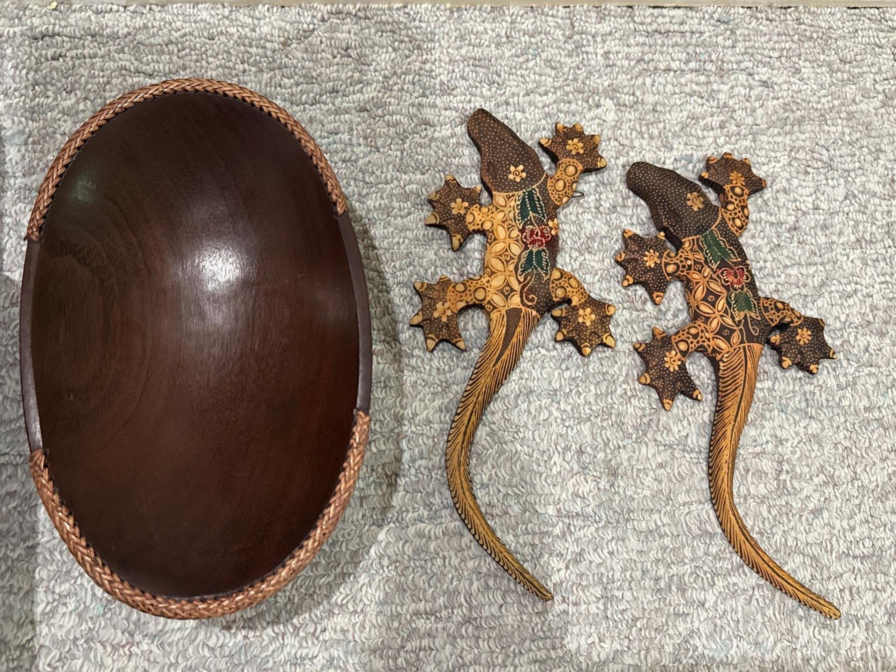 Gorgeous Ironwood Tribal Bowl, Wicker Rim, Borneo - 10.5L w/ Malaysian Hand Painted Lizards