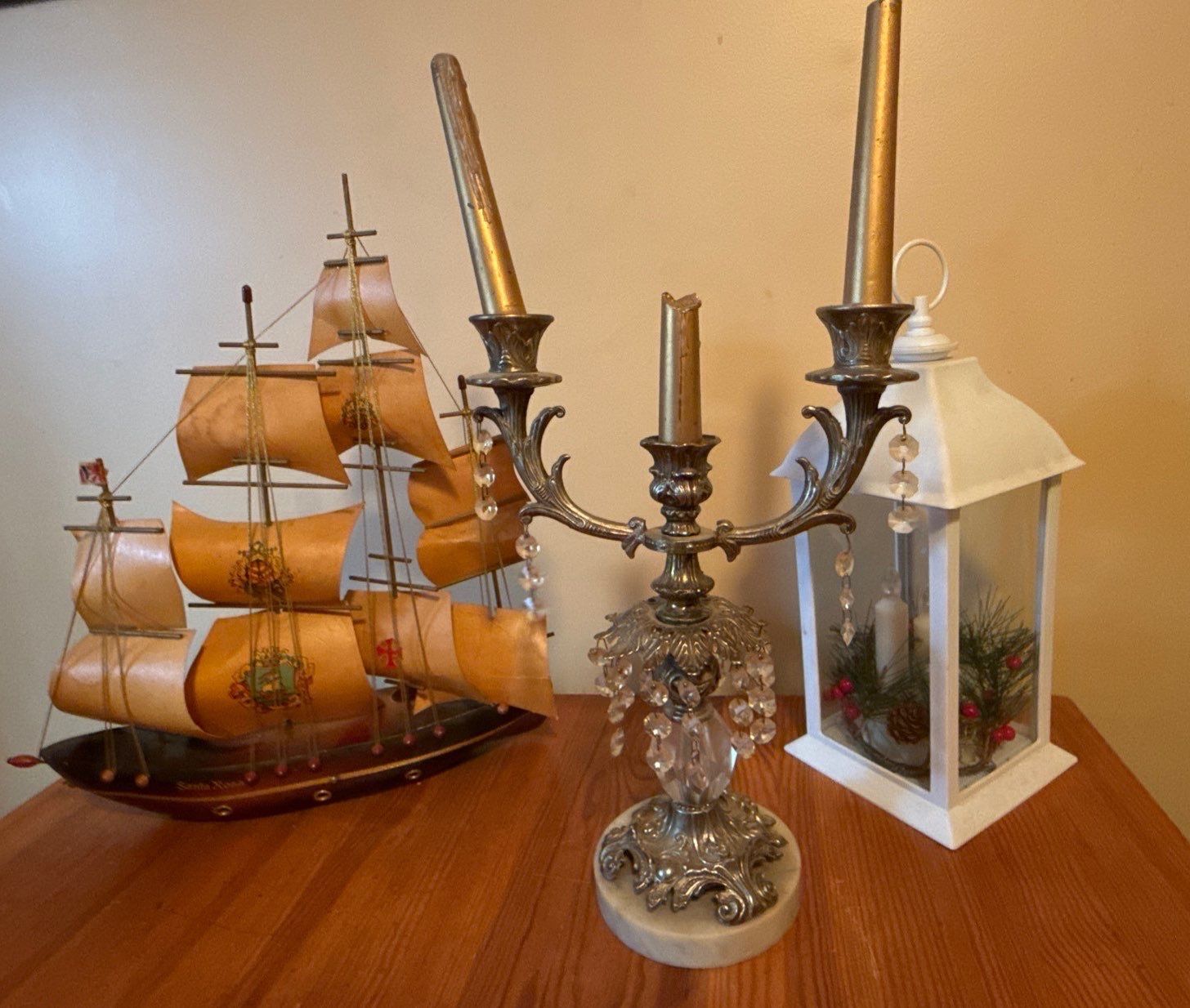 Gorgeous Metal Candelabra w/  Marble Base, Electric Lantern and Lovely Decorative Ship (As Is)